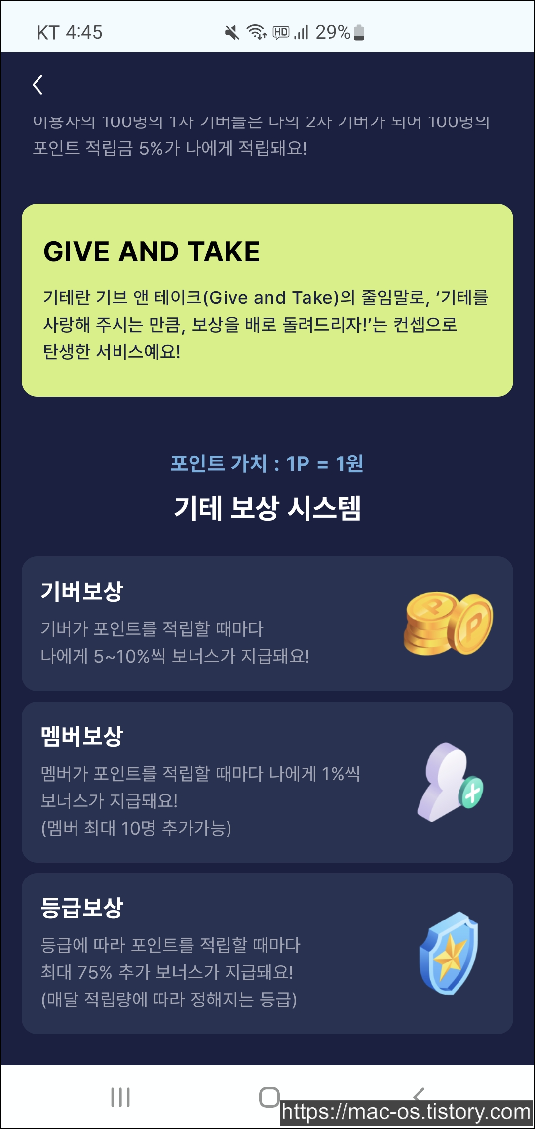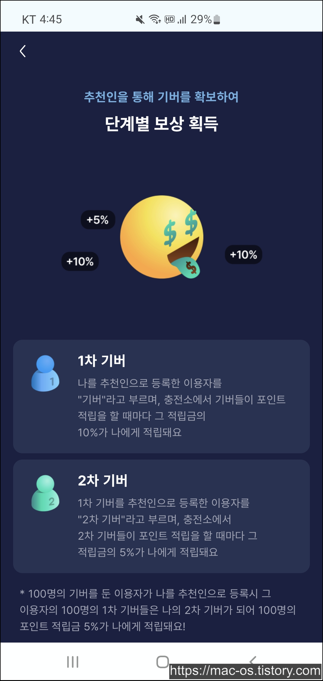 기테의 친구초대 기능이다. 내가 초대한 사람은 1차 기버, 1차 기버가 초대한 사람은 2차 기버가 된다. 1차 기버가 충전소에서 100원을 벌면 나는 10원을 벌고, 2차 기버가 100원을 벌면 나는 5원을 벌게 된다. 기버는 앞서 소개한 멤버와 다른 기능이므로 오해하지 말자.