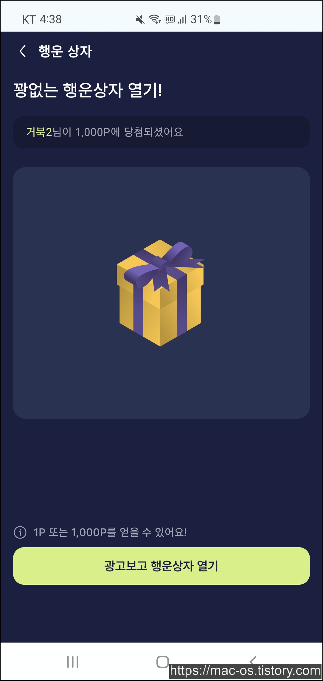 광고보고 행운상자는 30분마다 광고보고 행운상자를 여는 미션이다. 1포인트 또는 1000포인트가 나오고, 30분마다 한 번씩 총 3번을 하면 미션이 완료된다.