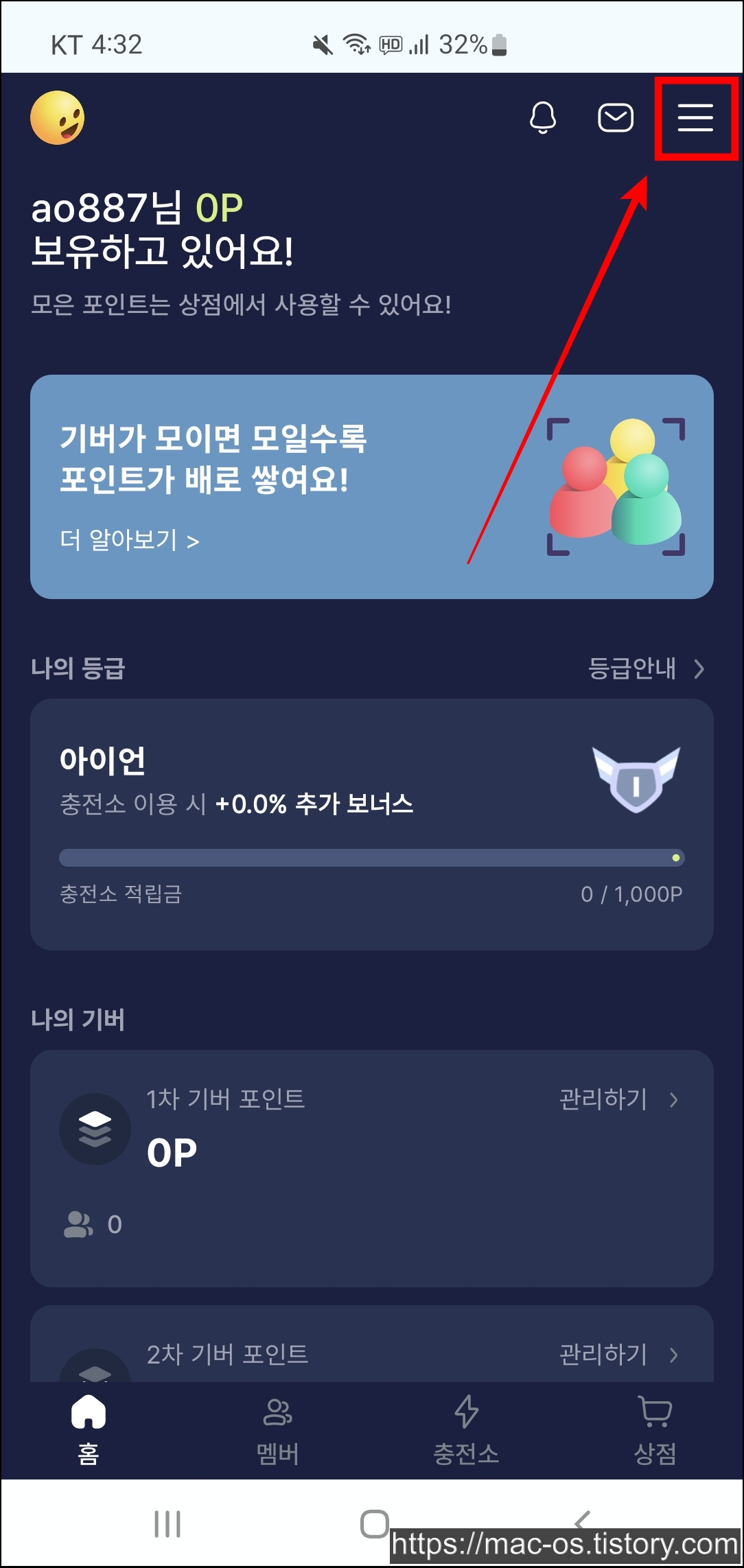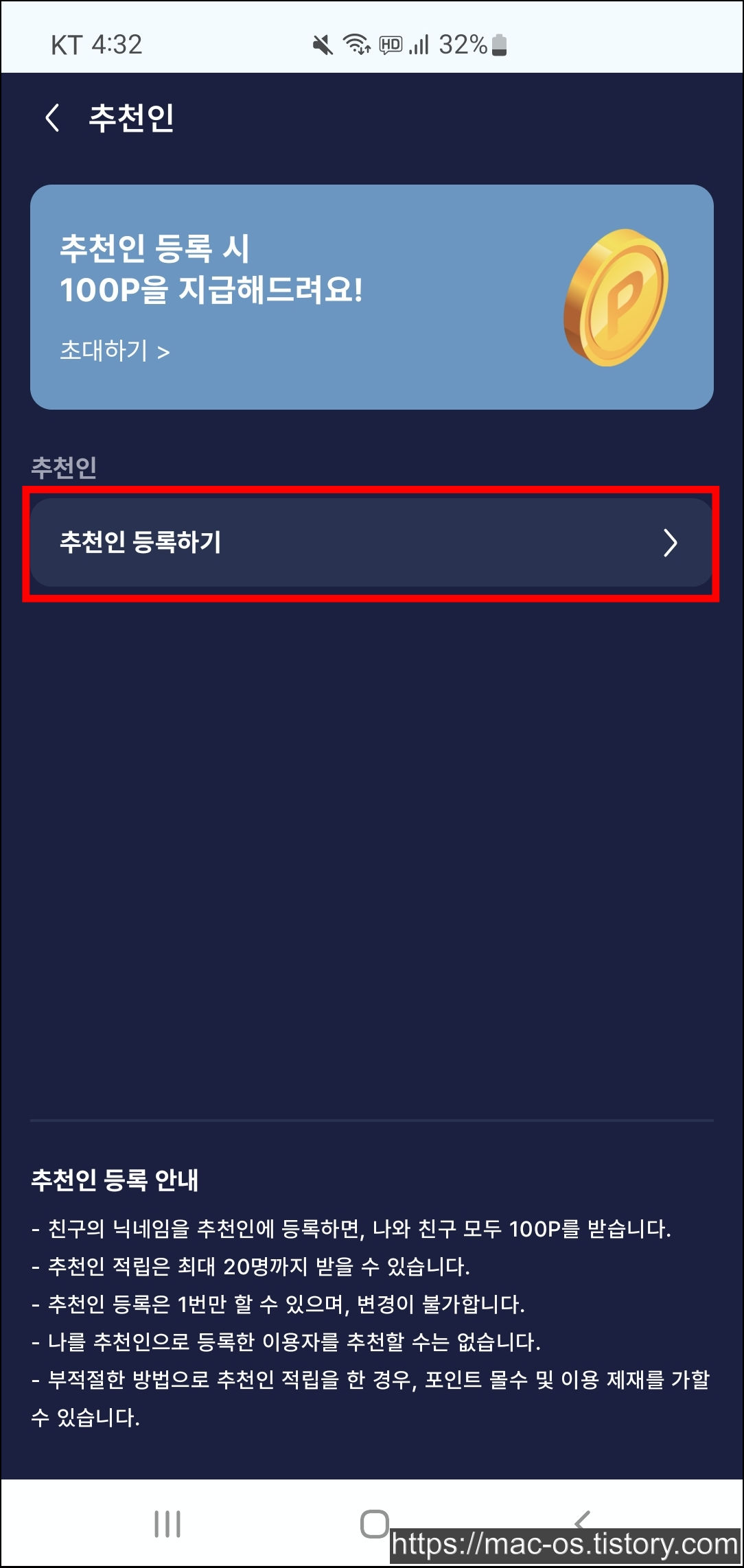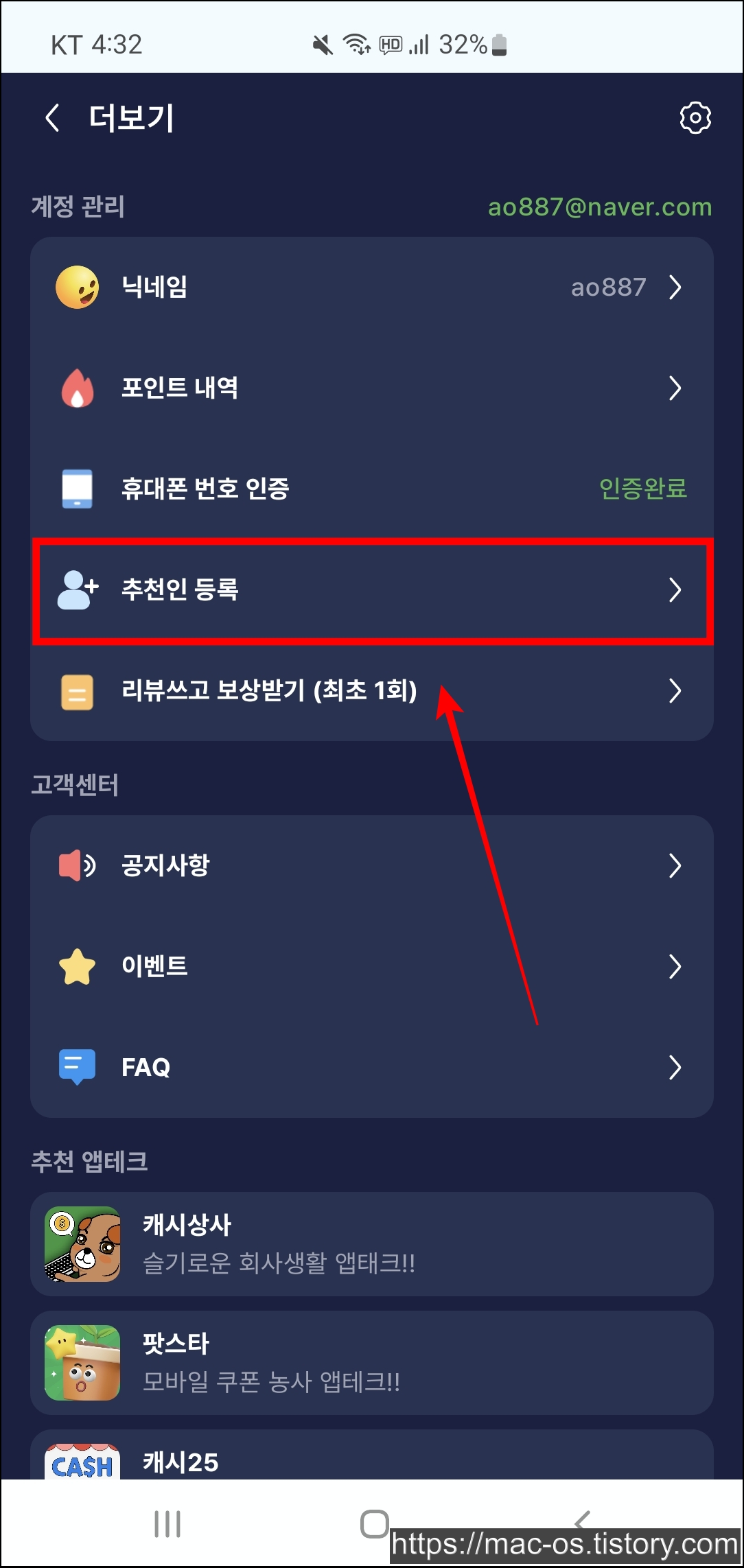 휴대폰 인증을 하고 우측 상단의 더보기를 눌러서 추천인 등록 페이지로 이동한다.