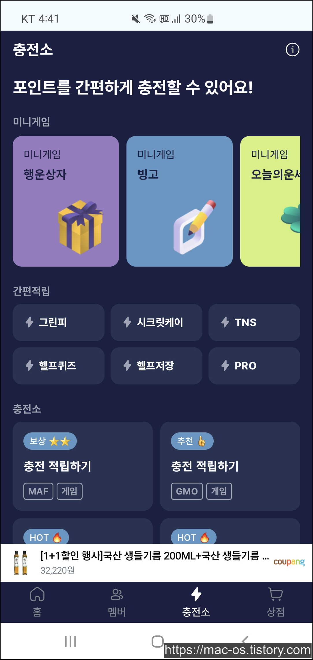 충전소 탭에서 미니게임(행운상자, 빙고, 오늘의 운세), 간편적립, 충전소 총 3가지 컨텐츠를 이용할 수 있다. 등급에 따라 충전소에서 포인트를 적립할 때마다 최대 75% 추가 보너스가 지급된다.