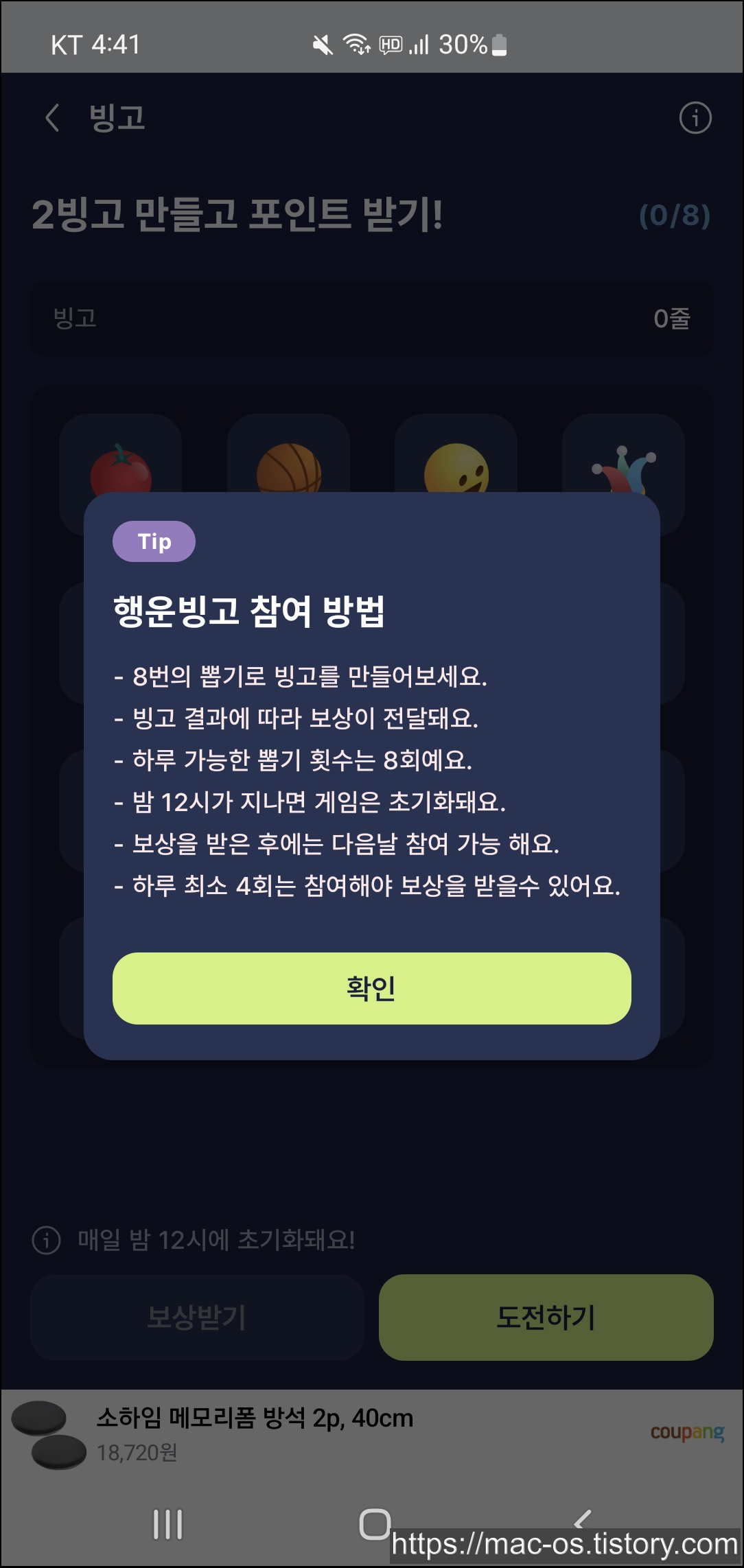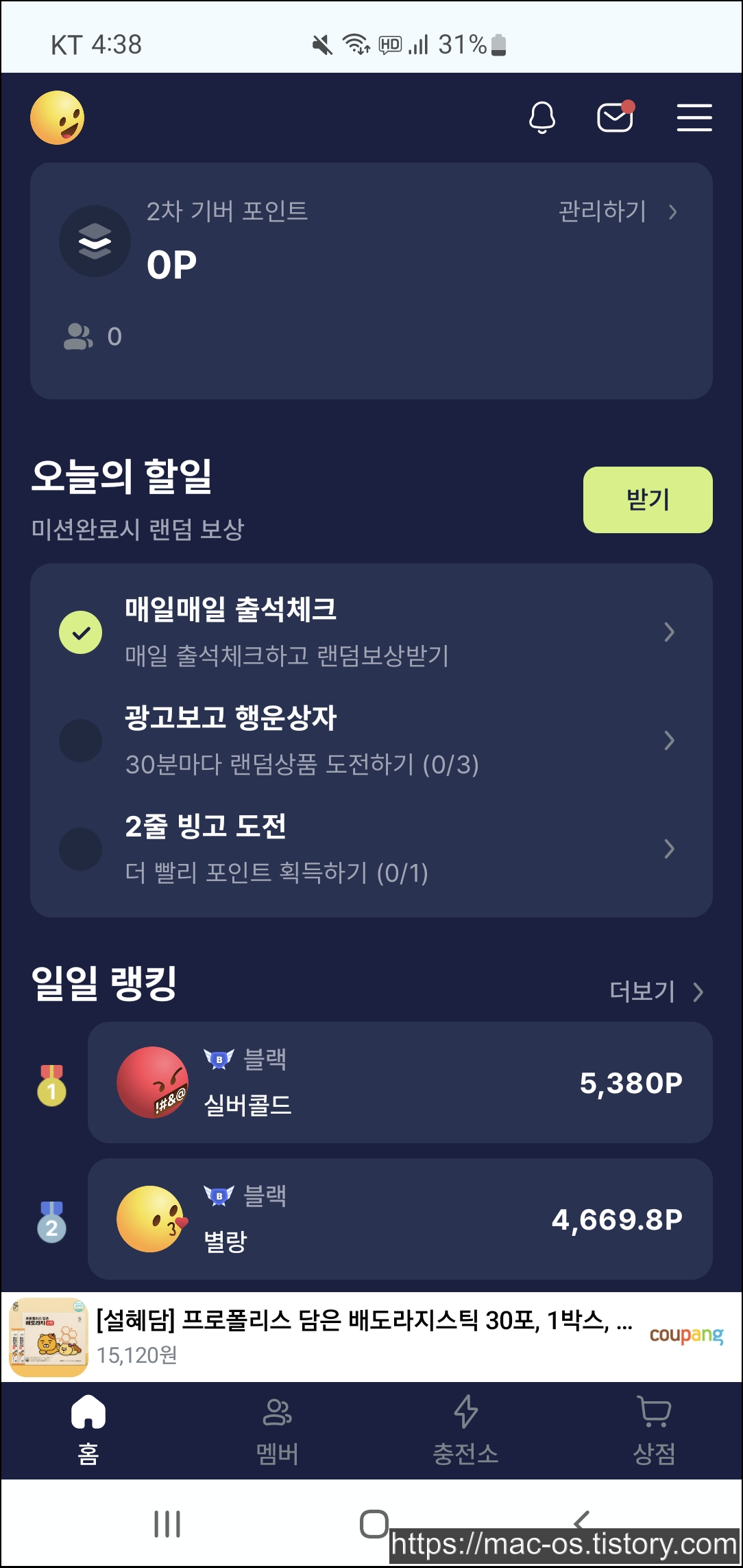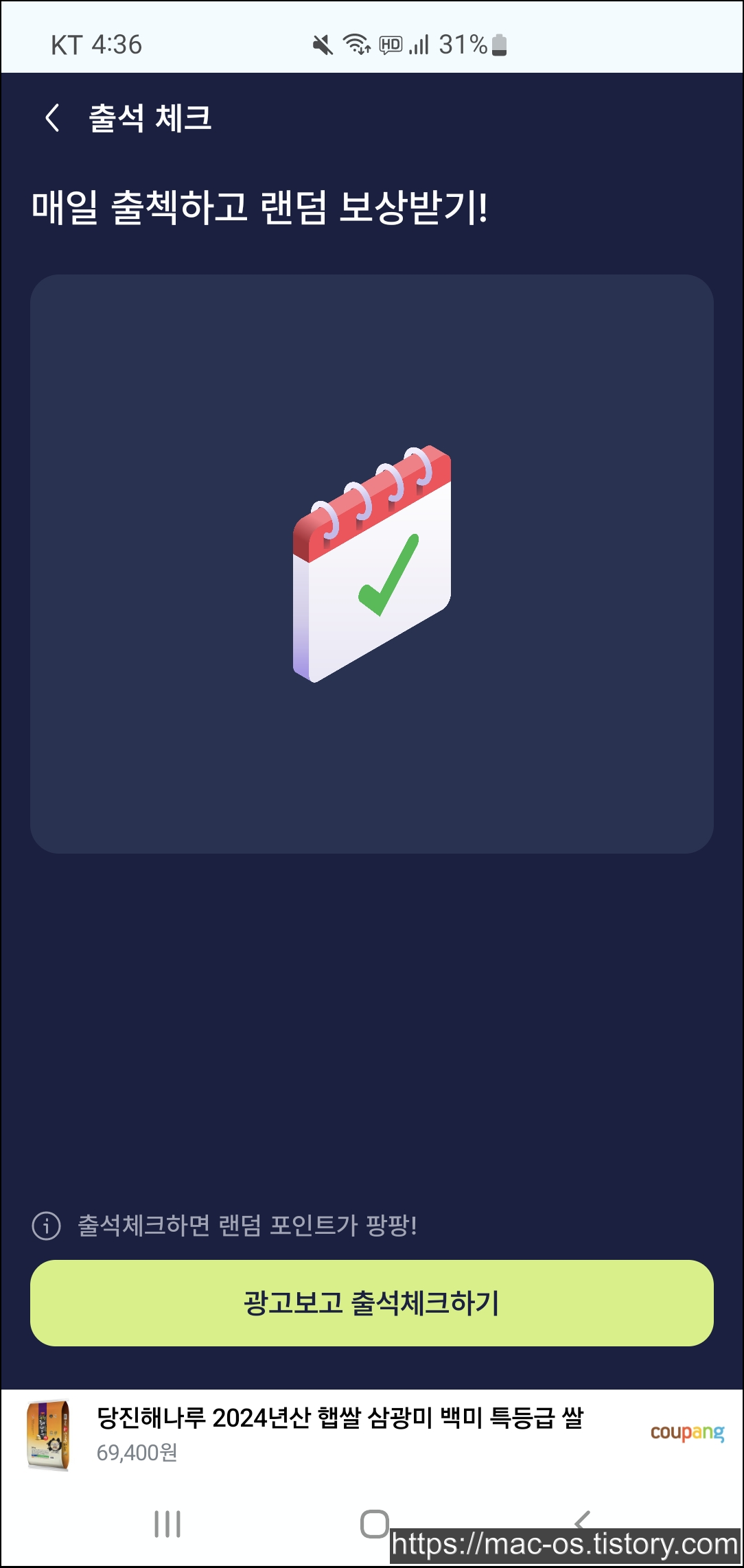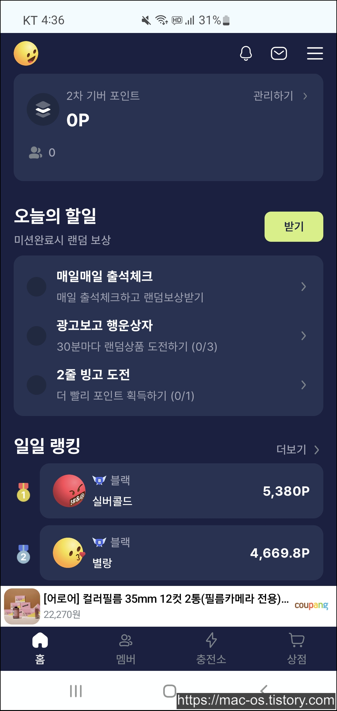 홈 화면에서 아래로 스크롤을 내리면 오늘의 할일이란 것이 있다. 매일매일 출석체크를 누르면 광고보고 출석체크를 할 수 있다.