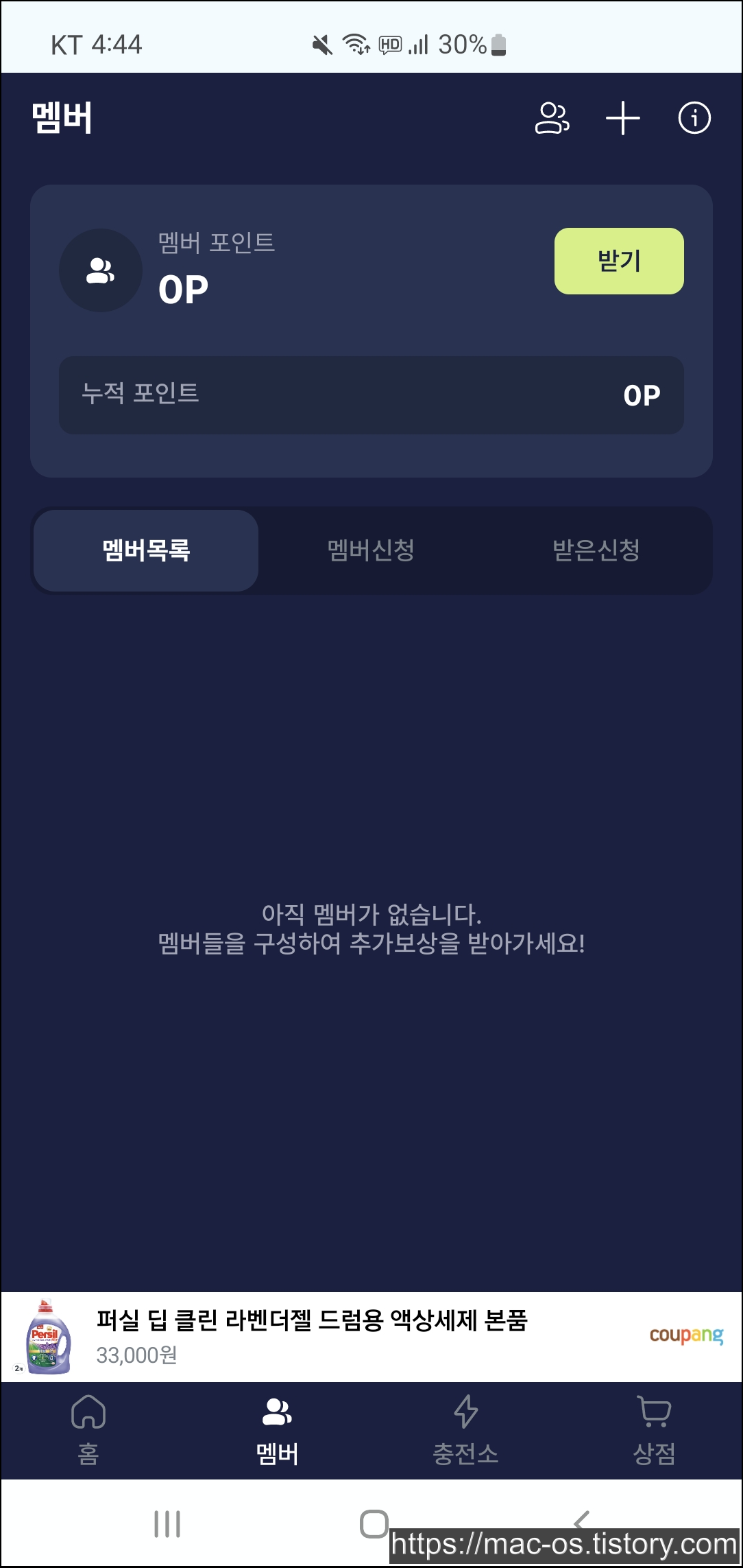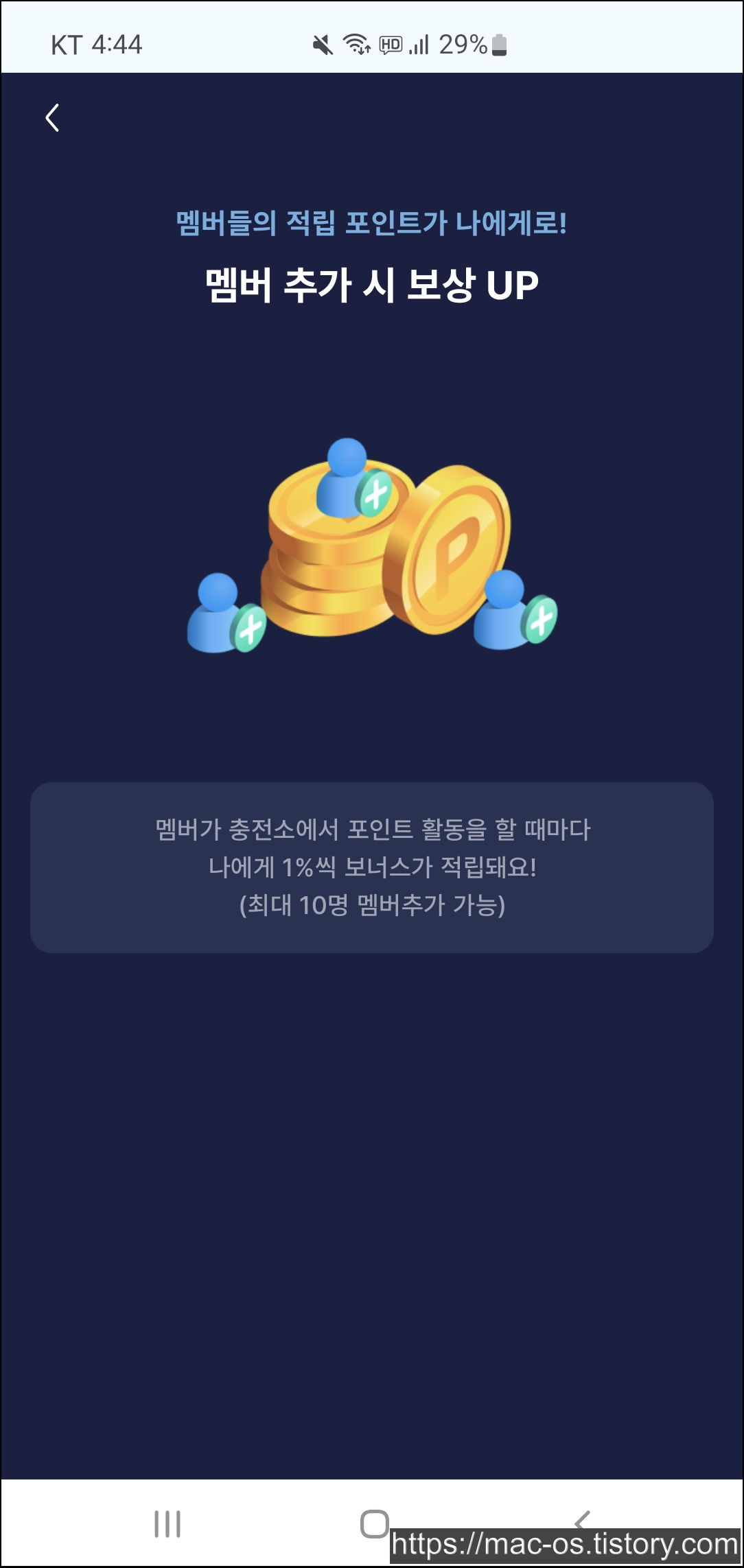 기테의 특별한 기능 멤버에 대해서 알아보자. 우측 상단의 버튼을 이용해 추천 멤버를 추가하거나, 닉네임을 입력해 친구 신청을 보낼 수 있다. 멤버를 추가하면 멤버가 충전소에서 포인트 활동을 할 때마다 나에게 1%씩 보너스가 적립된다. 멤버는 최대 10명까지 추가할 수 있다.