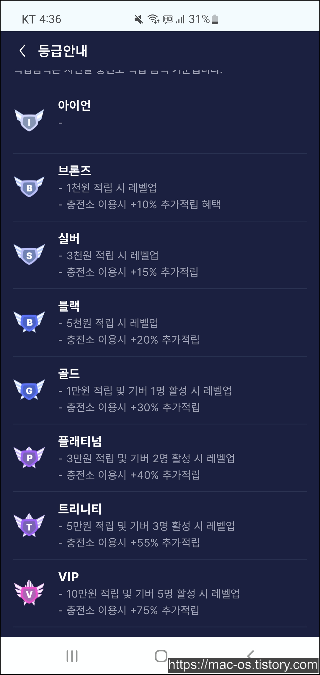 기테에는 등급이란 것이 있는데, 광고 충전소 적립금액이 많아지면 충전소를 이용할 때 추가 적립 혜택이 생긴다. 제일 높은 등급인 VIP는 10만원 적립 및 기버 5명 활성 시 달성할 수 있다.