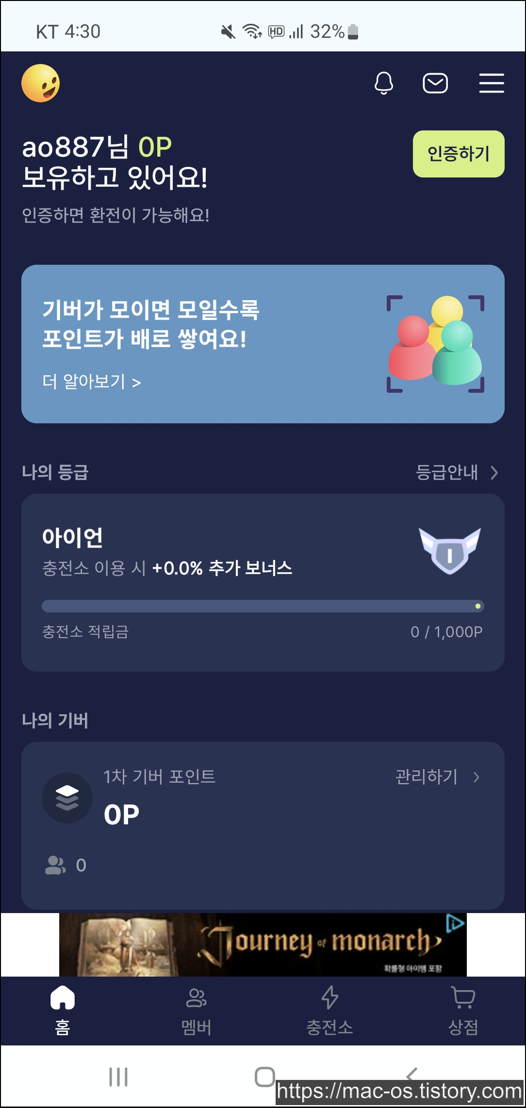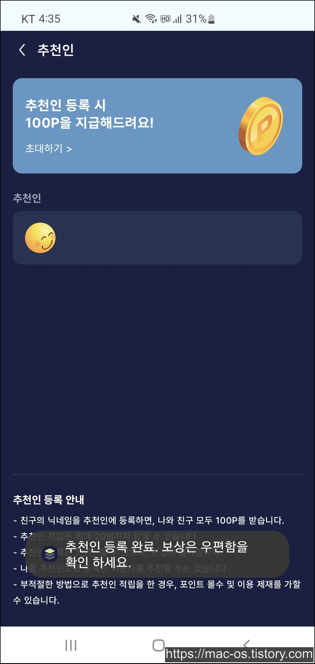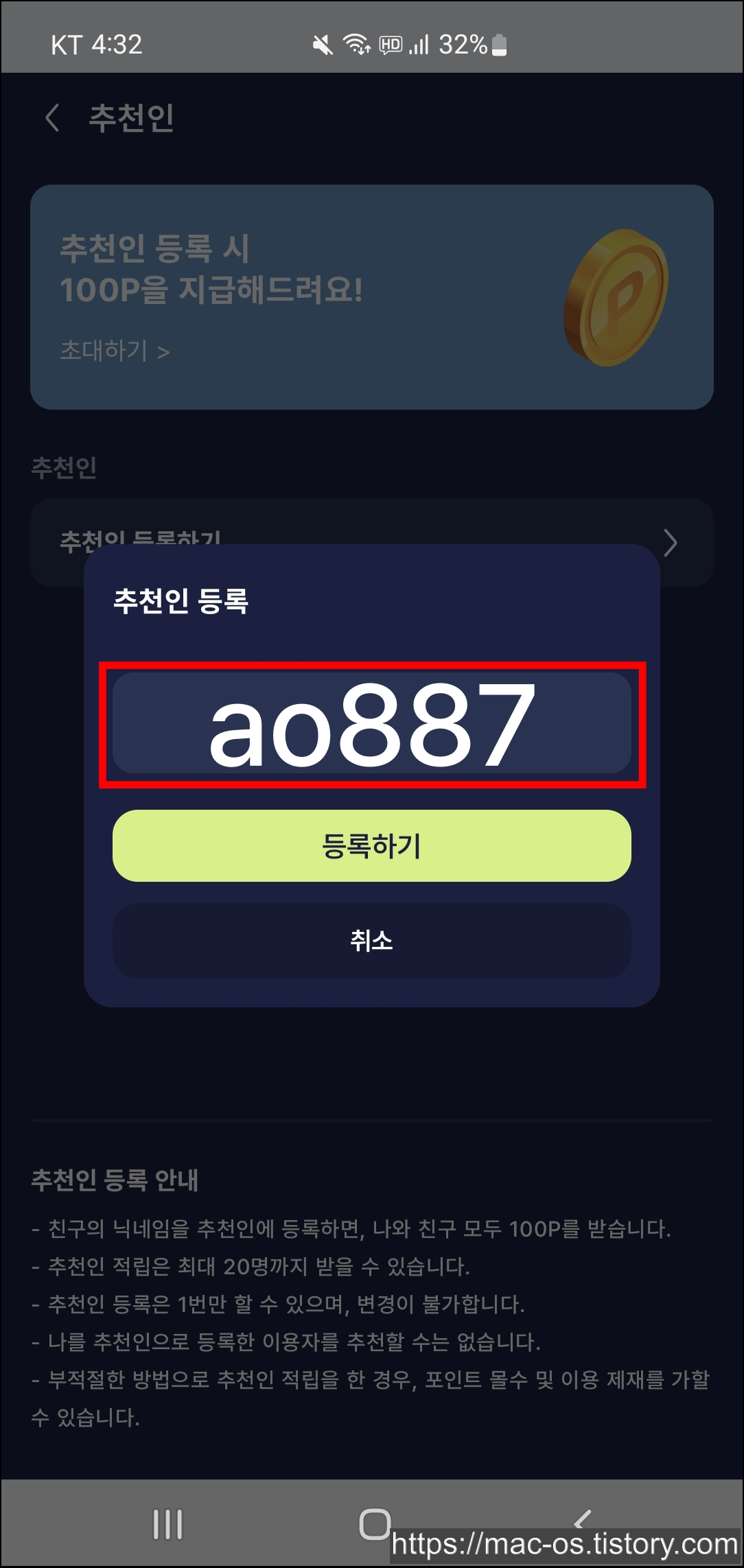 추천인 페이지에서 추천인 등록하기를 누르고 ao887을 입력한다. 그리고 추천인을 등록하면 100포인트를 받을 수 있다.
