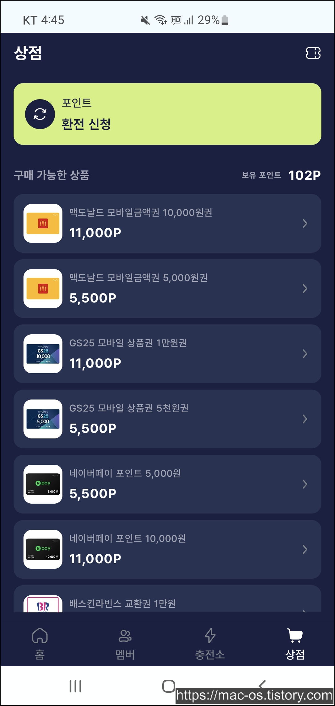 - 포인트는 상점에서 기프티콘이나 본인 계좌로 출금할 수 있음