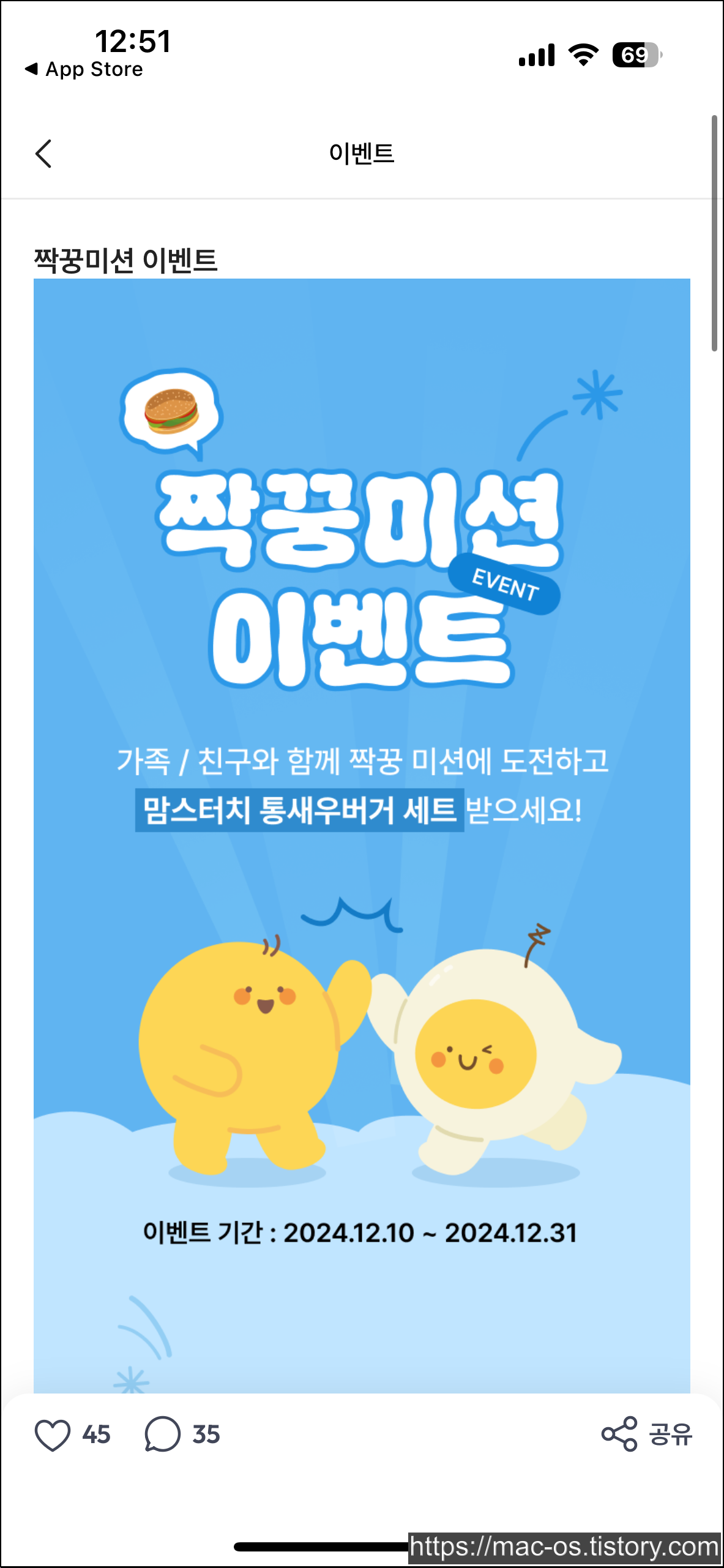 맘스터치 통 새우버거 세트를 경품으로 주네요.