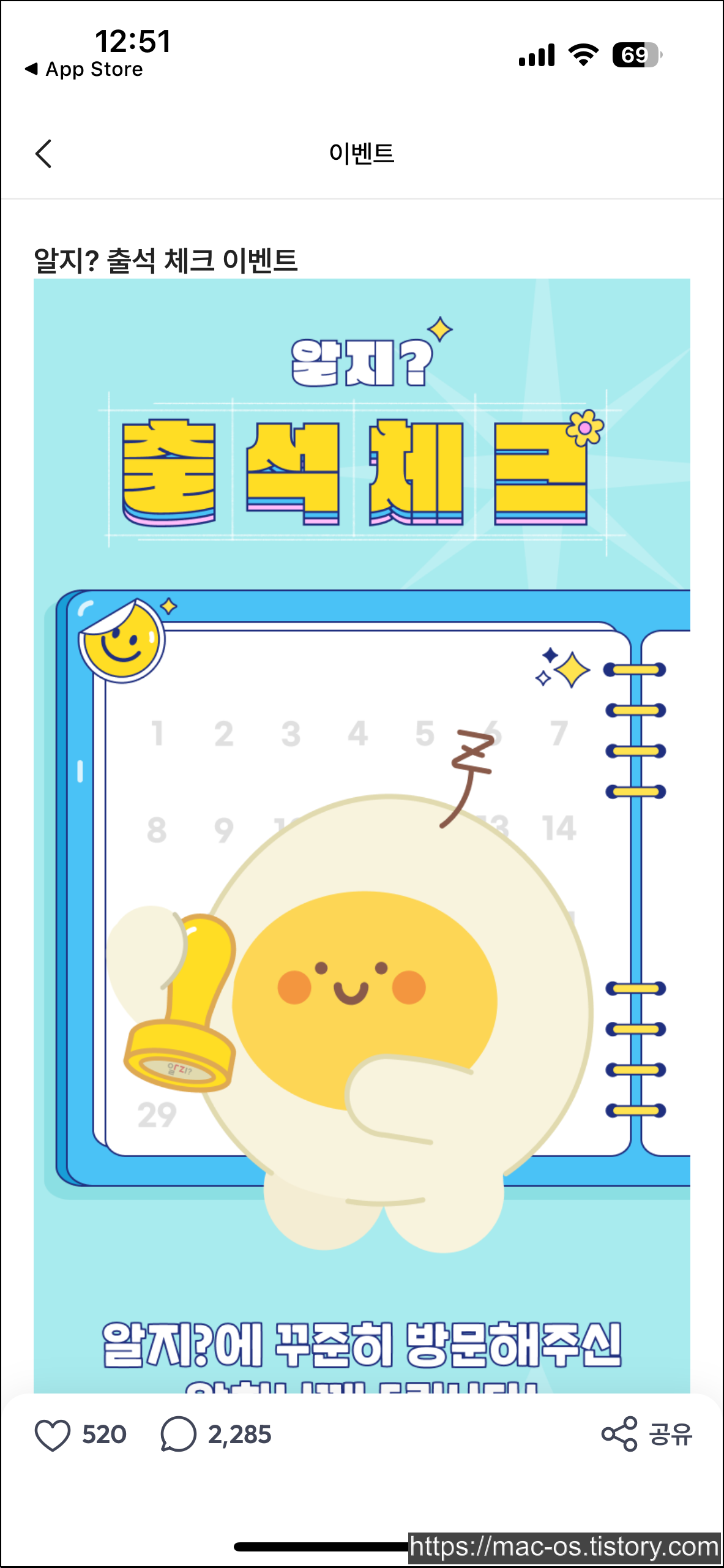 이벤트 탭에서 출석체크 페이지로 갈 수 있습니다.