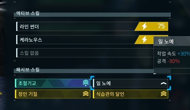 일노예는 작업속도를 30% 증가시키고 공격력을 30% 감소시키는 패시브입니다.