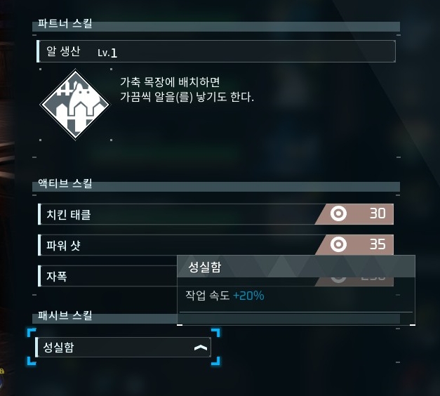 마지막으로 성실함은 작업 속도를 20% 증가시키는 패시브입니다.