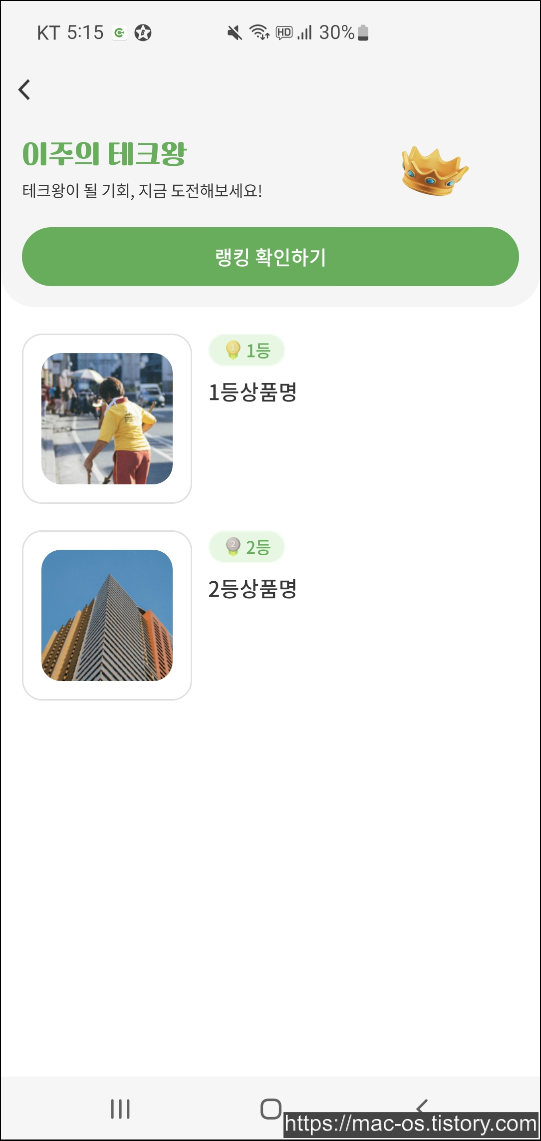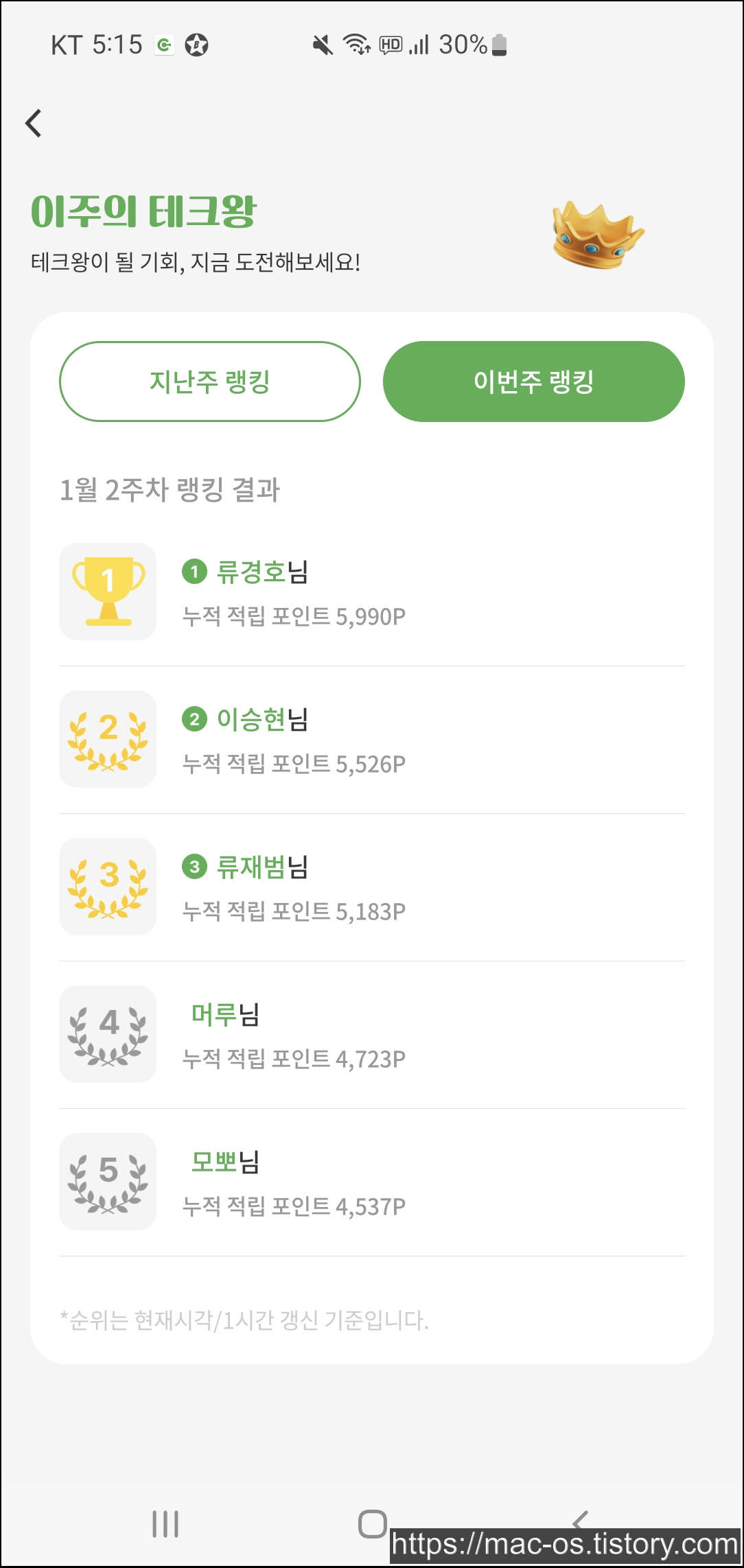 홈 화면에서 우측 상단의 혜택 보기를 누르면 이주의 테크왕이라고 포인트를 많이 모은 사람들을 대상으로 상품을 주는 게 있습니다. 그런데 아직 1등 상품명이랑 2등 상품명이 안적힌거 보니까 준비중인 것 같기두 하고요.