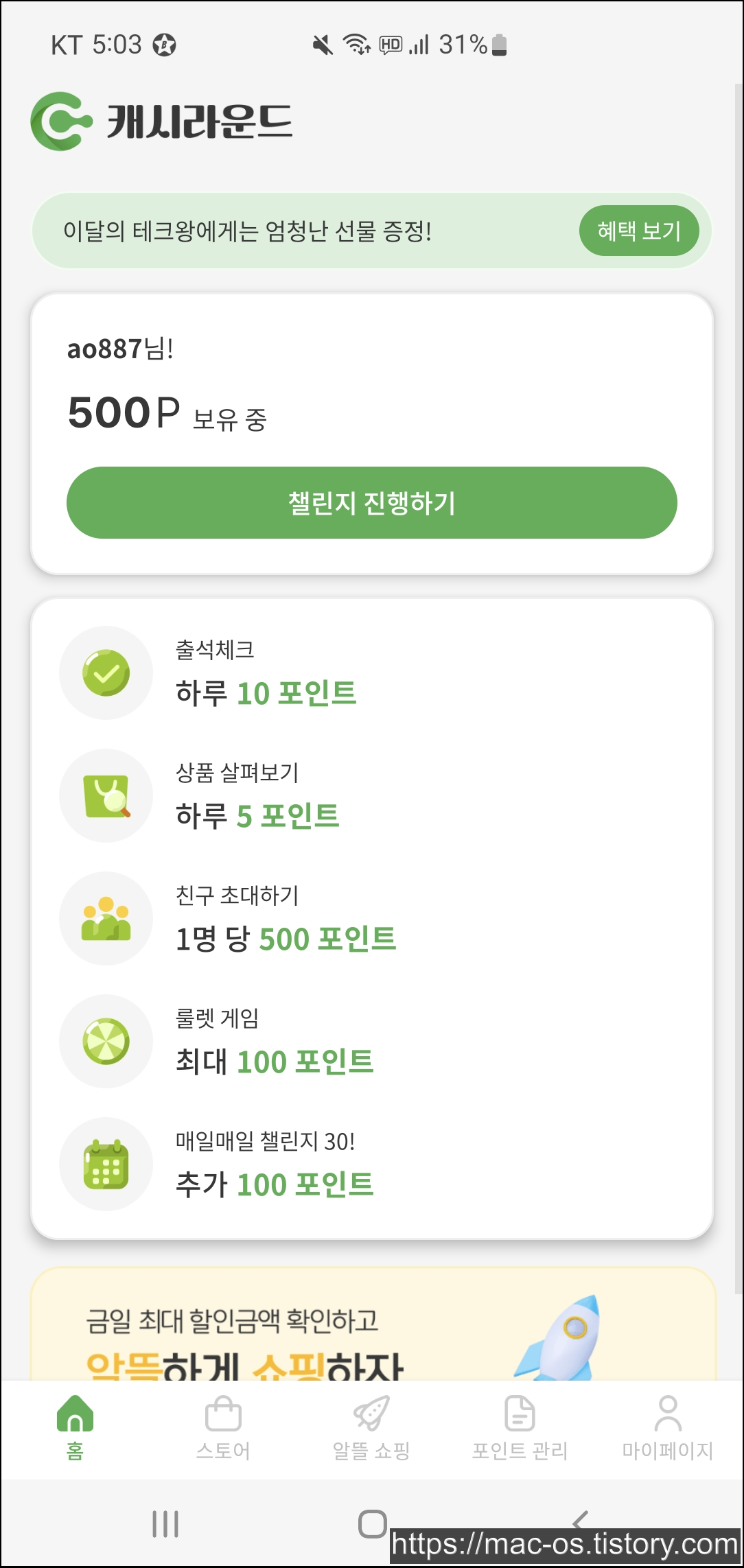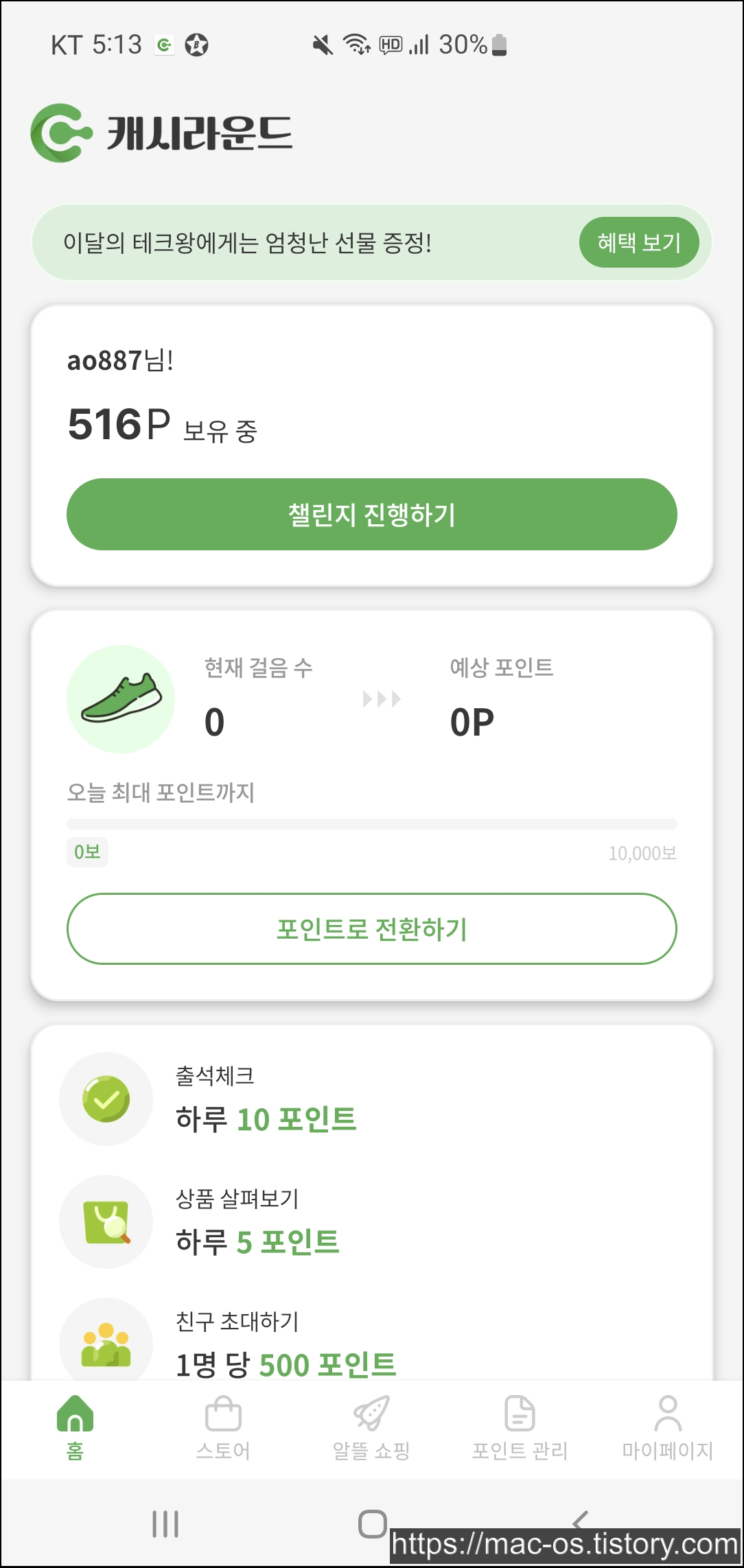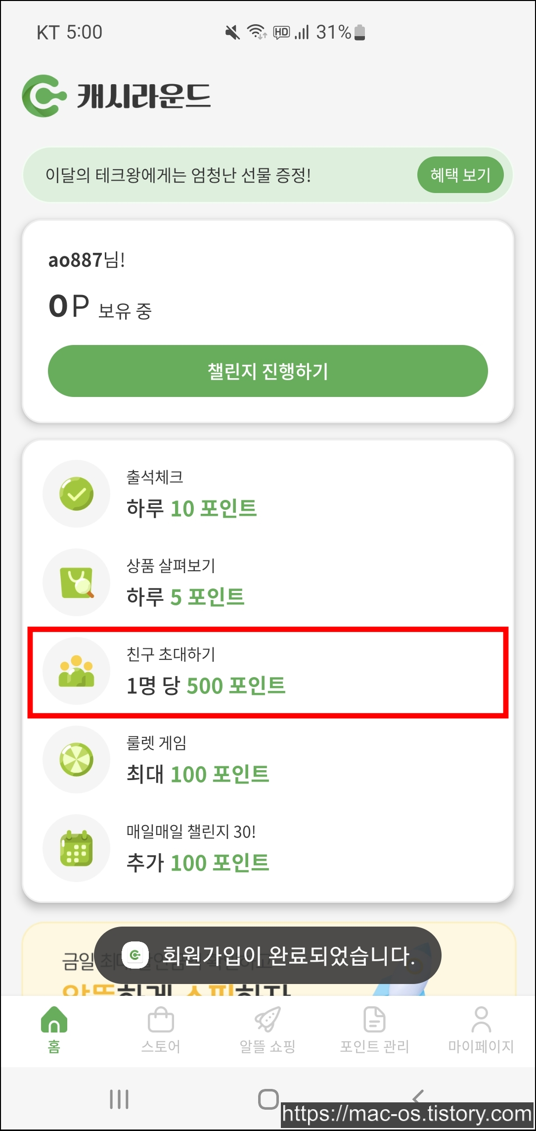 - 추천인에 D6sCov8S 입력하면 500포인트 지급