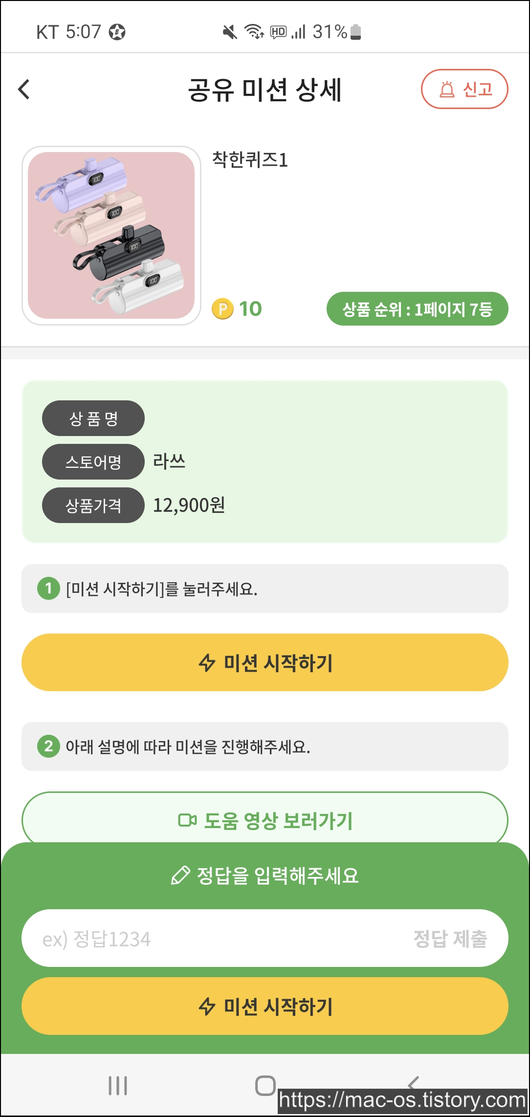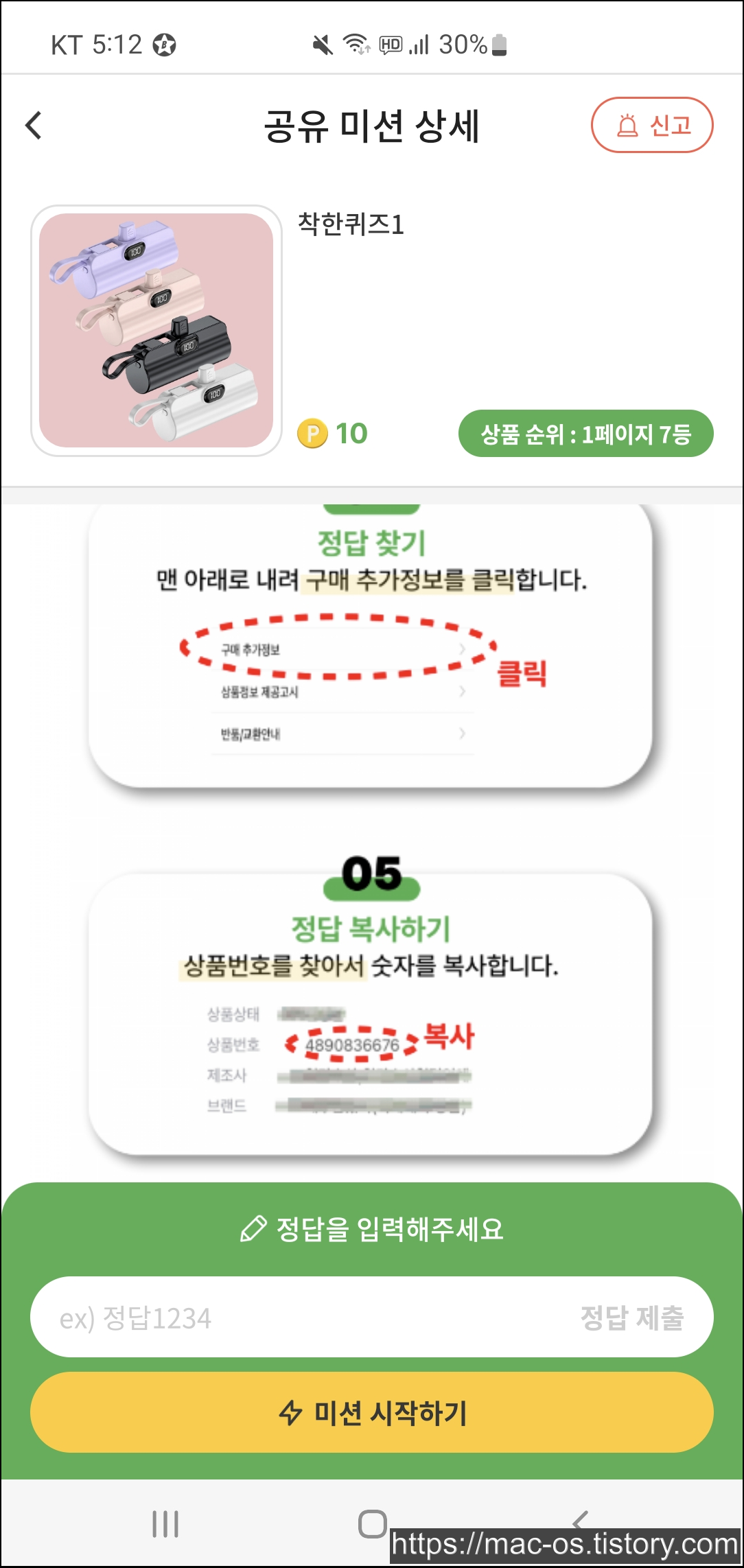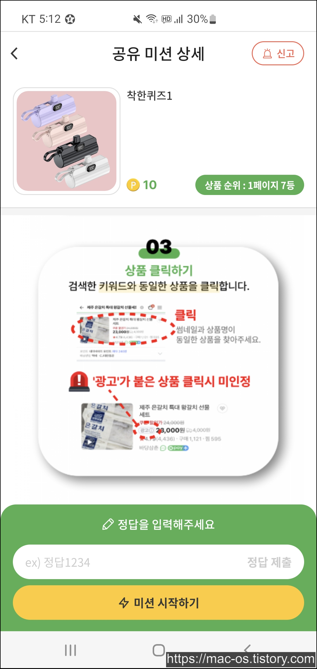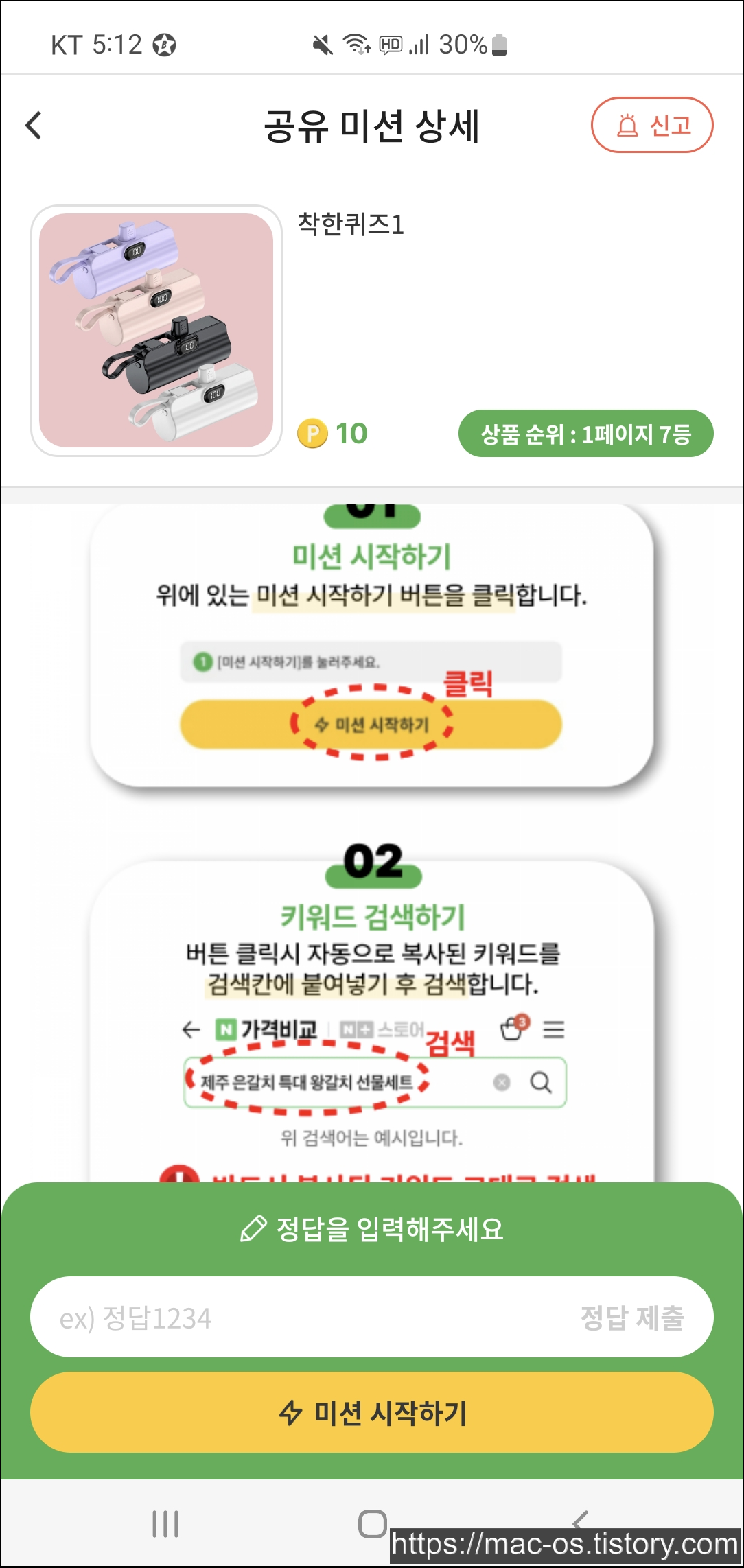 미션을 누르면 미션에 참여하는 방법을 알려주는데 키워드를 복사하고 검색해서 광고하는 상품 페이지로 들어가라고 합니다.
