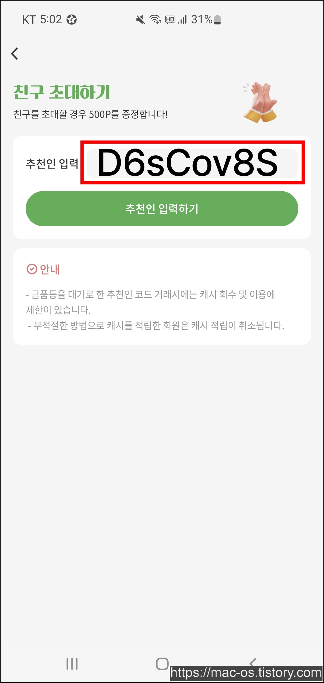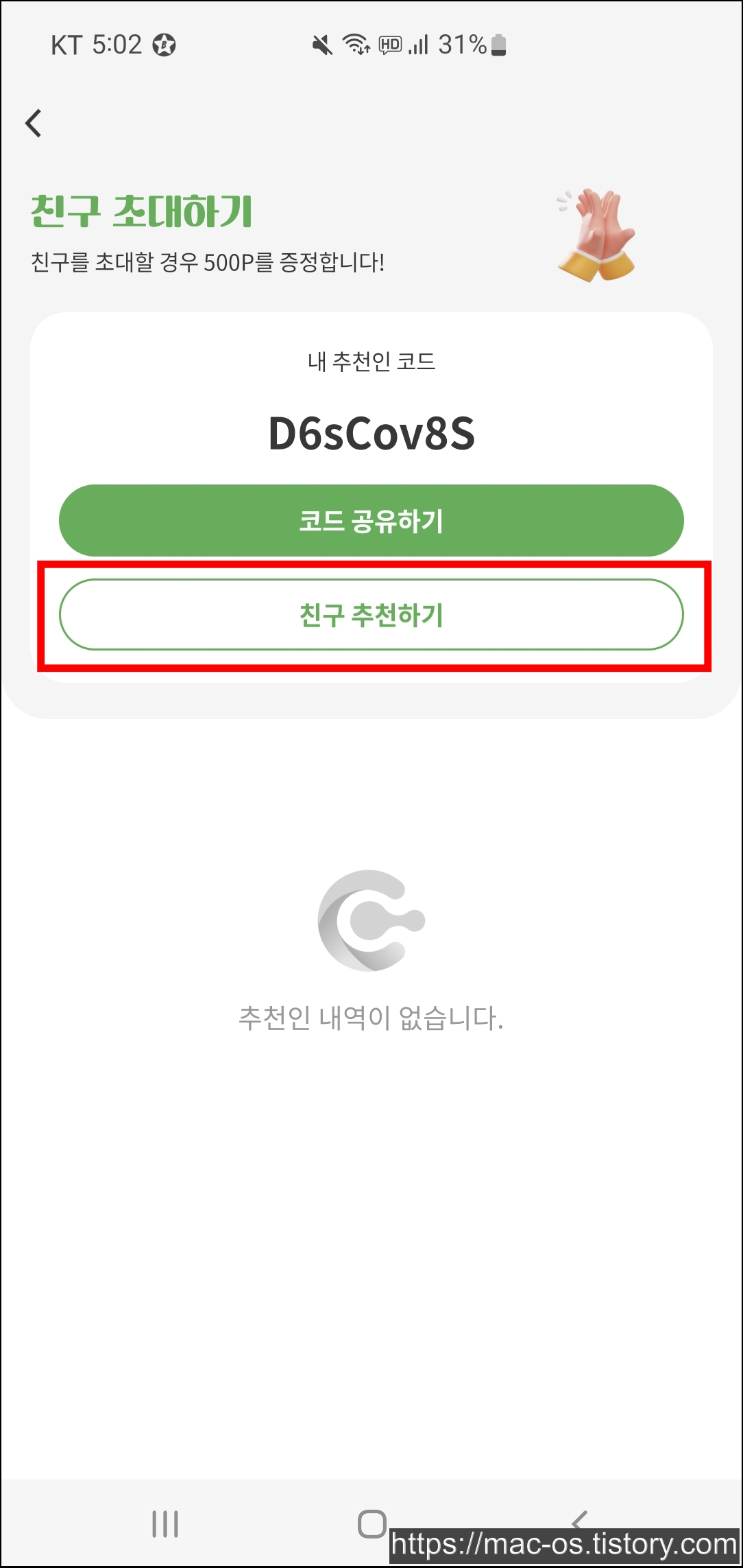 친구 초대하기 페이지에서 친구 추천하기를 누르면 추천인을 입력할 수 있습니다. 여기서 추천인 칸에 D6sCov8S를 입력하면 신규회원도 500포인트를 받고 시작합니다.