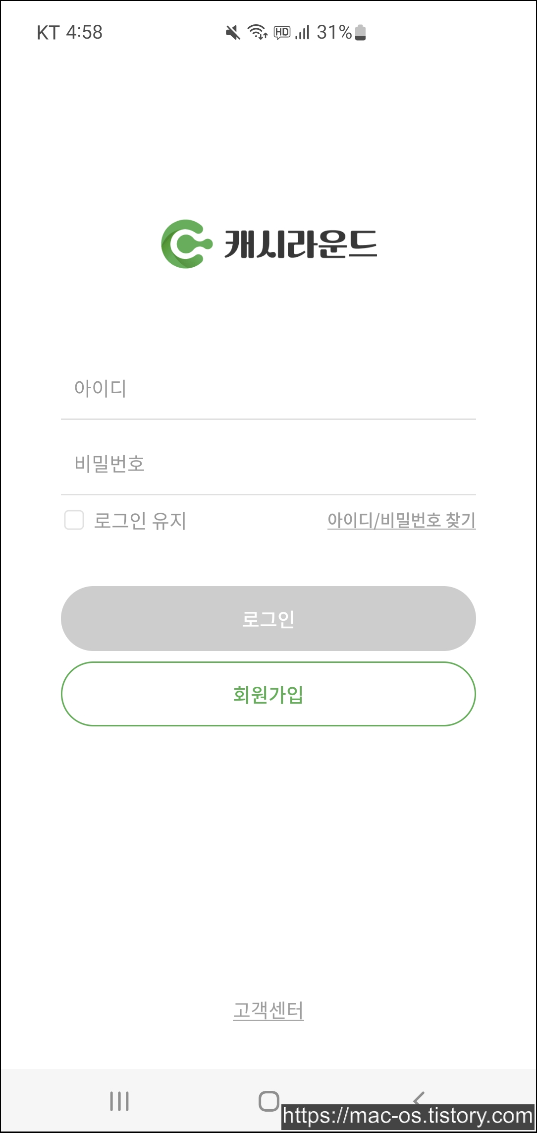 캐시라운드는 구글 플레이 스토어에서 설치할 수 있습니다. 앱을 실행하면 로그인 화면이 나옵니다.