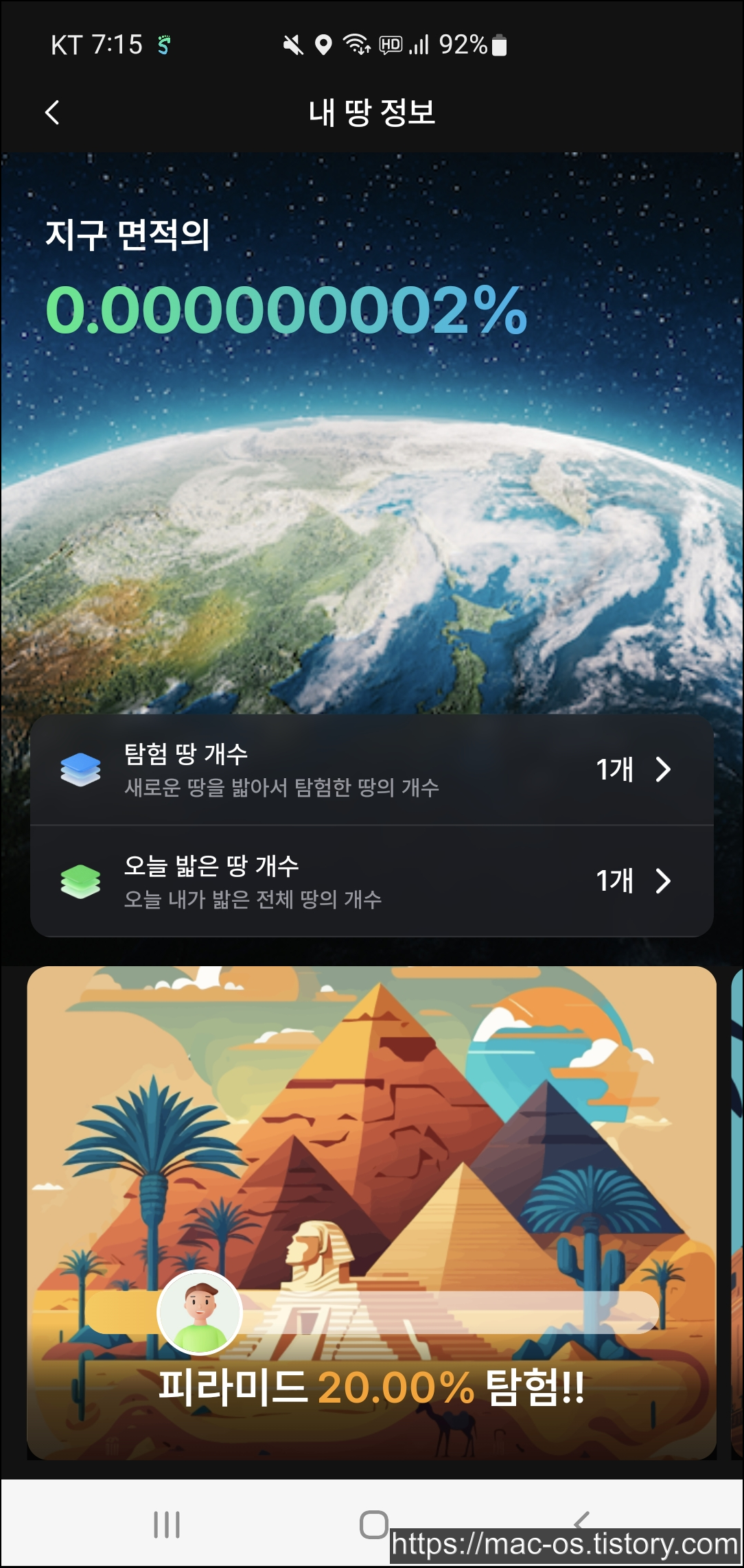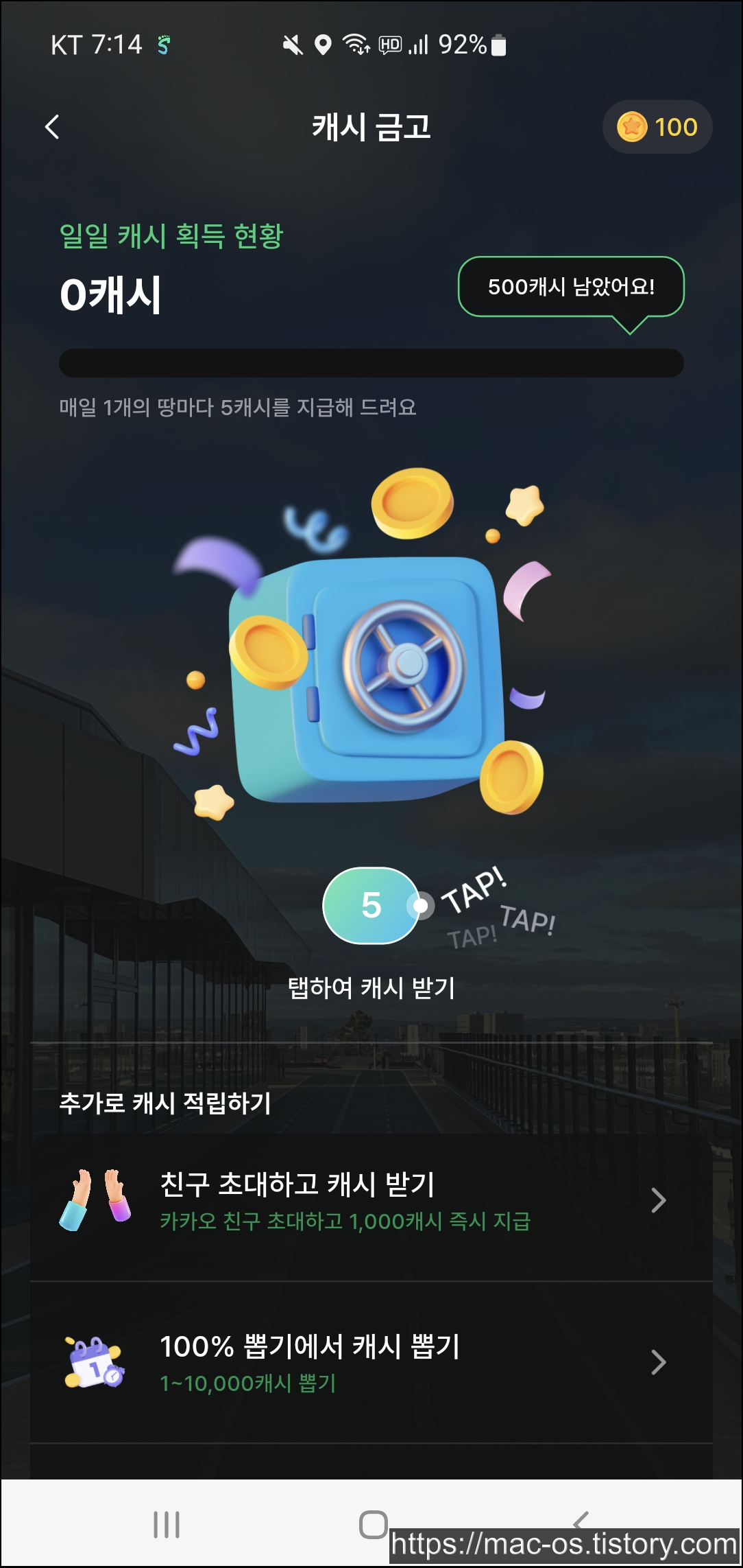- 땅을 밟으면 땅 1개당 5캐시 (하루 최대 500캐시)