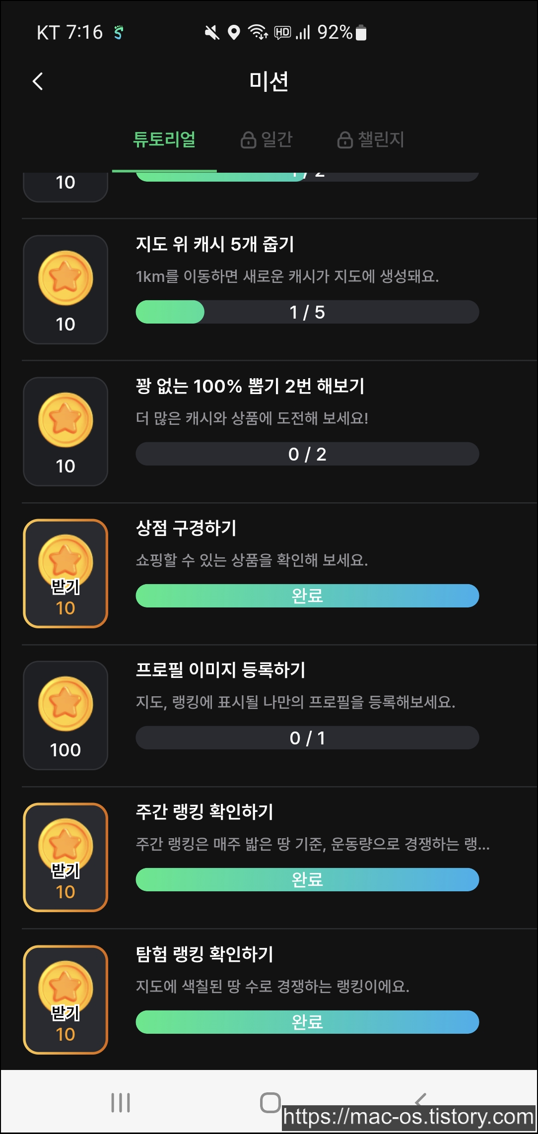 미션 페이지에서는 튜토리얼과 일간, 챌린지가 있습니다. 여기서 튜토리얼을 모두 완료하면 일간 미션에 참여할 수 있는데요. 일간 미션을 모두 완료하면 얼마를 주는지는 아직 확인하지 못했습니다.