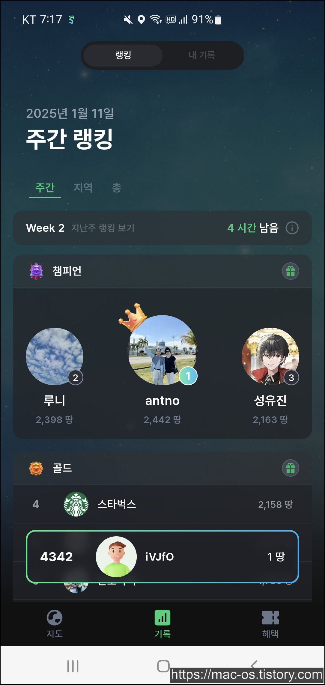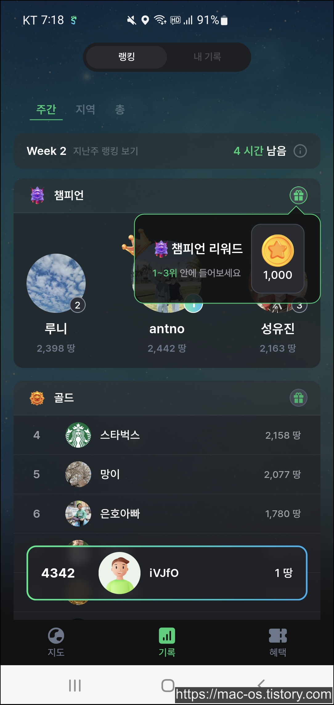 하단 메뉴를 누르면 주간 랭킹을 확인할 수 있습니다. 땅의 개수를 가지고 순위를 측정하는데요. 1~3위는 1000캐시, 4~10위는 700캐시, 11~20위는 400캐시 이런 식으로 지급하고 있습니다.