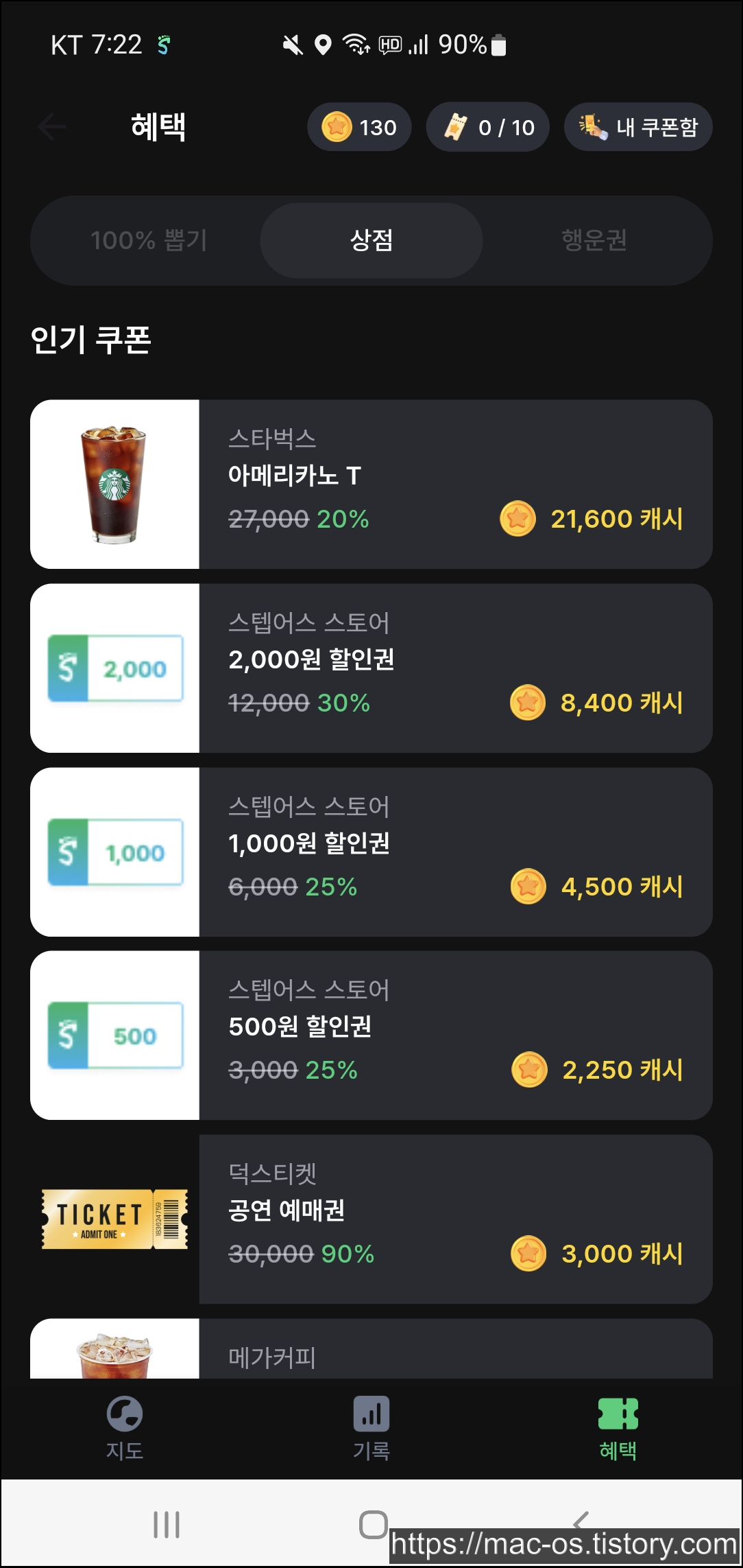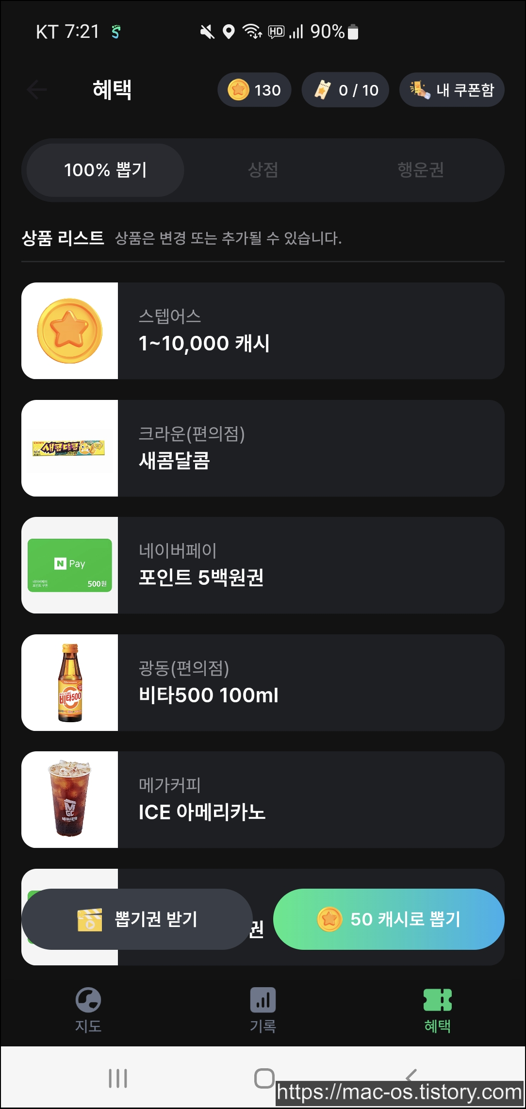 스텝어스에서 얻은 캐시는 혜택 메뉴에서 50캐시로 상품을 뽑거나 상점에서 기프티콘 및 상품권을 구매하는 용도로 사용합니다.