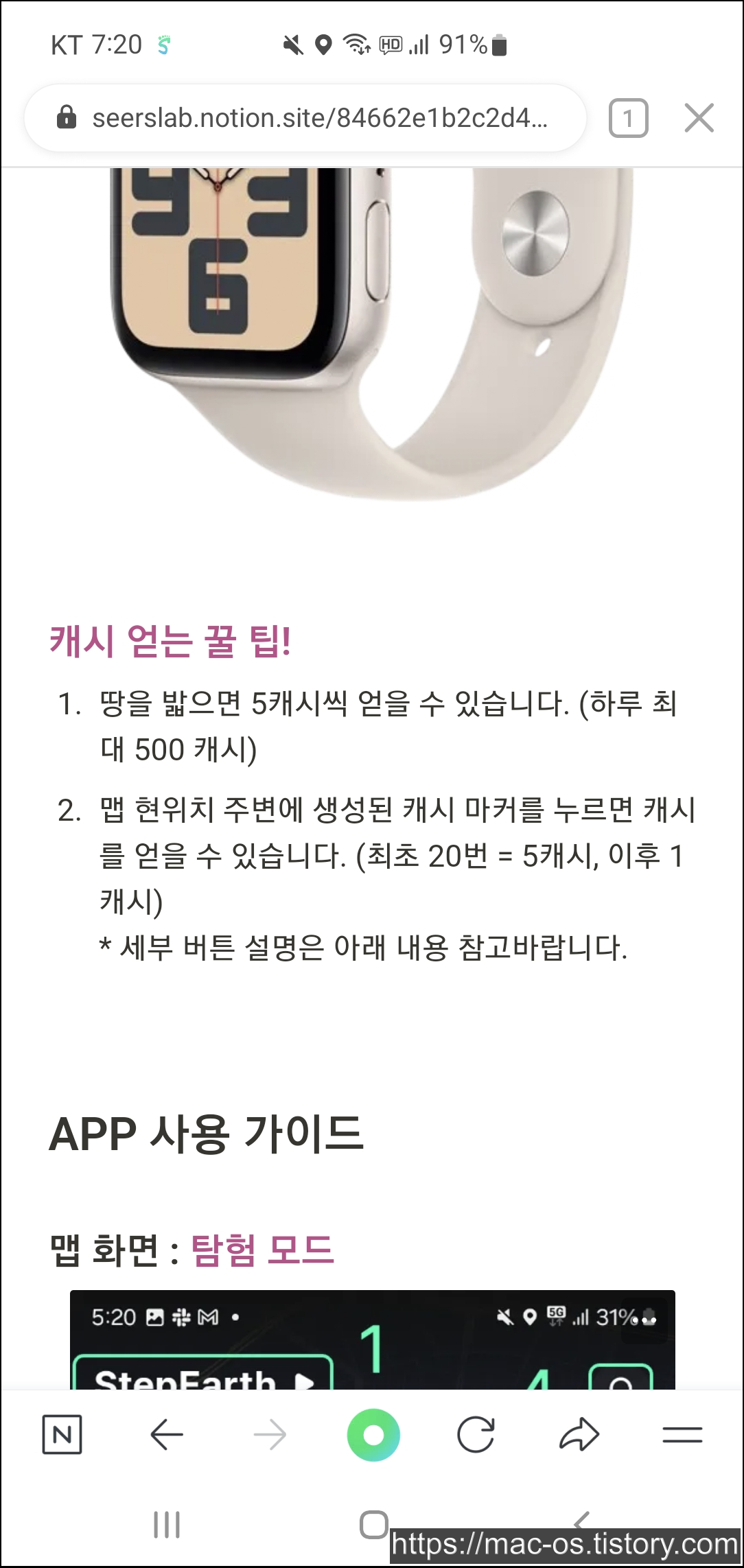 스텝어스에서 직접 만든 공식 플레이 가이드를 확인해봤습니다. 땅을 100개 얻어서 하루에 500캐시를 받는 것 말고도 현재 위치 주변에 생성되는 캐시 마커를 눌러서 캐시를 획득할 수 있습니다. 최초 20번은 5캐시를 줘서 총 100캐시, 그 이후부터는 1캐시가 적립됩니다.