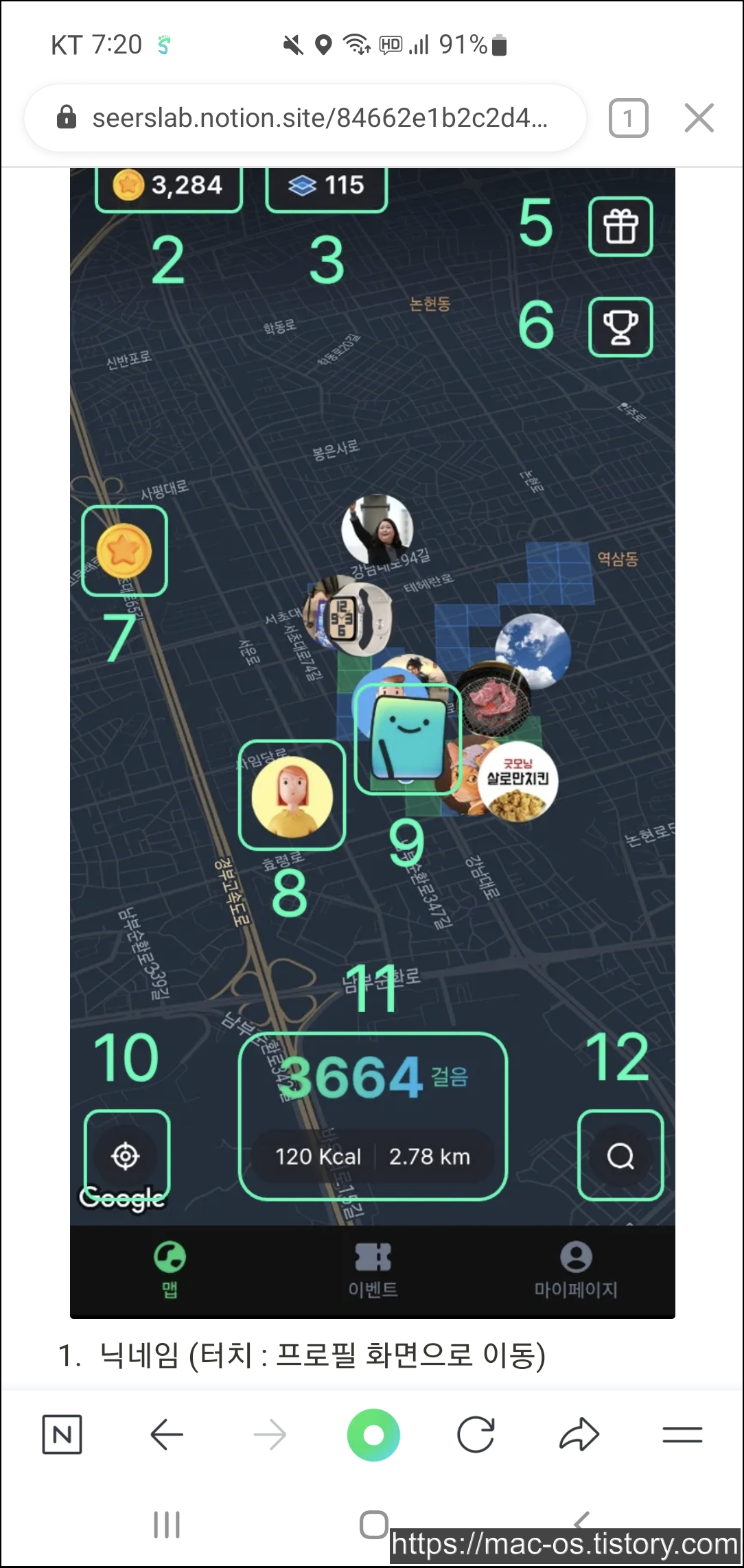 스텝어스에서 캐시를 얻는 방법을 알아봅시다. 우선, 스텝어스는 땅이라는 것이 있습니다. 휴대폰의 GPS 기능을 이용해 휴대폰을 들고 현재 내 위치 주변으로 이동하면 스텝어스에서 자동으로 땅을 획득합니다. 이 땅 1개당 5캐시를 받을 수 있고, 하루에 최대 100개의 땅으로 500캐시까지 획득 가능합니다.