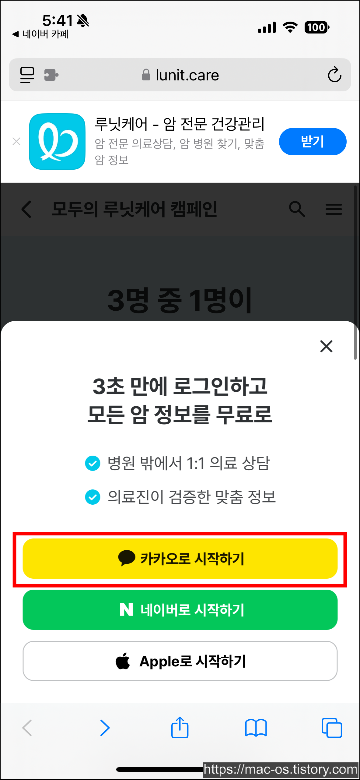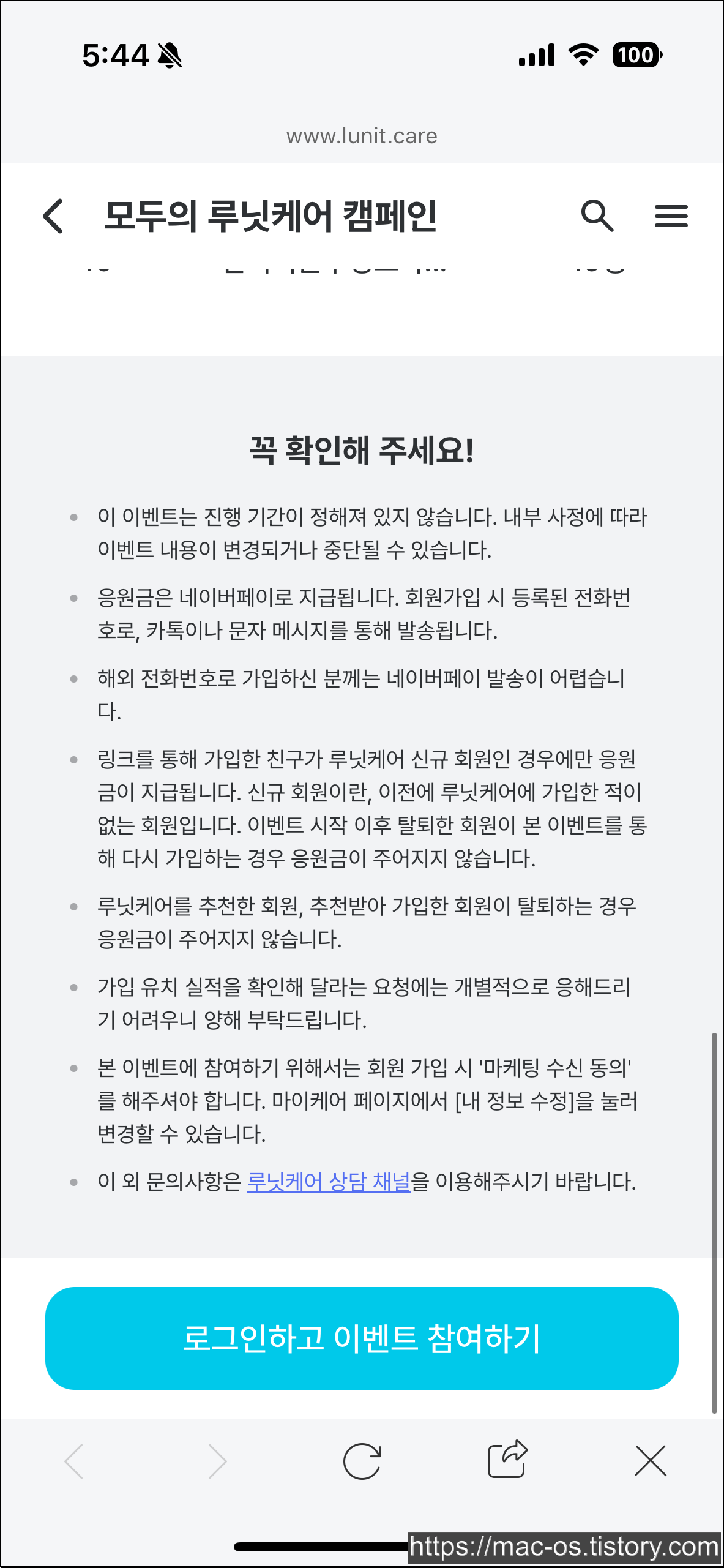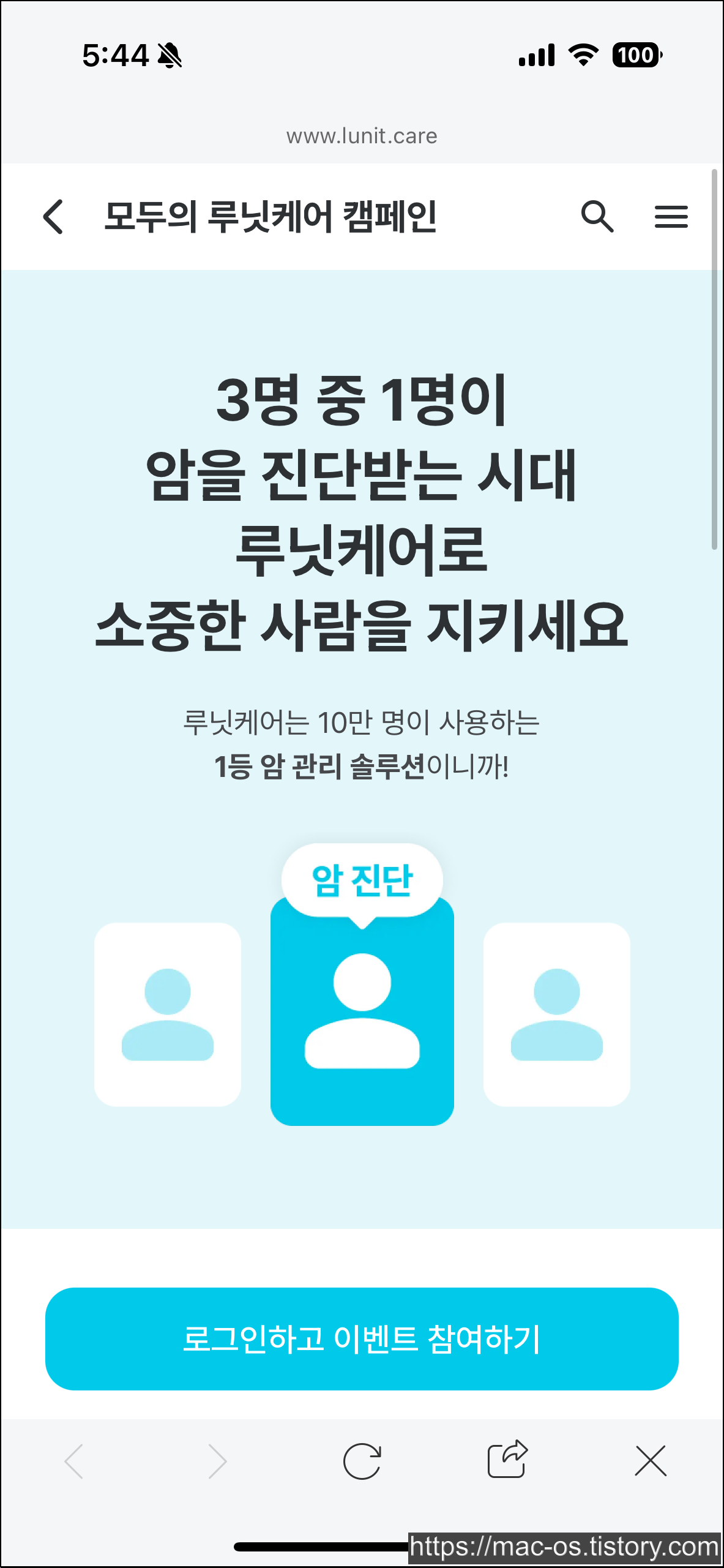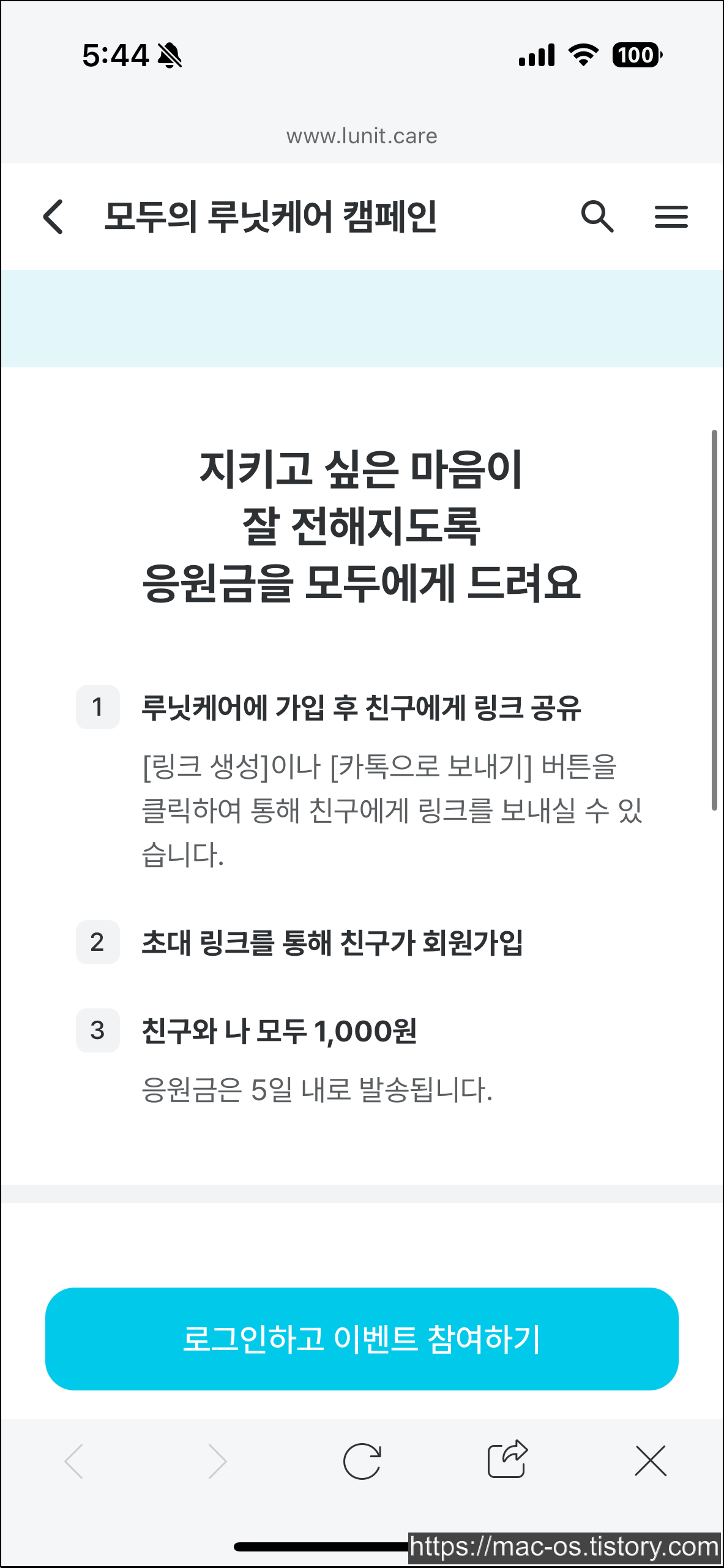 위에 있는 링크로 들어가면 루닛케어 친구초대 페이지로 이동합니다. 아래에 있는 [로그인하고 이벤트 참여하기] 버튼을 누르고 [카카오로 시작하기]를 눌러주세요. 네이버나 애플로 가입해도 되는 듯합니다.