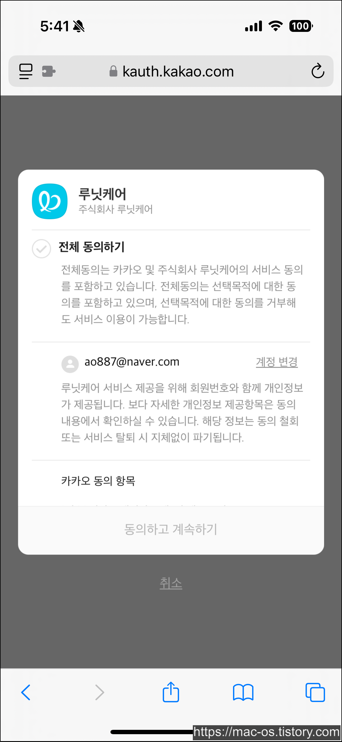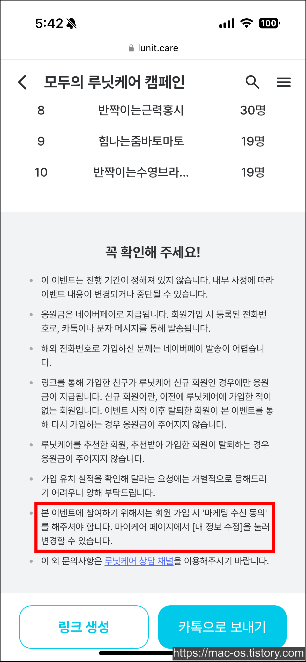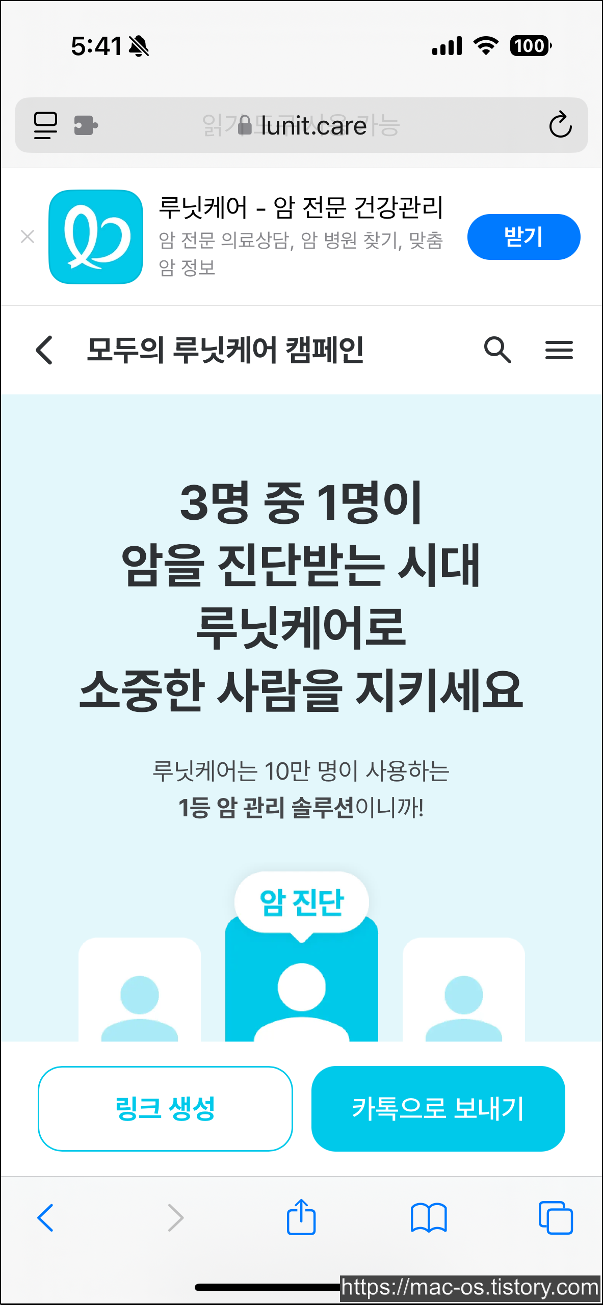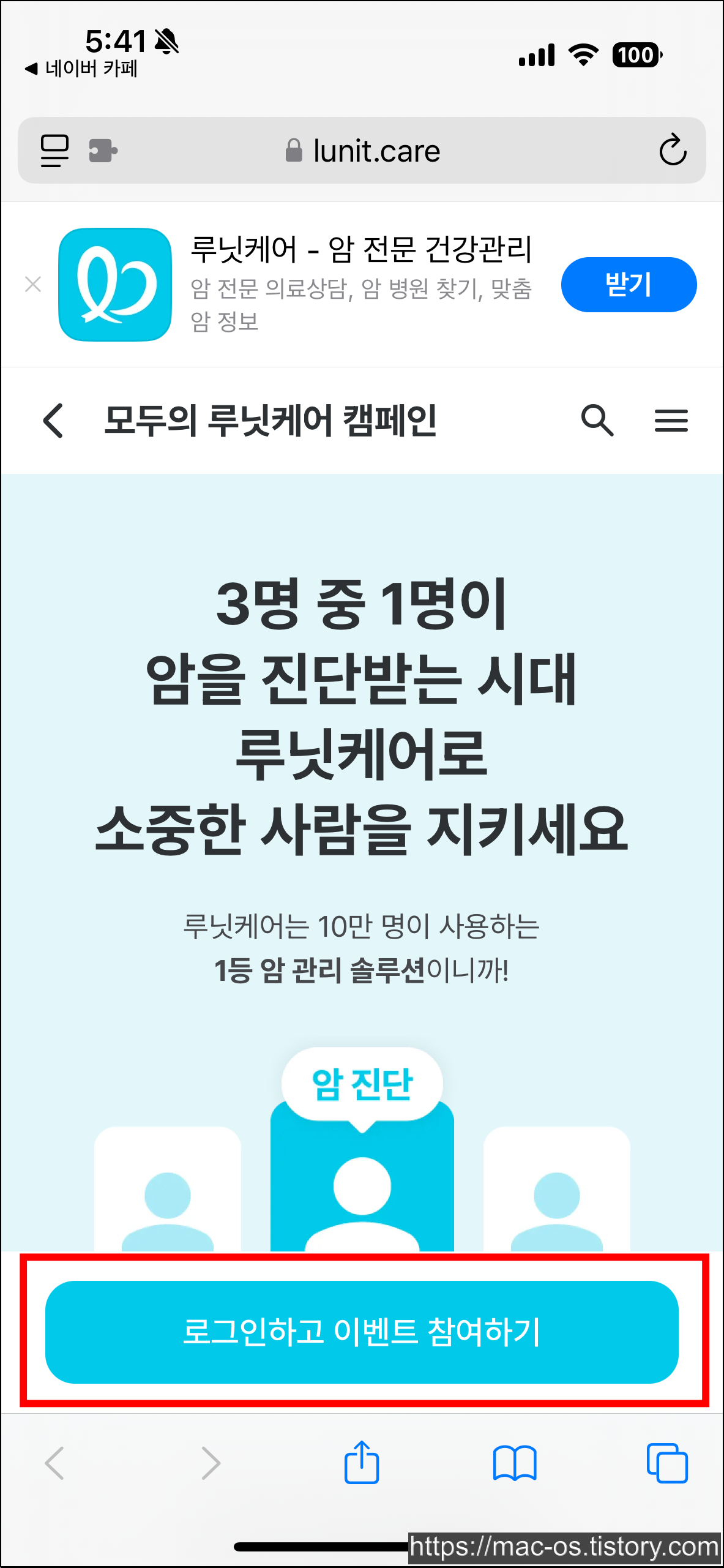 위에 있는 링크로 들어가면 루닛케어 친구초대 페이지로 이동합니다. 아래에 있는 [로그인하고 이벤트 참여하기] 버튼을 누르고 [카카오로 시작하기]를 눌러주세요. 네이버나 애플로 가입해도 되는 듯합니다.