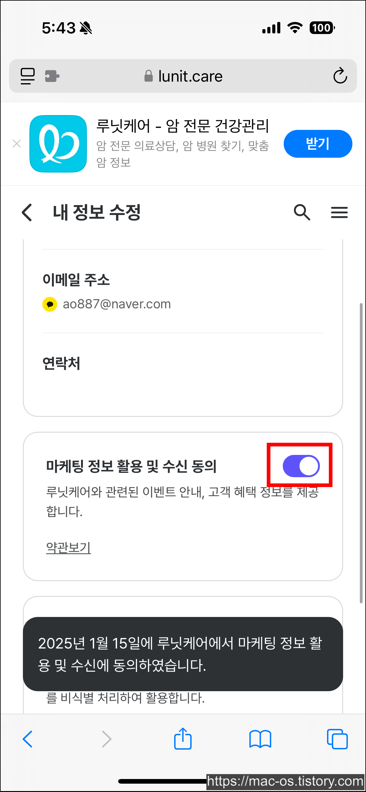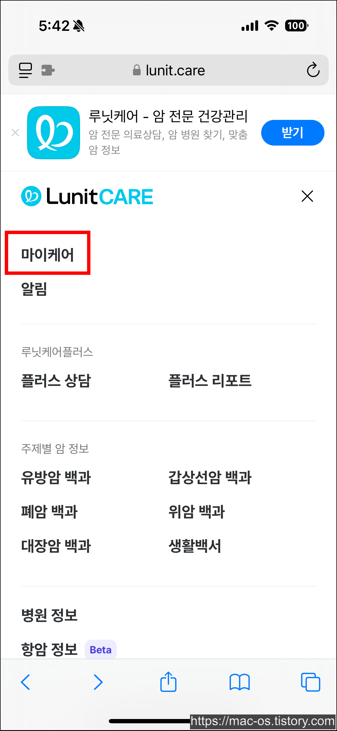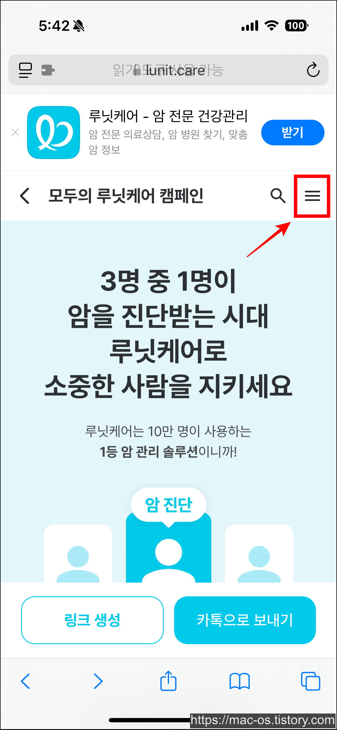 루닛케어 친구초대 이벤트 제일 아래 문구를 살펴보면 [이벤트에 참여하기 위해서는 회원가입 시 마케팅 수신 동의를 해주셔야 합니다]라고 적혀있습니다. 회원가입할 때 마케팅 수신 동의를 안한 분들은 우측 상단의 더보기 메뉴를 터치합니다.