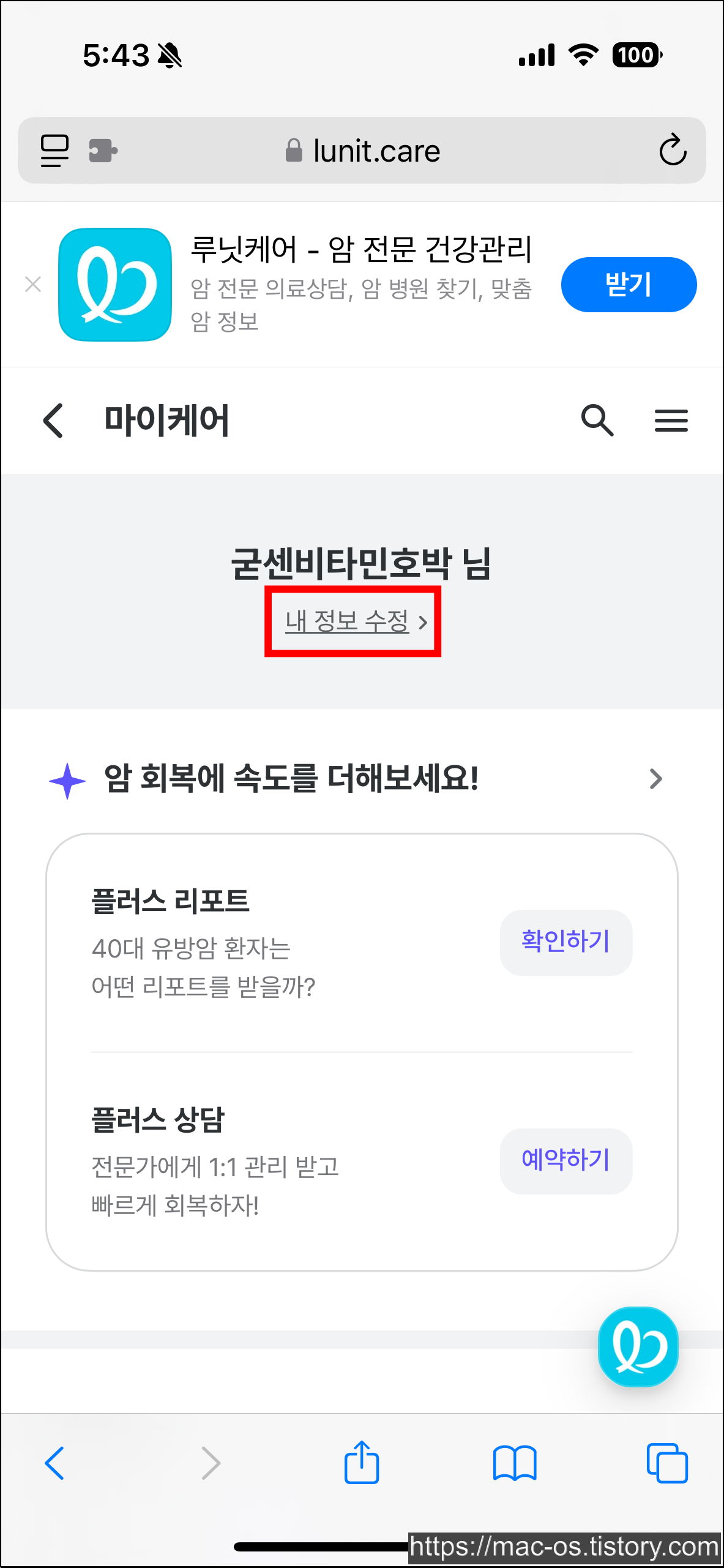 더보기를 누르고 [마이케어]에서 [내 정보 수정]을 순서대로 터치해줍니다.
