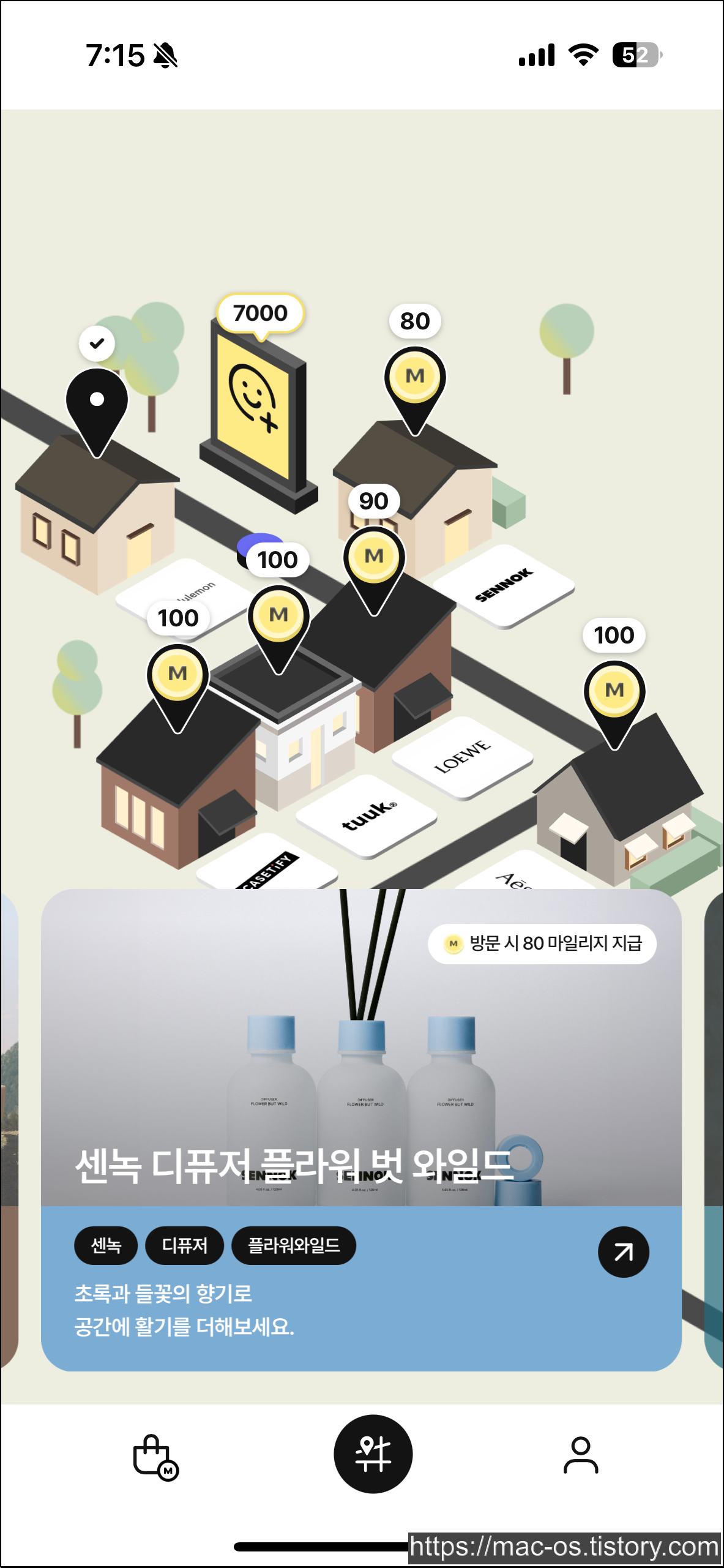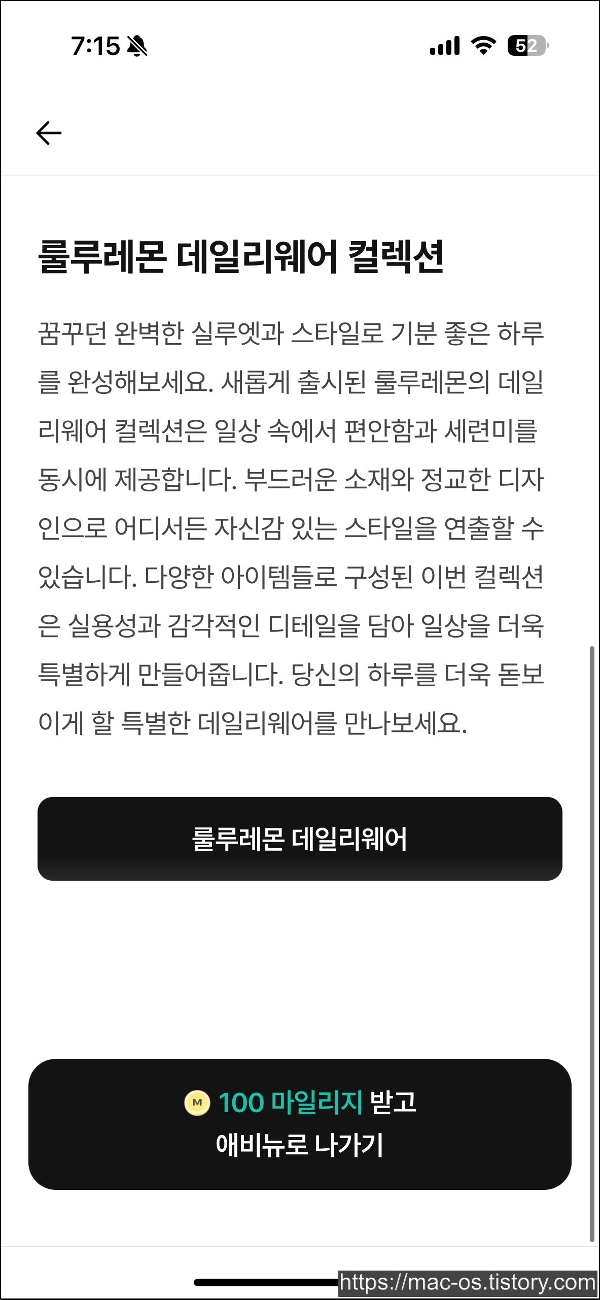 집을 선택하니 룰루레몬 데일리웨어 컬렉션에 대한 영상과 글이 나왔습니다. 스크롤을 아래로 내려서 [100 마일리지 받고 메비뉴로 나가기]를 누르면 100마일리지가 적립됩니다.