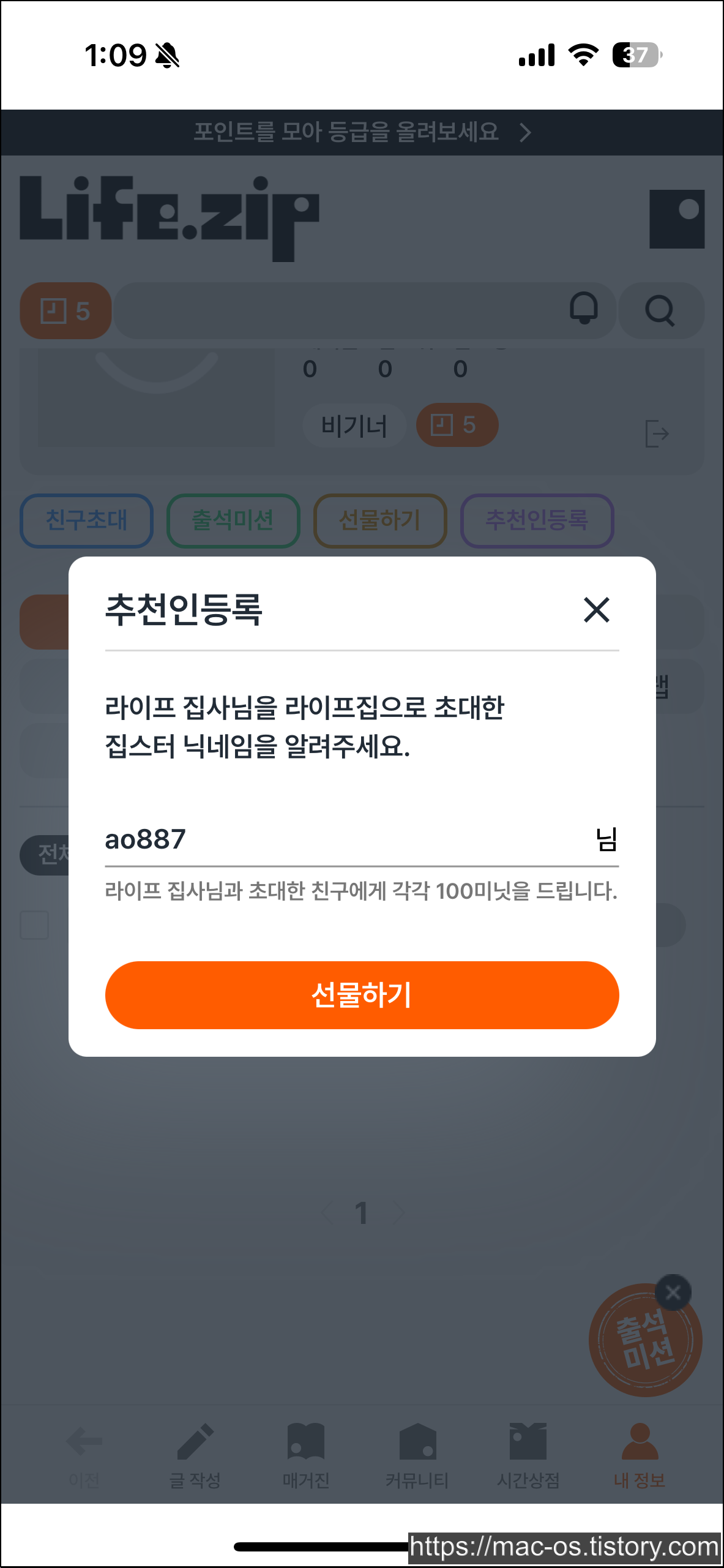 3️⃣ 추천인 닉네임에 ‘ao887’ 입력하면 100미닛 획득!