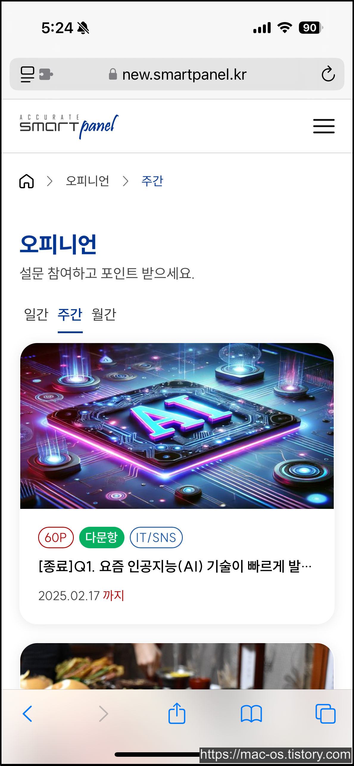 스마트패널 홈페이지에서 오피니언으로 들어가보면 일간/주간/월간으로 나뉘는 간단한 설문이 있습니다. 설문 제목에 [진행중]으로 적혀있으면 참여가 가능한 설문이고, [종료]라고 되어 있으면 이미 끝난 설문입니다.
