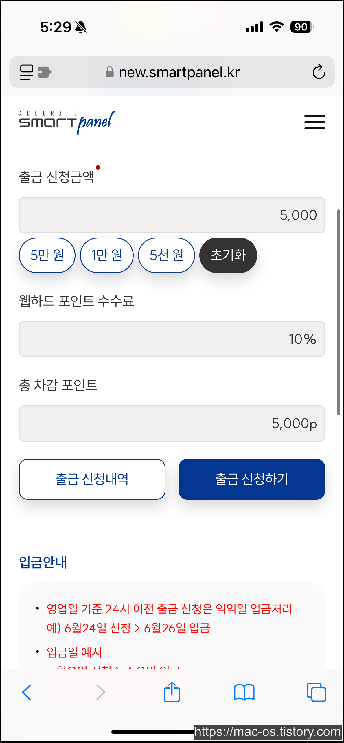 스마트패널에서 설문조사를 통해 얻은 포인트는 현금이체와 기프티콘 구매에 사용이 가능합니다. 우선 현금이체의 경우 설문으로 적립된 포인트는 현금 출금 시 수수료가 없으며, 1일 1회 최소 5천원부터 최대 200만원까지 신청이 가능합니다. 월요일에 신청하면 수요일에 입금되서 보통 2일 정도 걸린다고 하네요.