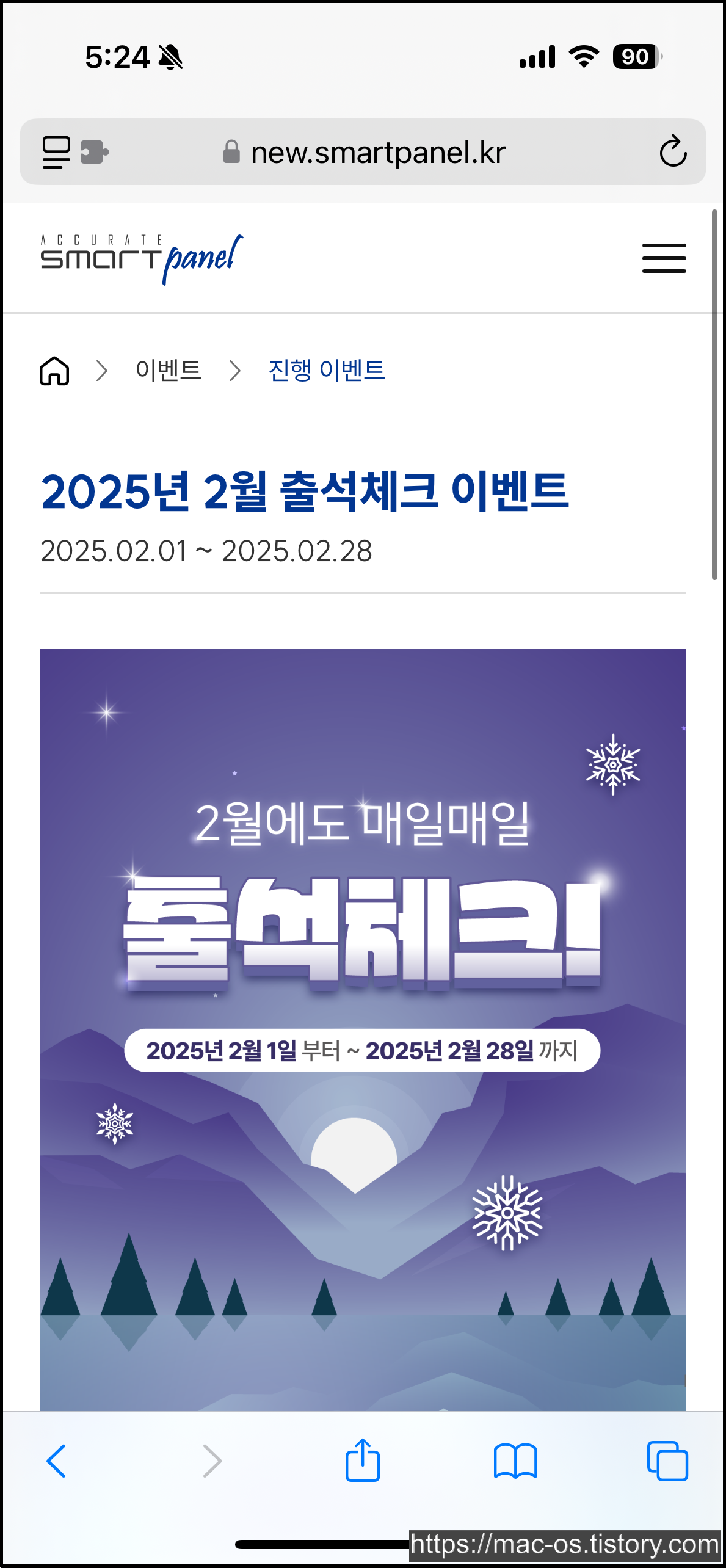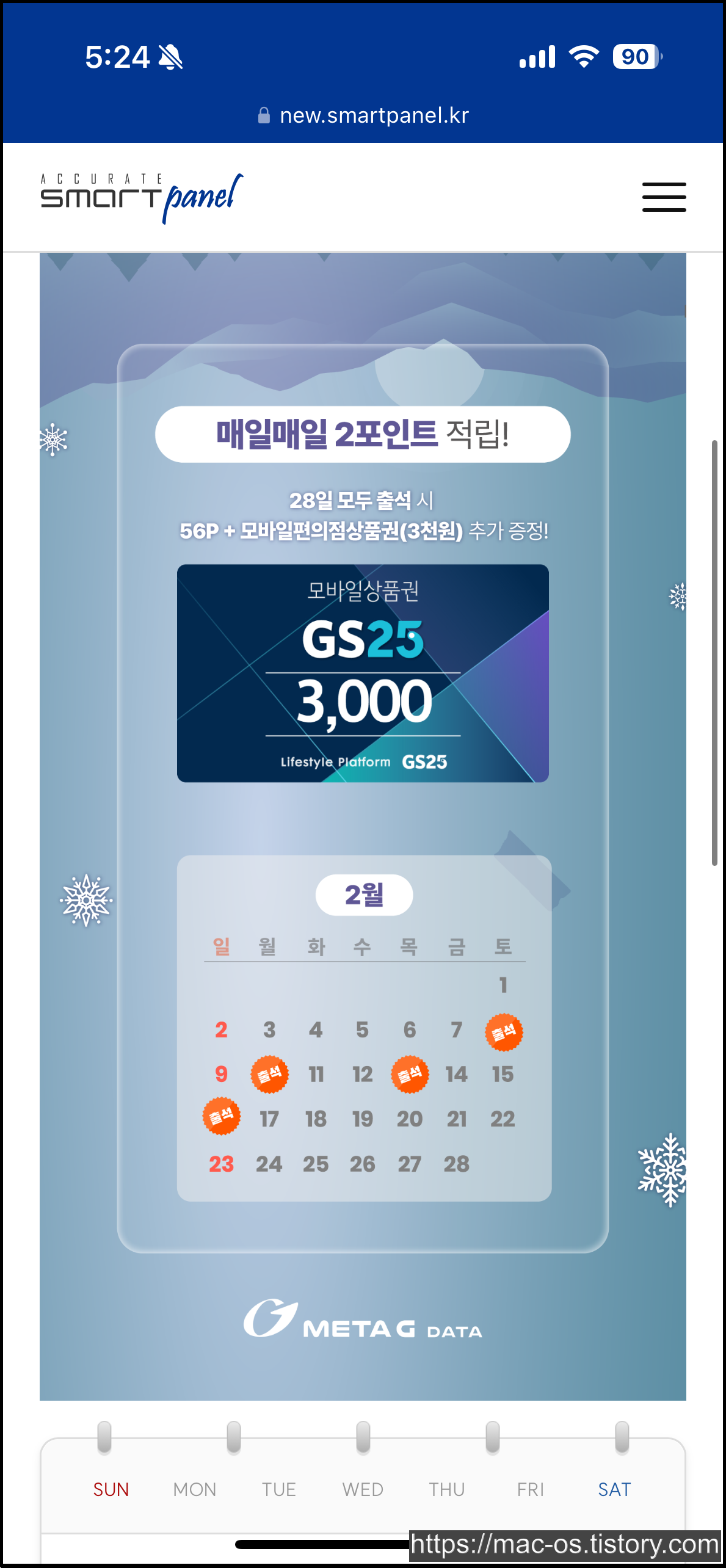 스마트패널에서 진행하고 있는 2025년 2월 출석체크 이벤트입니다. 매일 출석할 때마다 2포인트가 적립되고, 28일 모두 출석한 경우 56포인트와 GS25 3천원 상품권을 주고 있습니다. 이번달의 경우 기간이 이미 지나서 다음달 개근을 노려보는게 좋을 것 같네요.