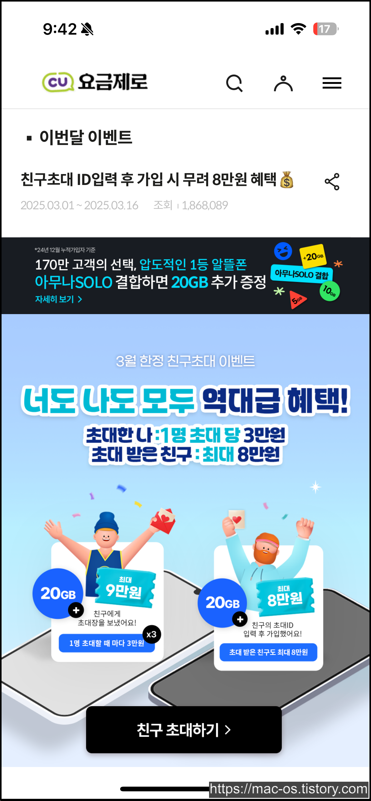 3번째는 위에서 말한 친구초대받아 가입하면 최대 8만원 혜택을 받을 수 있다는 것입니다. 처음 가입할 때 1만 5천원 이상 요금제로 가입하여 네이버페이 5만원 상품권을 받고 요금제를 바꾸는 것도 좋아보입니다.
