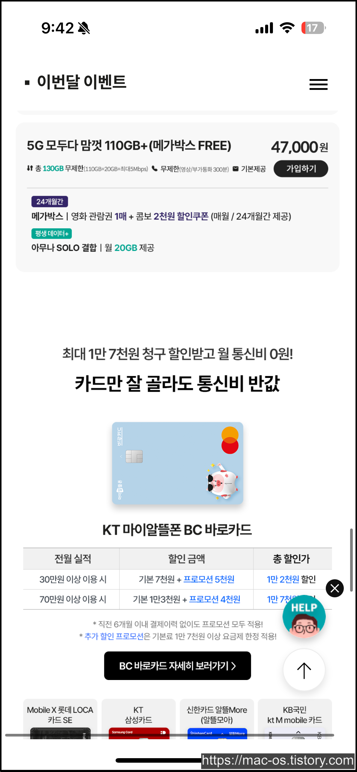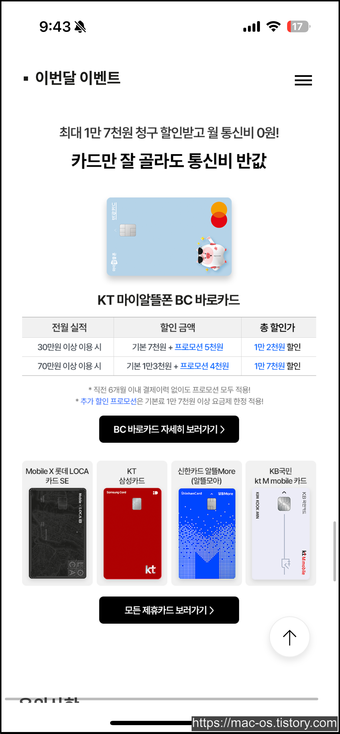 KT 마이알뜰폰 BC 바로카드를 이용하면 최대 1만 7천원 청구 할인받고 월 통신비 0원 혜택을 누릴 수 있습니다. 전월 실적 30만원 이상, 70만원 이상 조건이 있으며 순서대로 1만 2천원 할인, 1만 7천원 할인이 됩니다.
