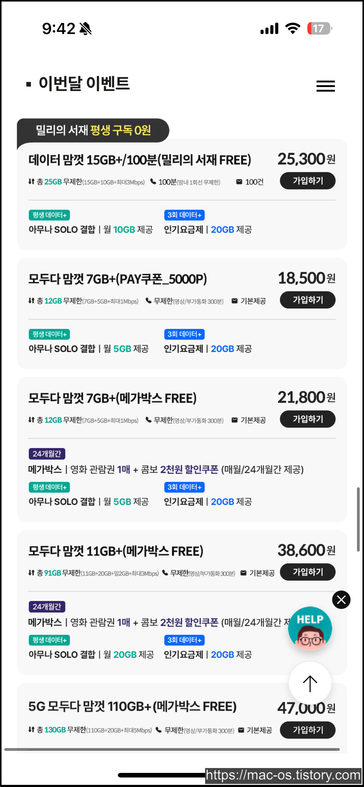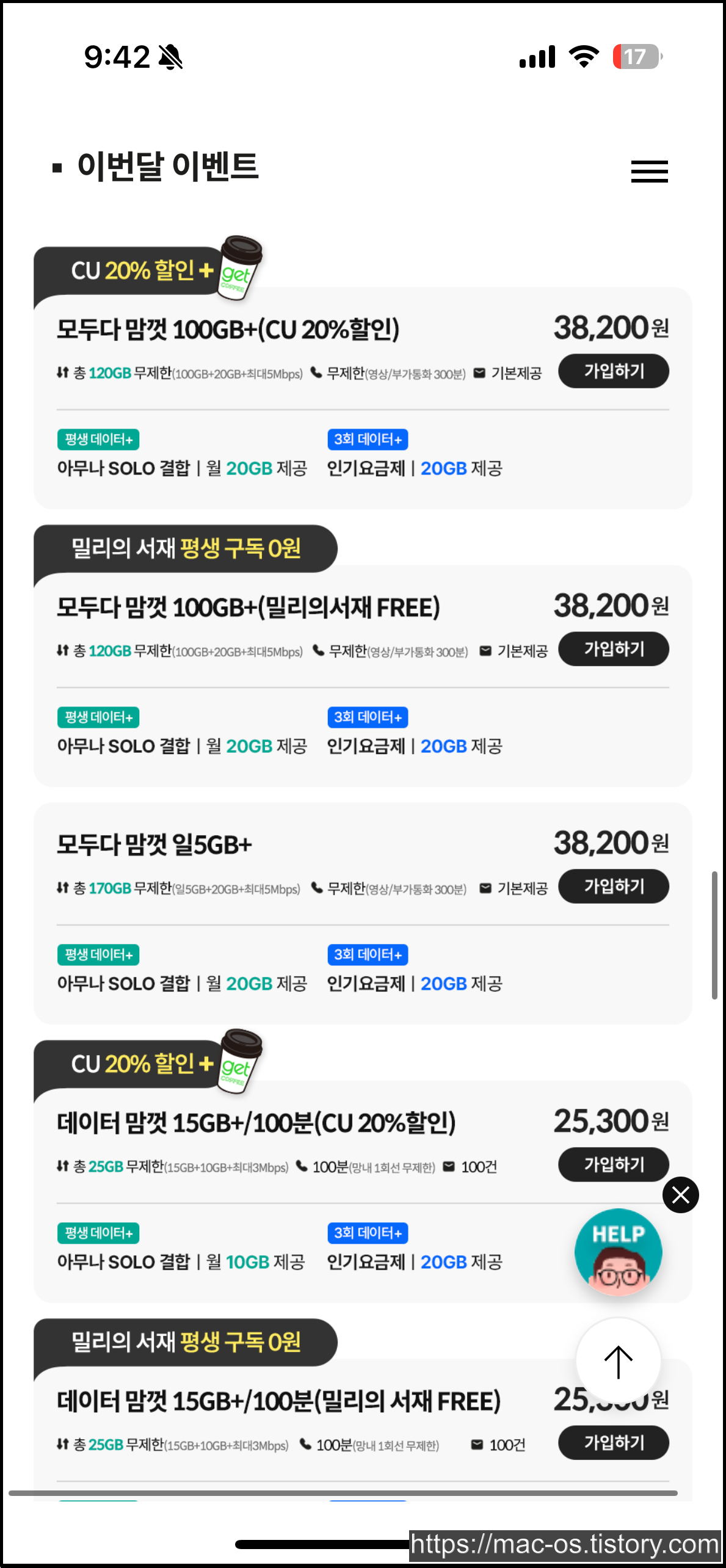 kt m모바일에서 현재 가입 가능한 요금제 목록입니다. CU 20% 할인, 밀리의 서재 평생 구독 0원 등 추가 혜택이 있구요. 본인이 원하는 요금제의 추가 혜택이 어떤지 잘 확인해서 선택하는게 좋아보입니다.