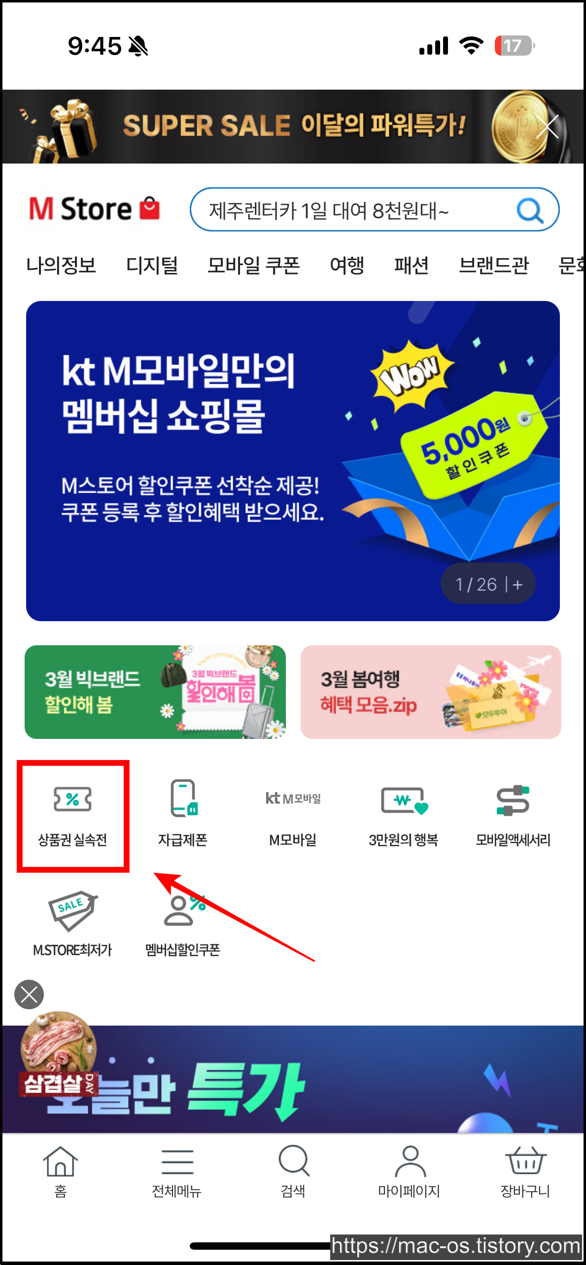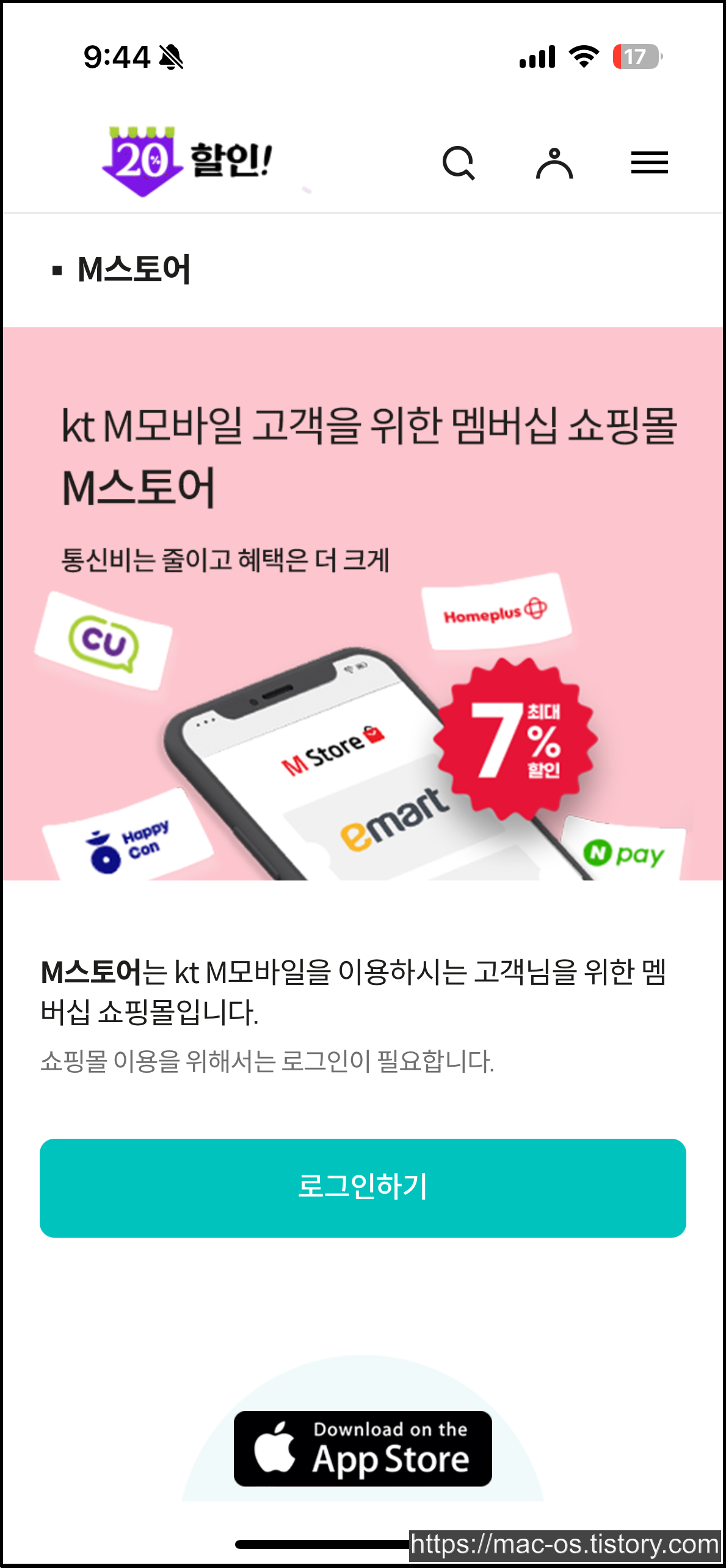 M스토어 포인트는 kt m모바일 앱에서 m스토어로 이동하여 사용할 수 있습니다. m스토어 페이지에서 로그인하기를 눌러 m스토어 홈페이지로 이동합니다. 그리고 상품권 실속전을 누릅니다.