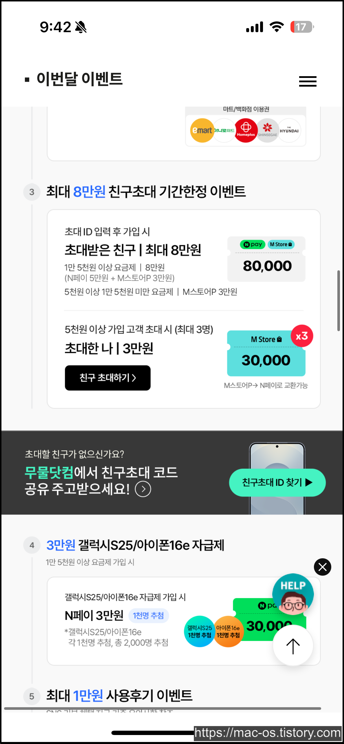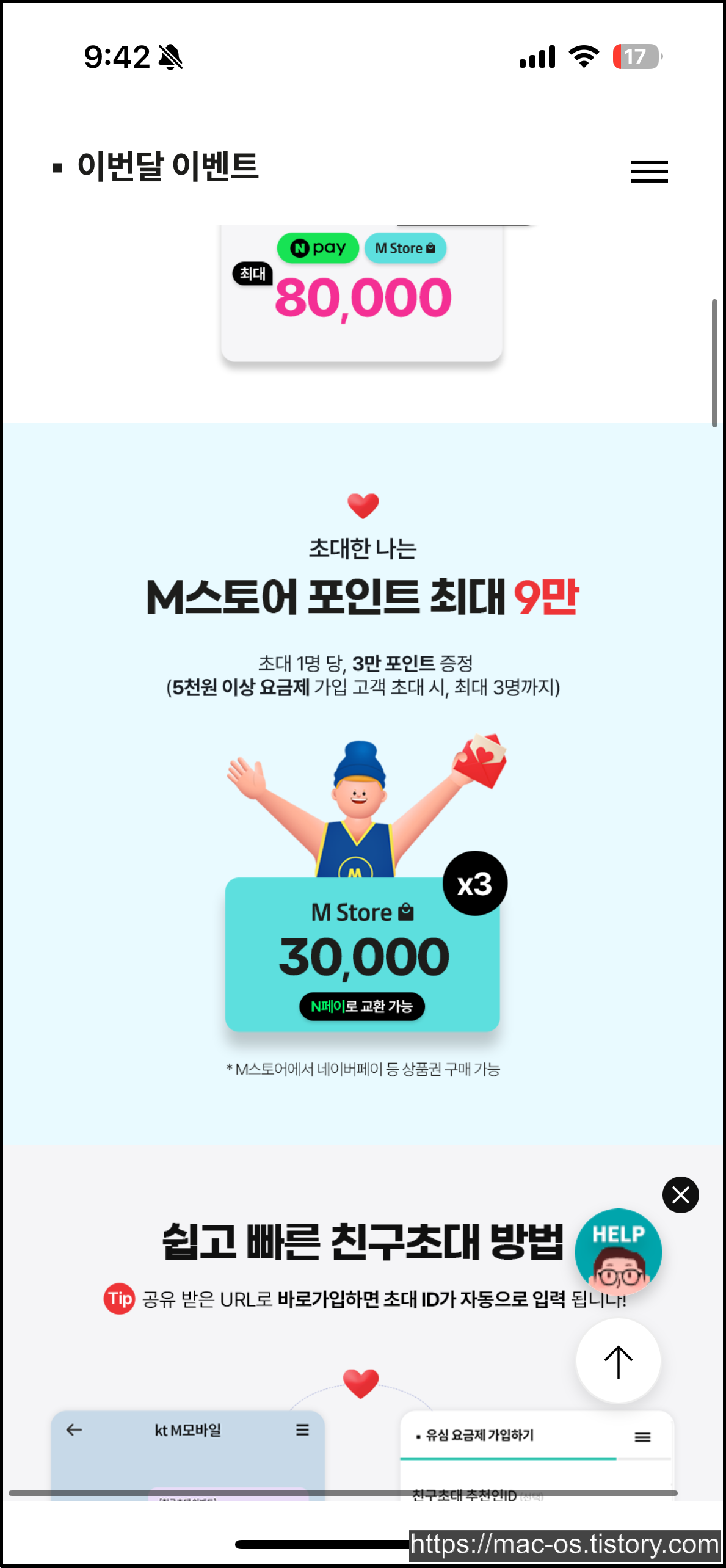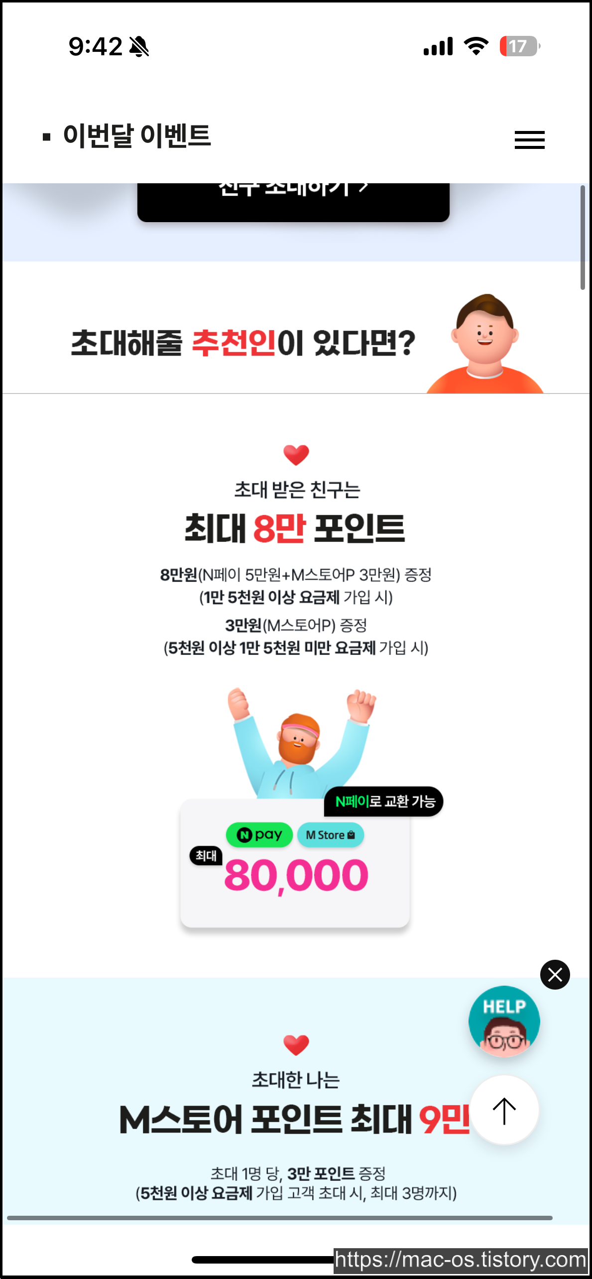 초대 받은 친구는 최대 8만 포인트(네이버페이 5만원+M스토어 3만원)가 증정되는데요. 하지만 1만 5천원 이상 요금제 가입 시라는 조건이 있고, 5천원 이상 1만 5천원 미만 요금제 가입 시 3만 M스토어 포인트만 제공됩니다.