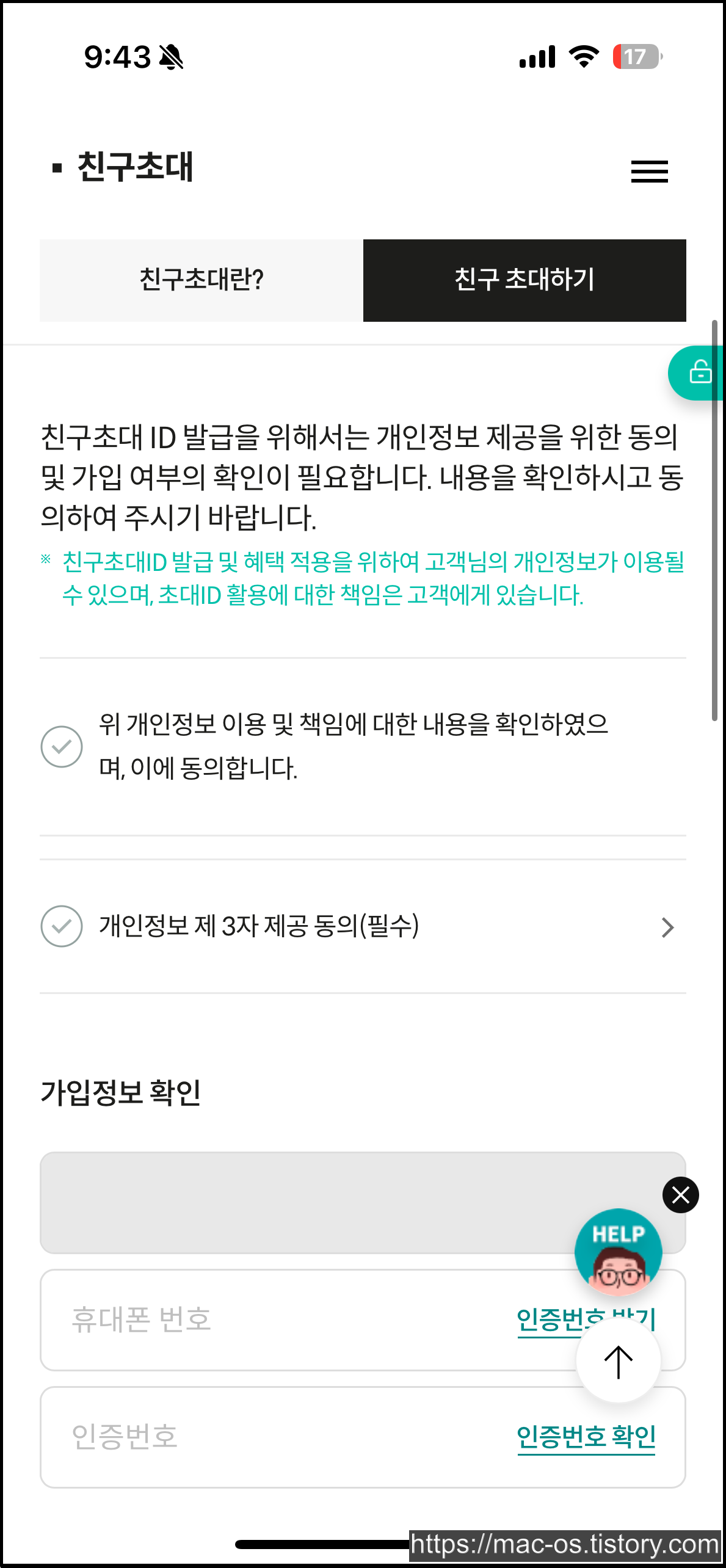 친구초대 페이지에서 친구 초대하기 버튼을 누르고 휴대폰 문자인증을 받으면 나의 친구초대 추천 URL을 발급받을 수 있습니다. 그리고 해당 URL의 마지막 부분을 보고 본인의 추천인ID를 확인이 가능합니다.