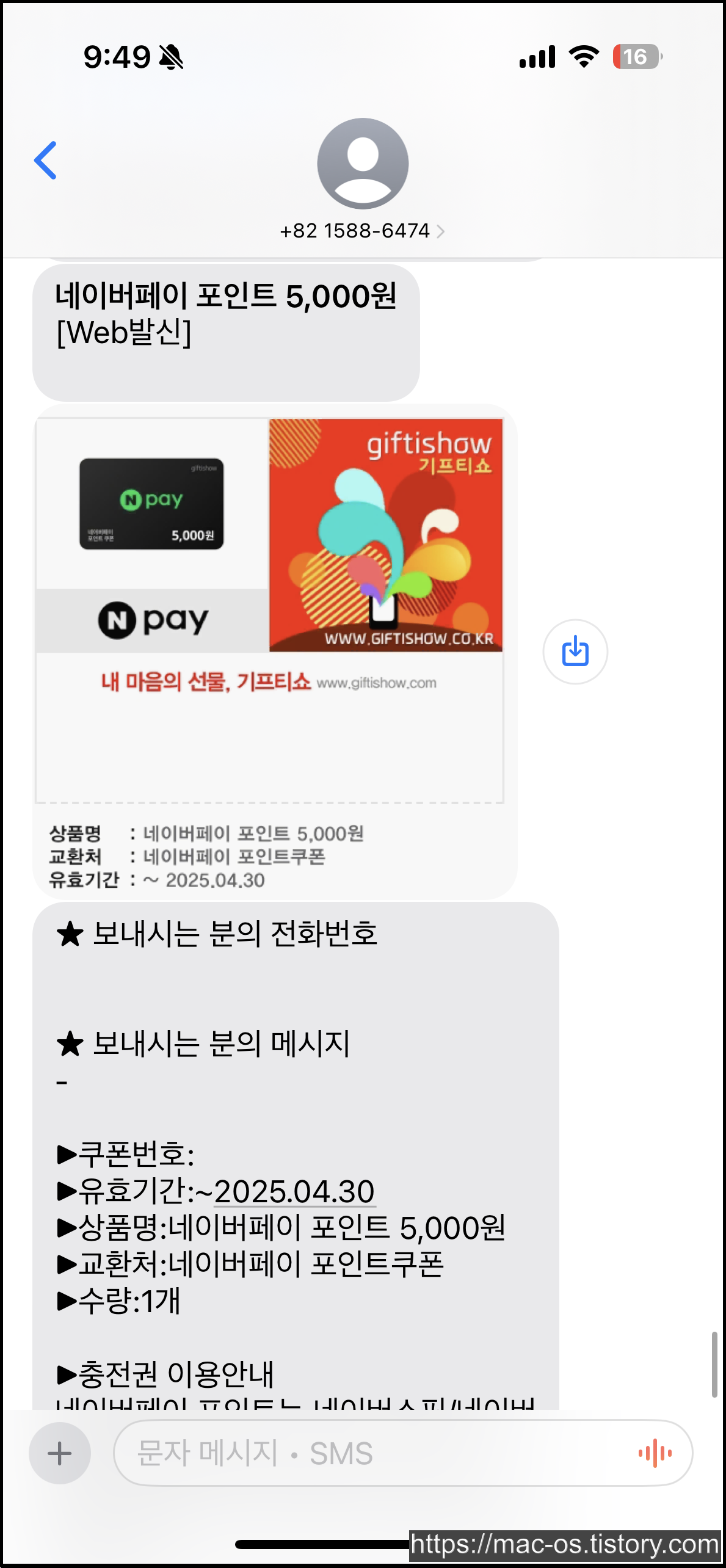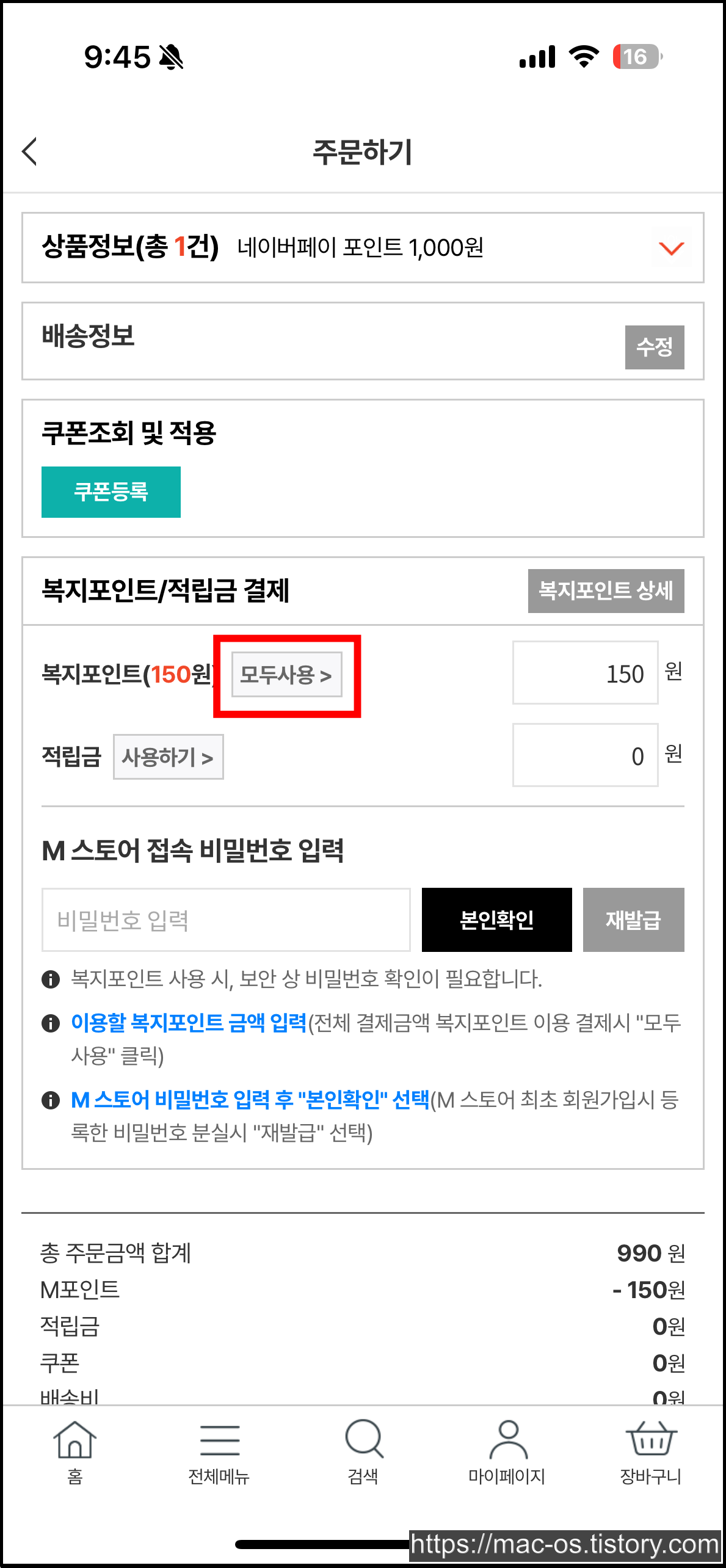 상품을 선택해서 결제 페이지로 이동하면 복지포인트(150원)에서 [모두 사용] 버튼을 눌러 M스토어 포인트를 현금처럼 사용할 수 있습니다. 그리고 M스토어 비밀번호를 입력하고 결제를 완료하면 문자로 네이버페이 상품권 쿠폰번호를 이렇게 알려줍니다.