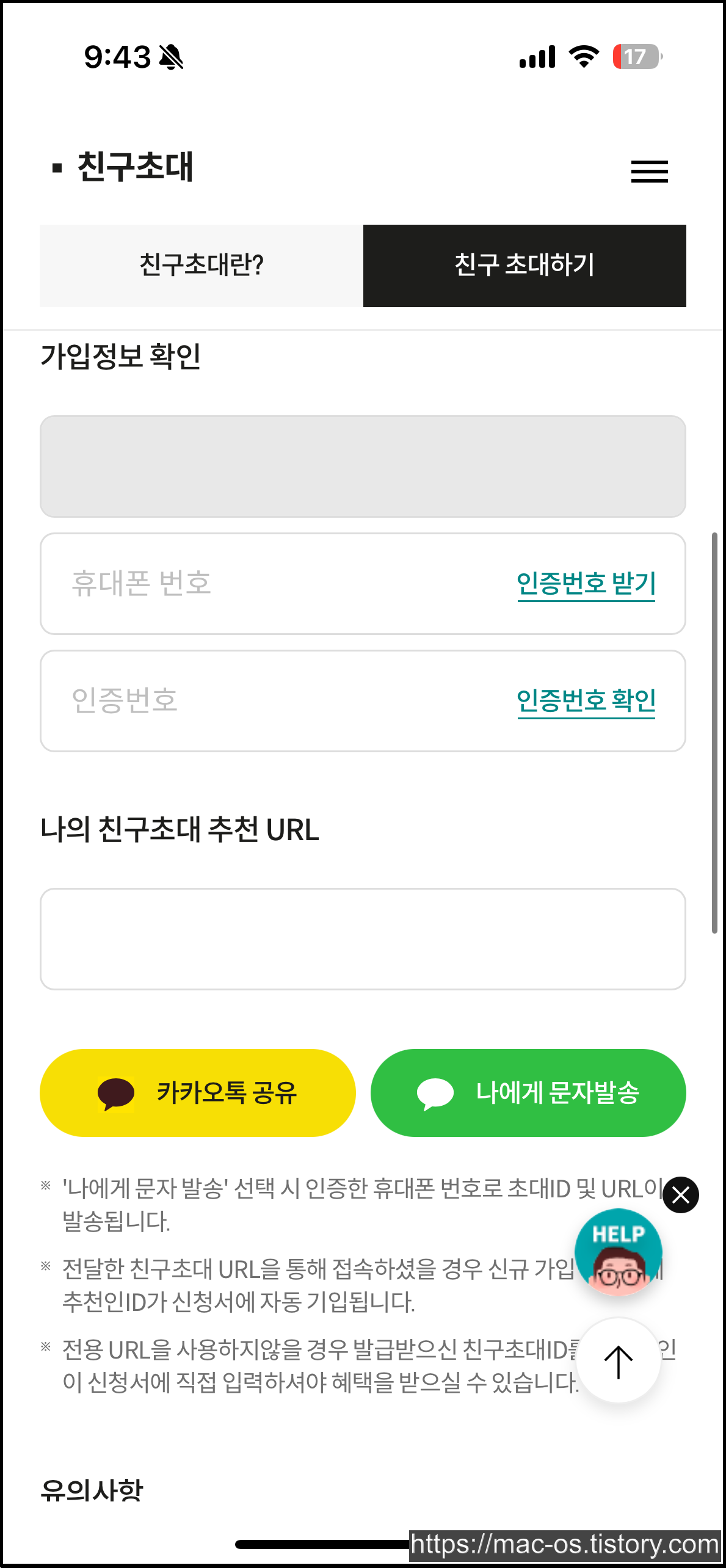 친구초대 페이지에서 친구 초대하기 버튼을 누르고 휴대폰 문자인증을 받으면 나의 친구초대 추천 URL을 발급받을 수 있습니다. 그리고 해당 URL의 마지막 부분을 보고 본인의 추천인ID를 확인이 가능합니다.