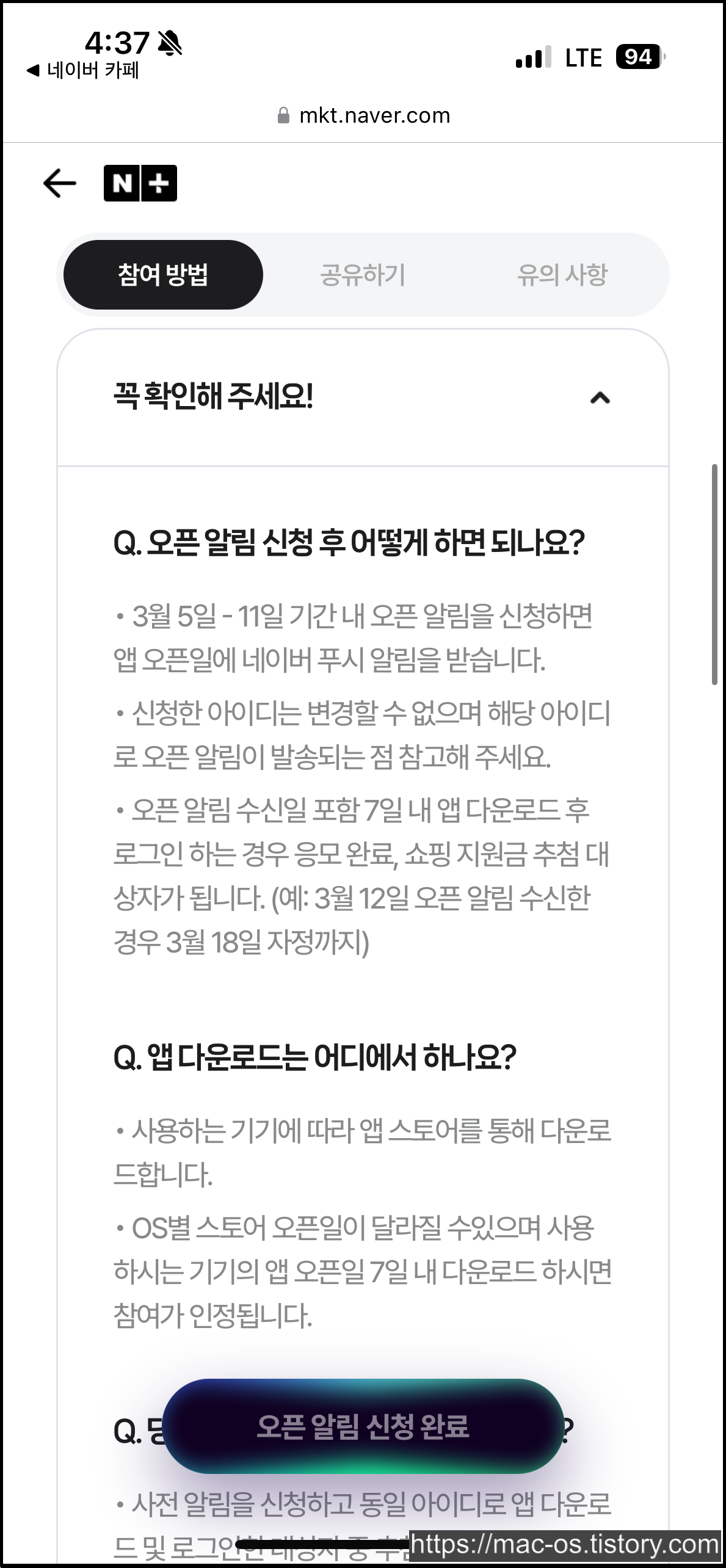 공유한 사람과 동일하게 '오픈 알림 신청' 후 앱 오픈 알림을 받고, 7일 이내 다운로드 및 로그인해야 응모가 완료됩니다.