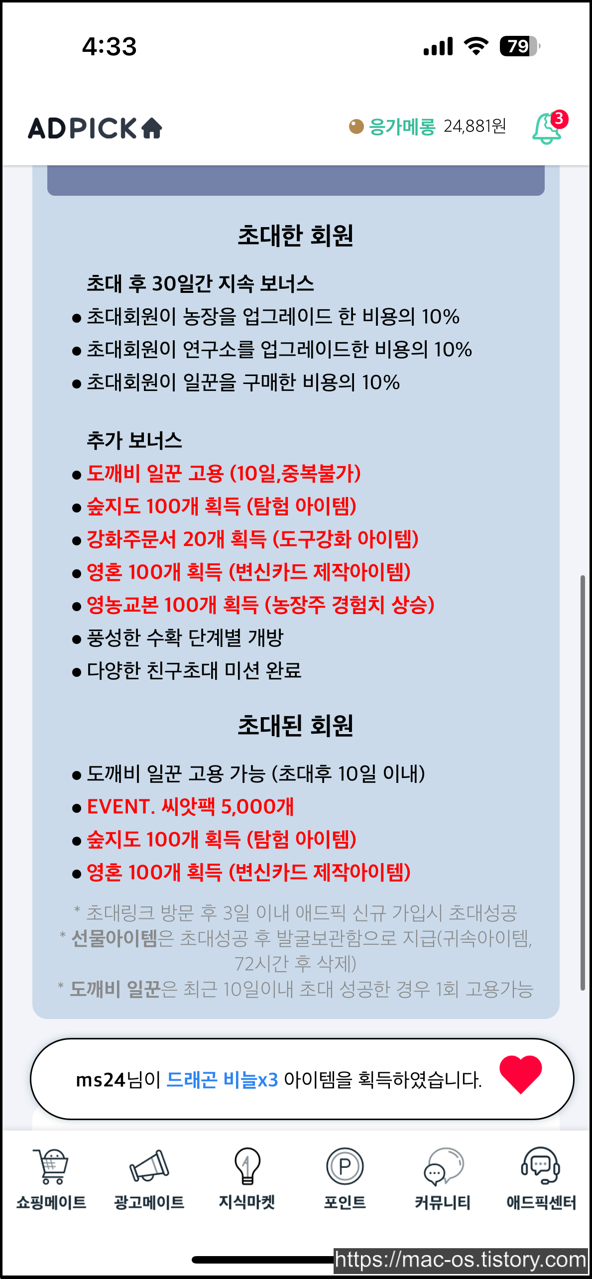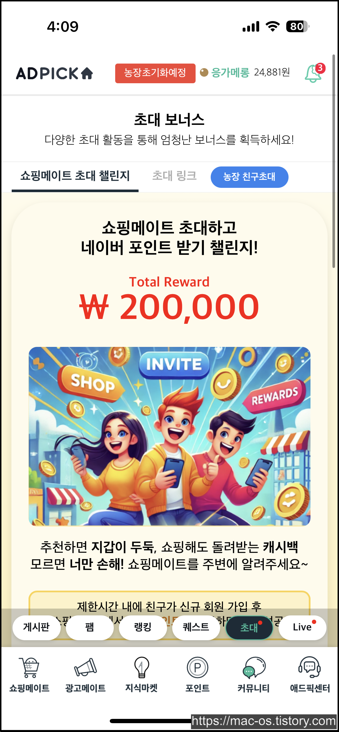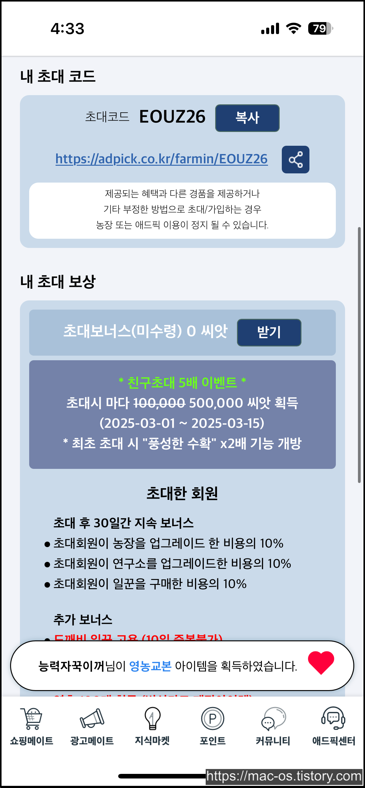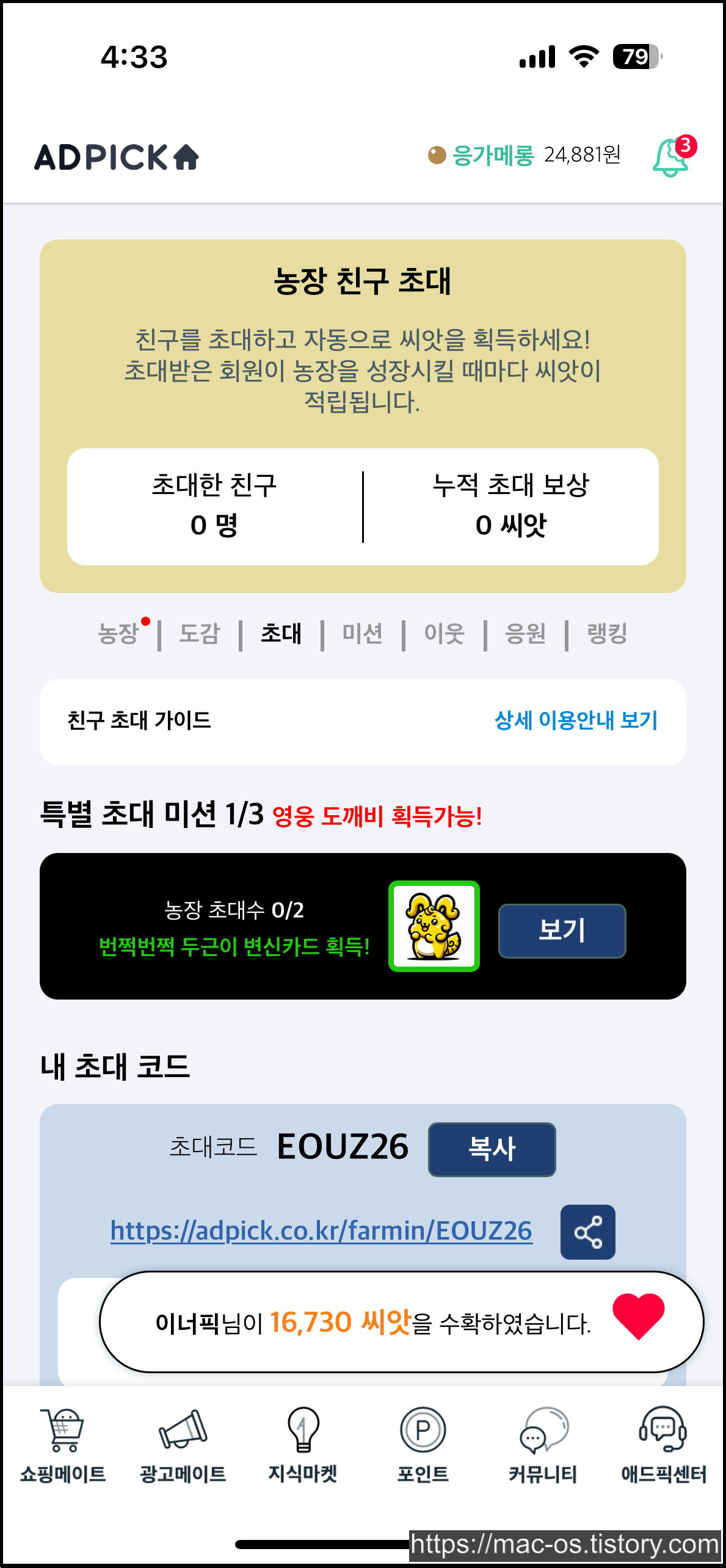 애드픽에선 농장이라는 특이한 컨텐츠가 있습니다. 농장 친구초대로 가입하는 경우, 농장 컨텐츠에서 유용하게 사용할 수 있는 각종 아이템을 보상으로 받을 수 있습니다. 그런데 농장으로 가입하면 쇼핑메이트 챌린지처럼 기존 초대링크 보상을 받지 못할 것 같아서 비추입니다.