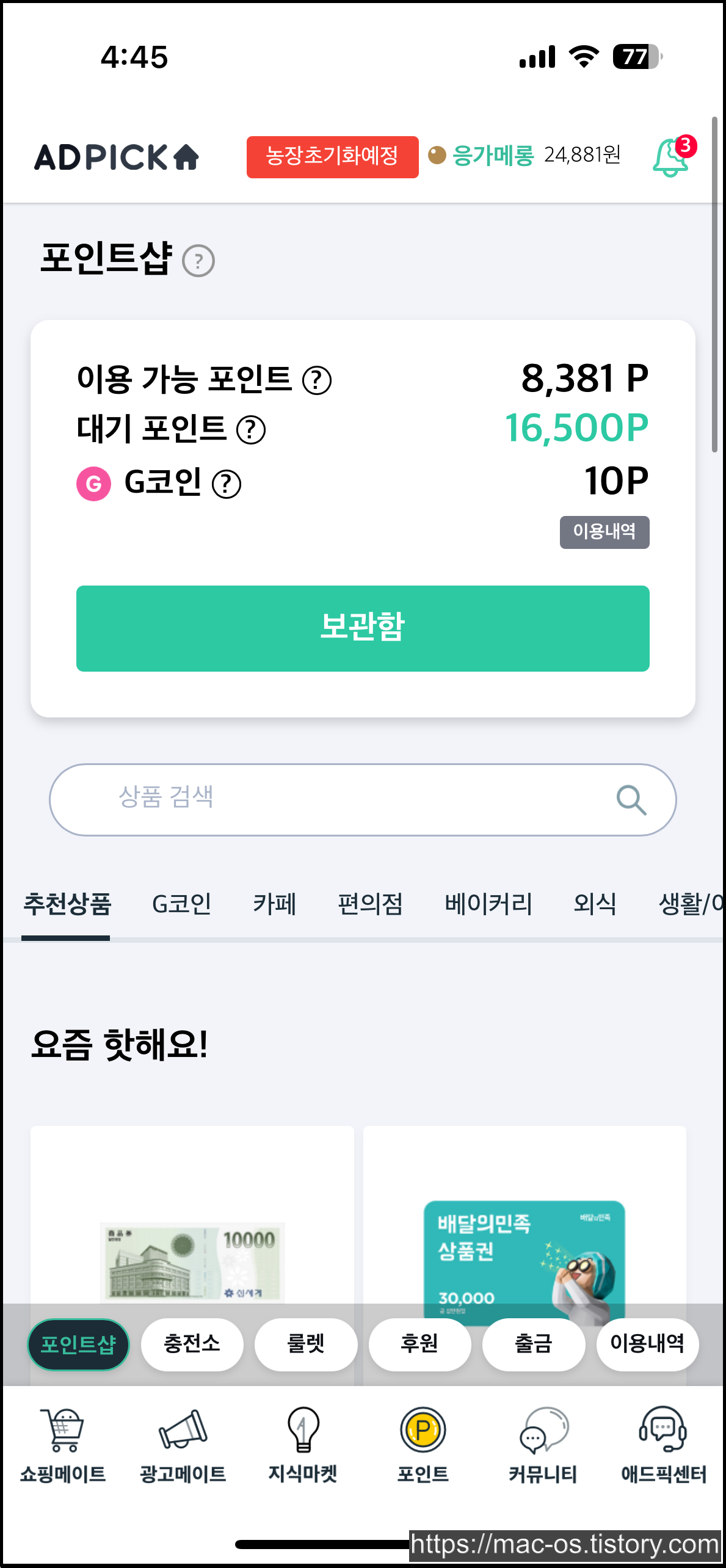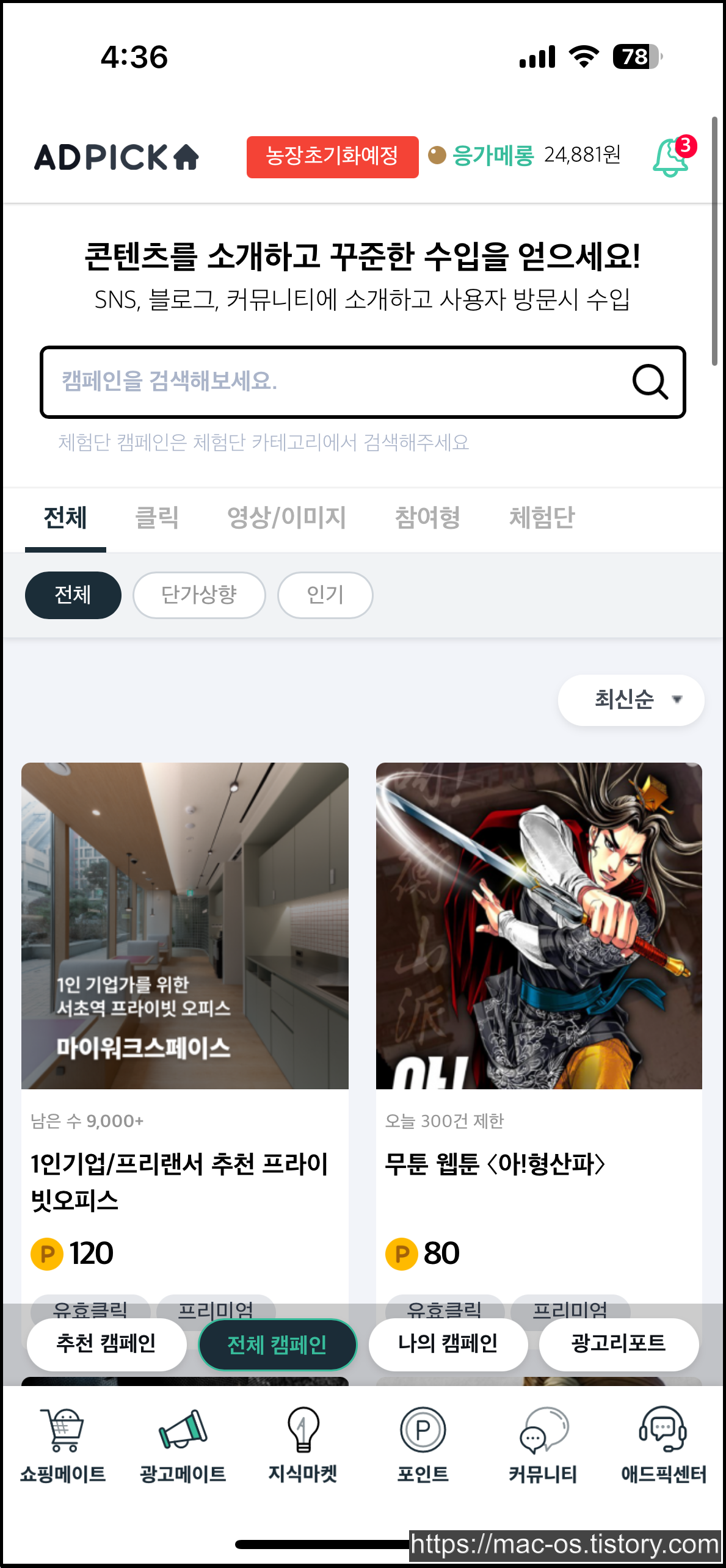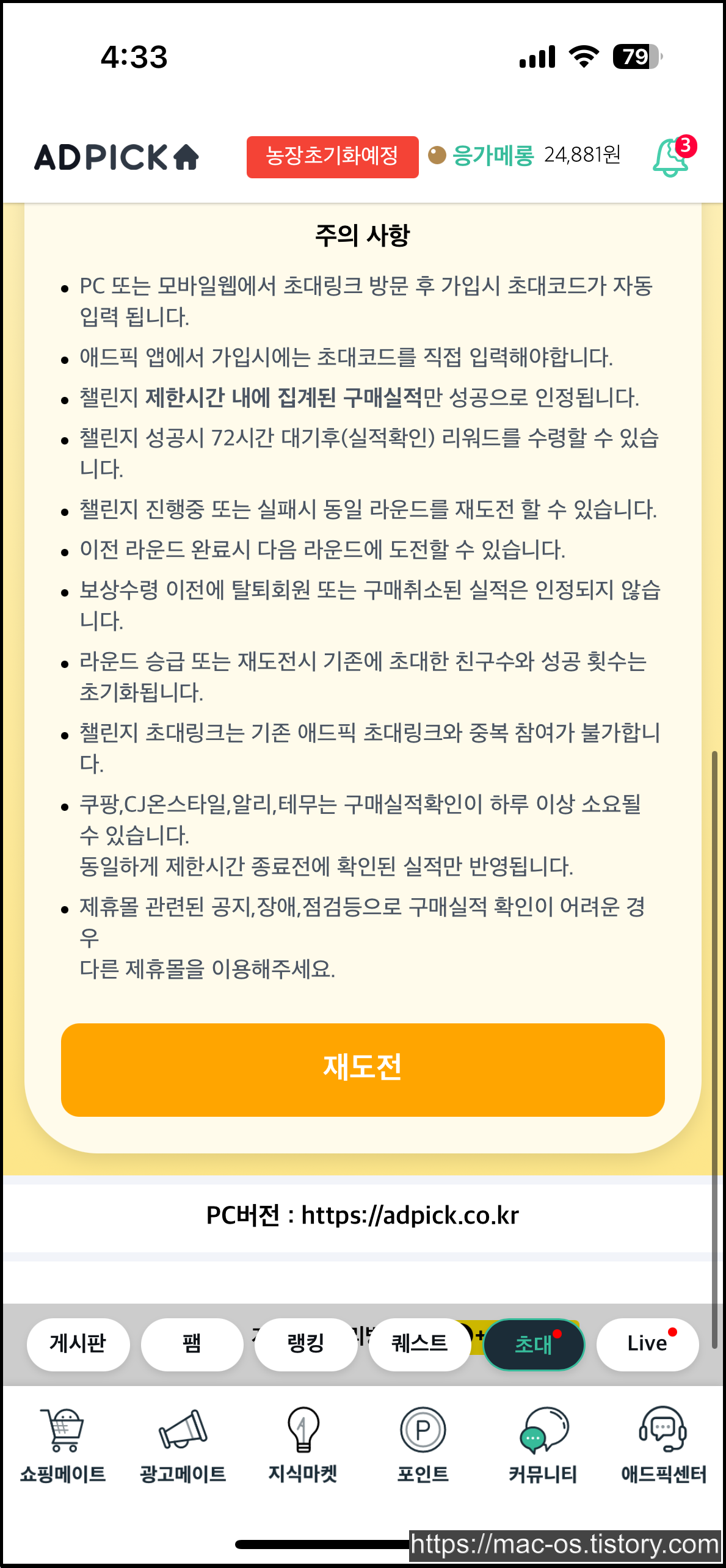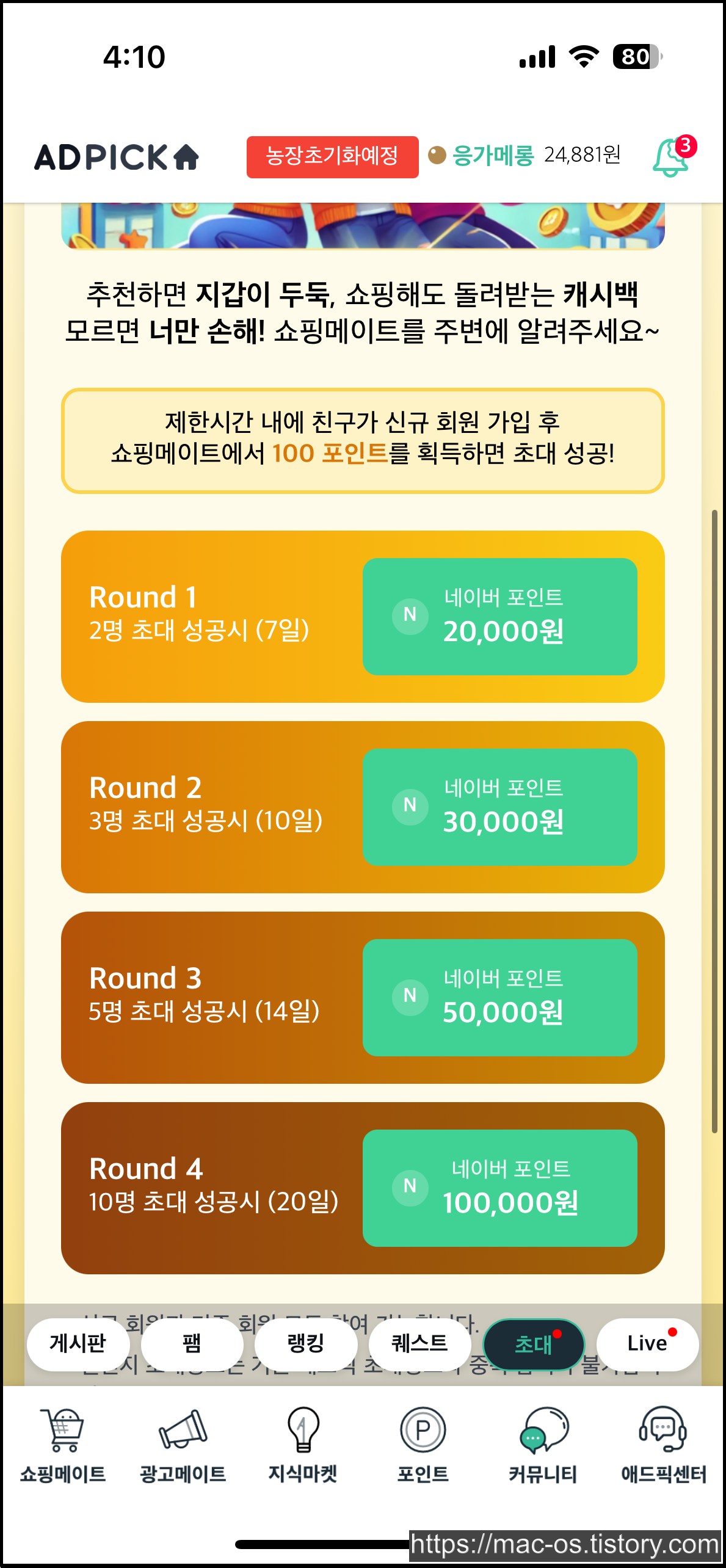 애드픽에선 농장이라는 특이한 컨텐츠가 있습니다. 농장 친구초대로 가입하는 경우, 농장 컨텐츠에서 유용하게 사용할 수 있는 각종 아이템을 보상으로 받을 수 있습니다. 그런데 농장으로 가입하면 쇼핑메이트 챌린지처럼 기존 초대링크 보상을 받지 못할 것 같아서 비추입니다.