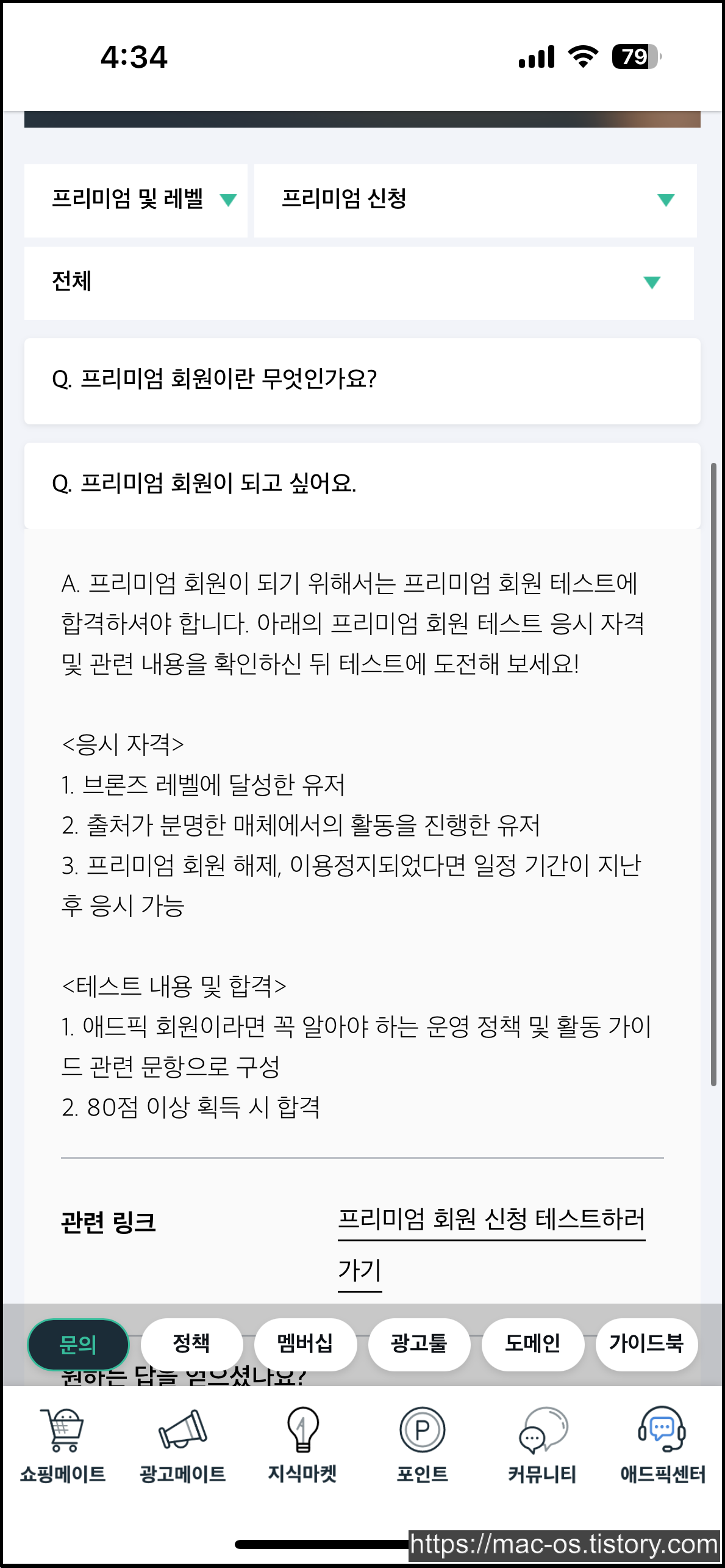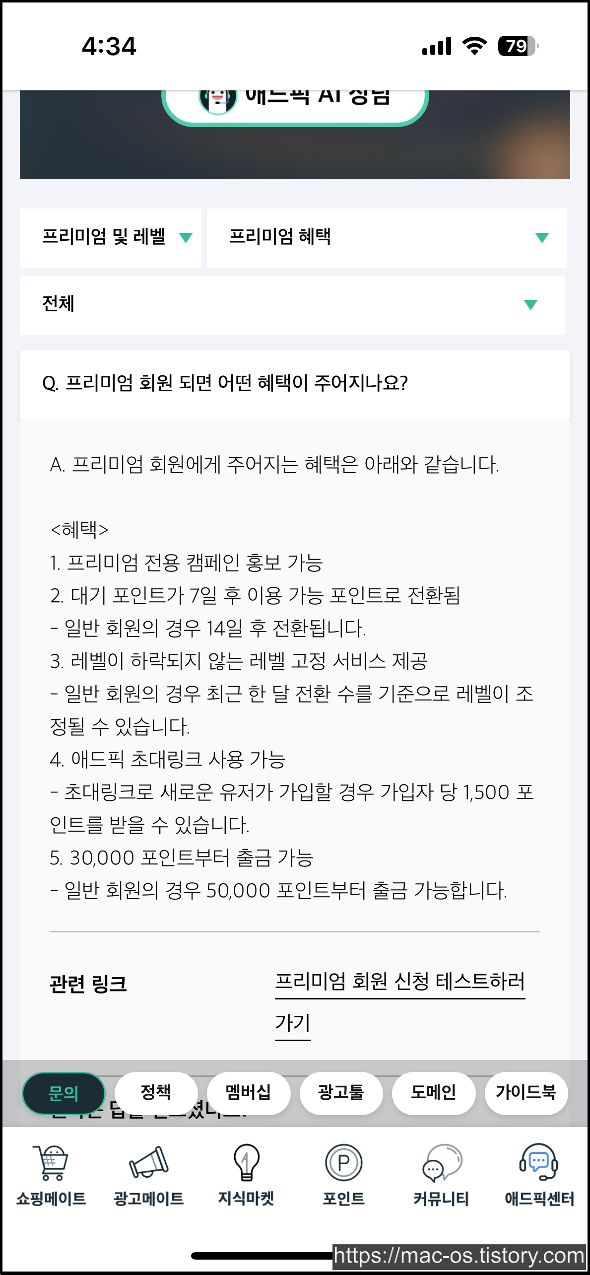 첫번째로 소개한 기존 초대링크를 통해 가입하면 가입 즉시 1000포인트를 받을 수 있고, 프리미엄 회원이 되면 2000포인트를 보너스로 받을 수 있다고 했습니다. 프리미엄 회원이 되는 것은 어렵지 않습니다. 그냥 애드픽 앱 관련 수칙 같은 것을 이해하고 간단한 문제를 풀면 회원이 되어 각종 혜택을 받을 수 있습니다.