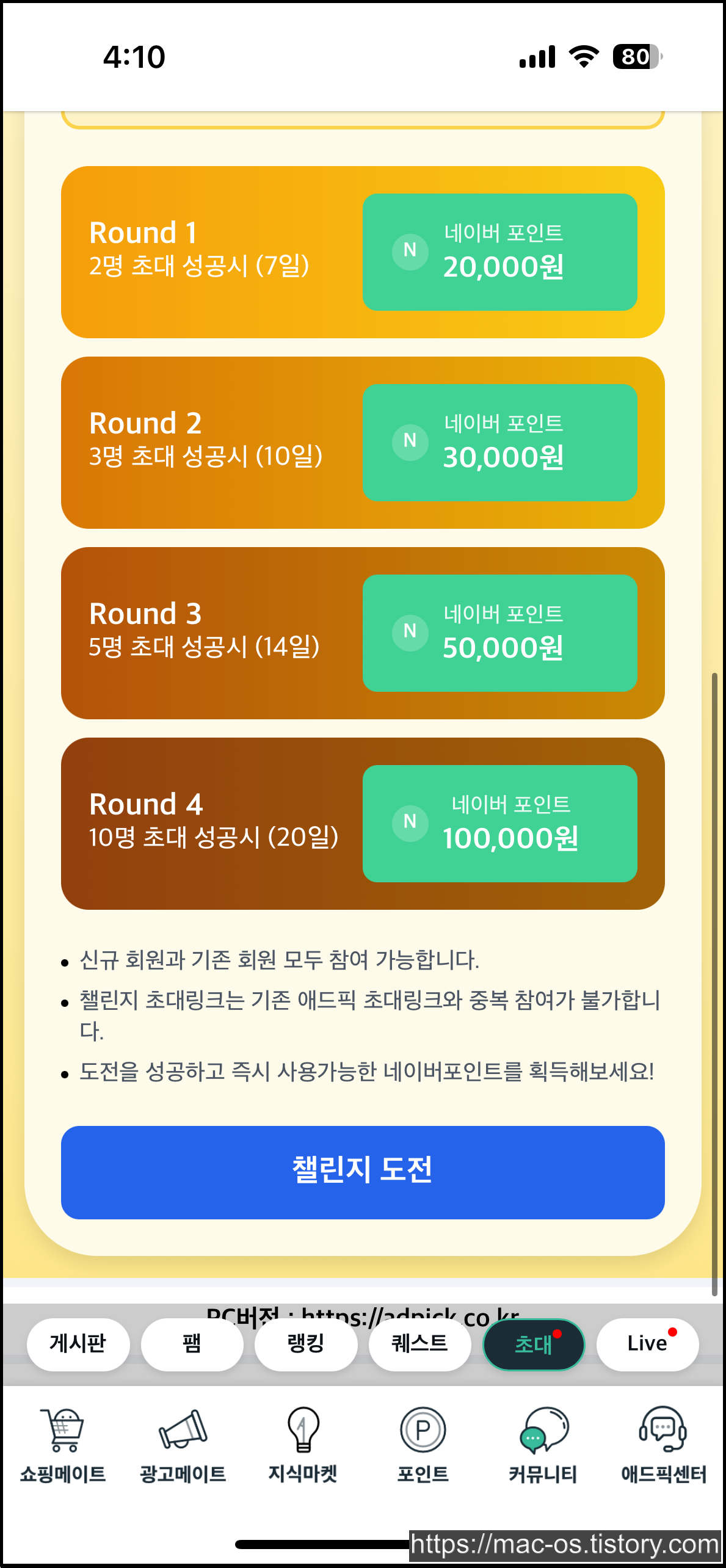 챌린지 도전 버튼을 누르면 라운드 1이 시작되며, 참여 방법과 주의 사항을 확인할 수 있습니다. 7일 이내에 쇼핑 친구 2명을 초대하면 네이버페이 포인트 2만원이 보상으로 지급됩니다. 챌린지 초대 링크는 기존 애드픽 초대링크와 중복 참여가 불가능하기 때문에 이 링크로 초대하면 신규회원은 위에서 소개한 3000포인트(아마 2000포인트가 적용 안될듯)에서 일부 획득하지 못할 것으로 보입니다.