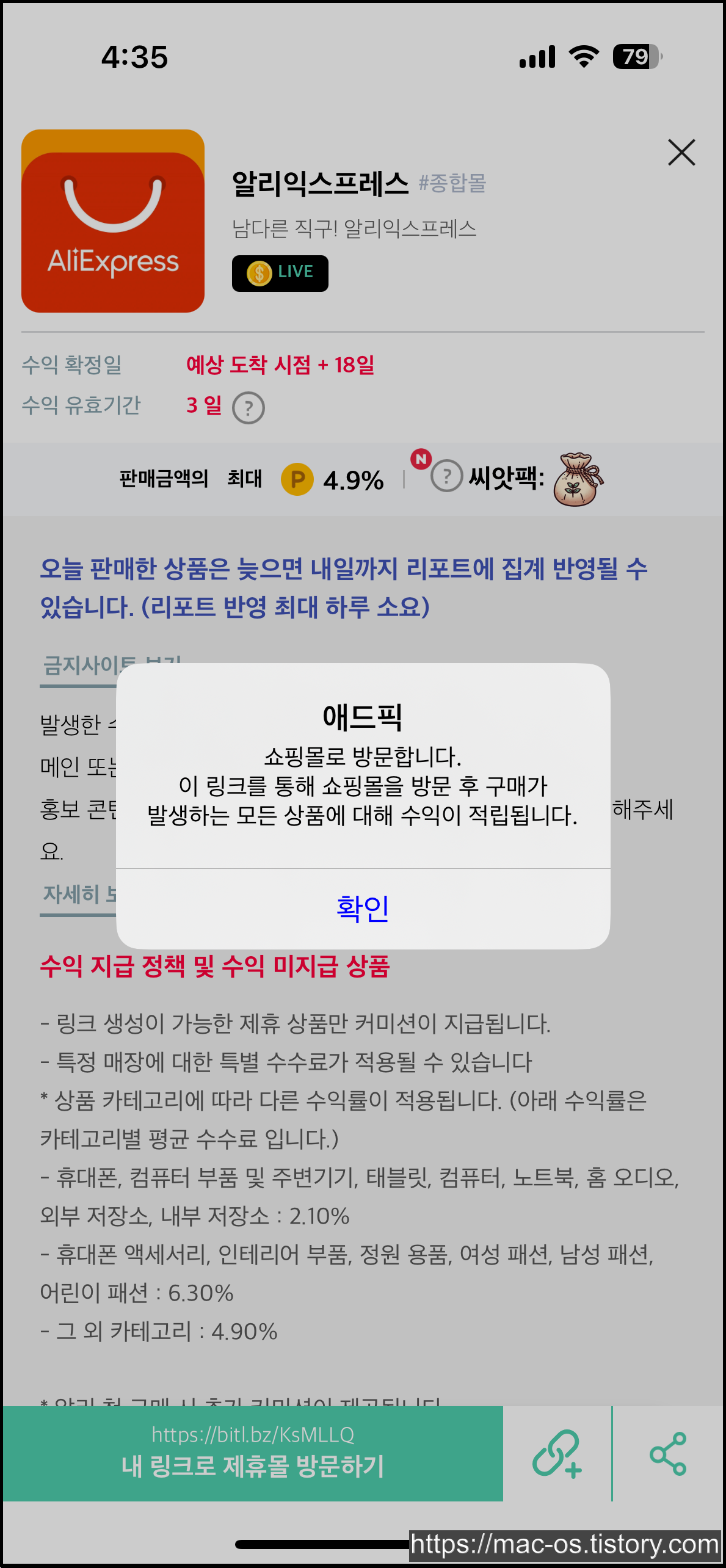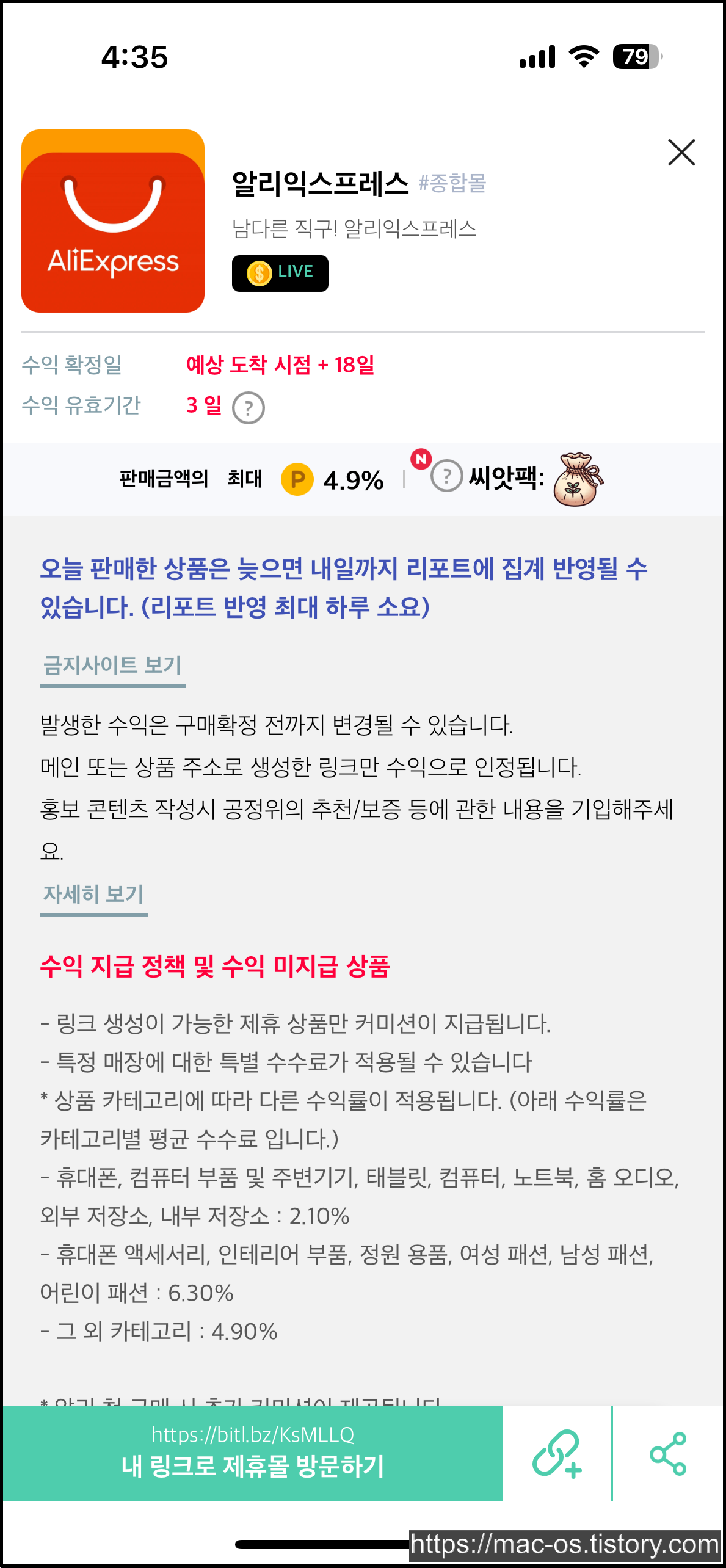 알리익스프레스 캠페인을 터치하면 화면 하단에 보이는 링크가 내 URL 주소입니다. 이걸 블로그나 유튜브, 인스타, 페이스북 등에 공유해서 다른 사람이 이 URL 주소를 클릭해서 알리익스프레스 상품을 구매하면 결제 금액의 4.9%만큼 내가 받을 수 있습니다.