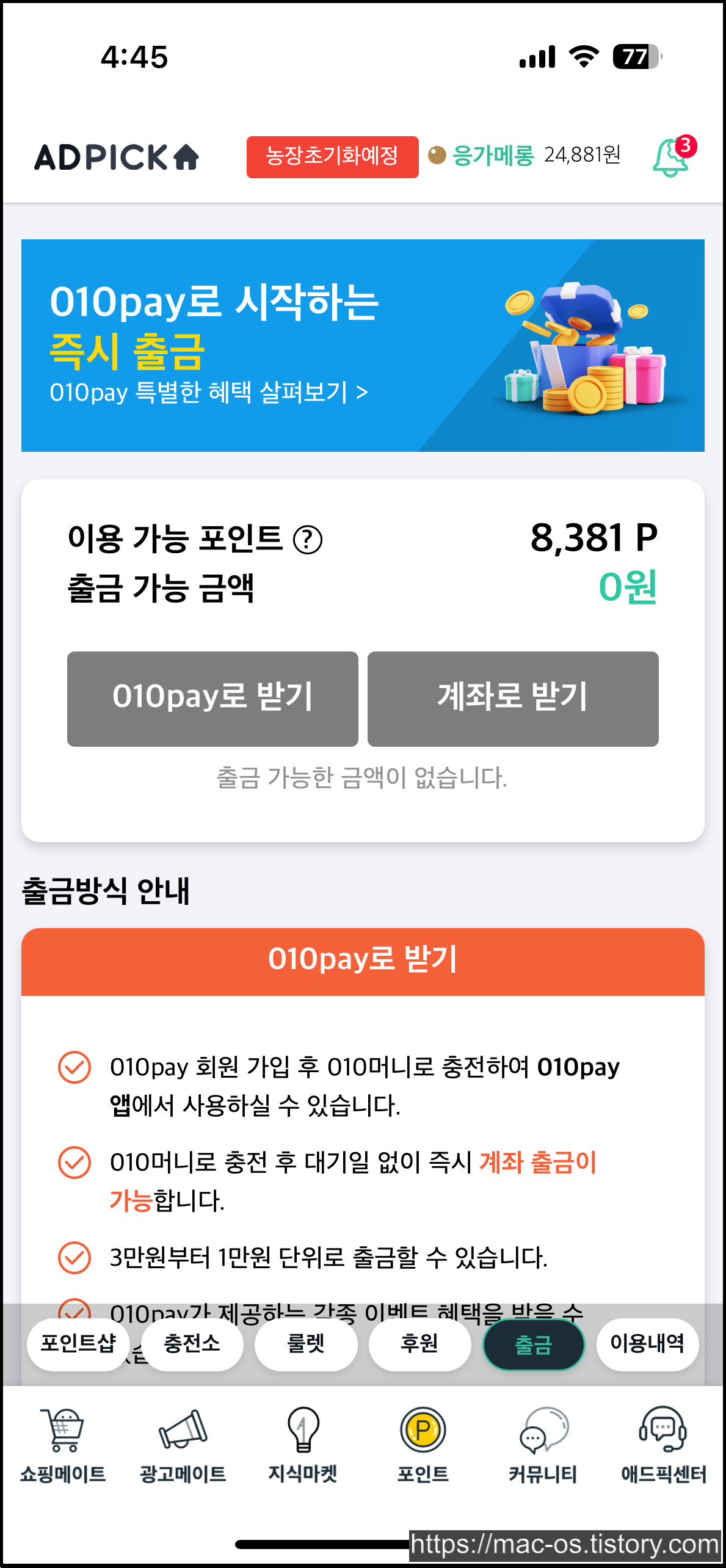 마지막으로 애드픽에서 얻은 포인트는 010pay로 받거나 본인 계좌로 출금, 신세계 상품권이나 배달의 민족 상품권 등을 구매하는 용도로 사용할 수 있습니다.