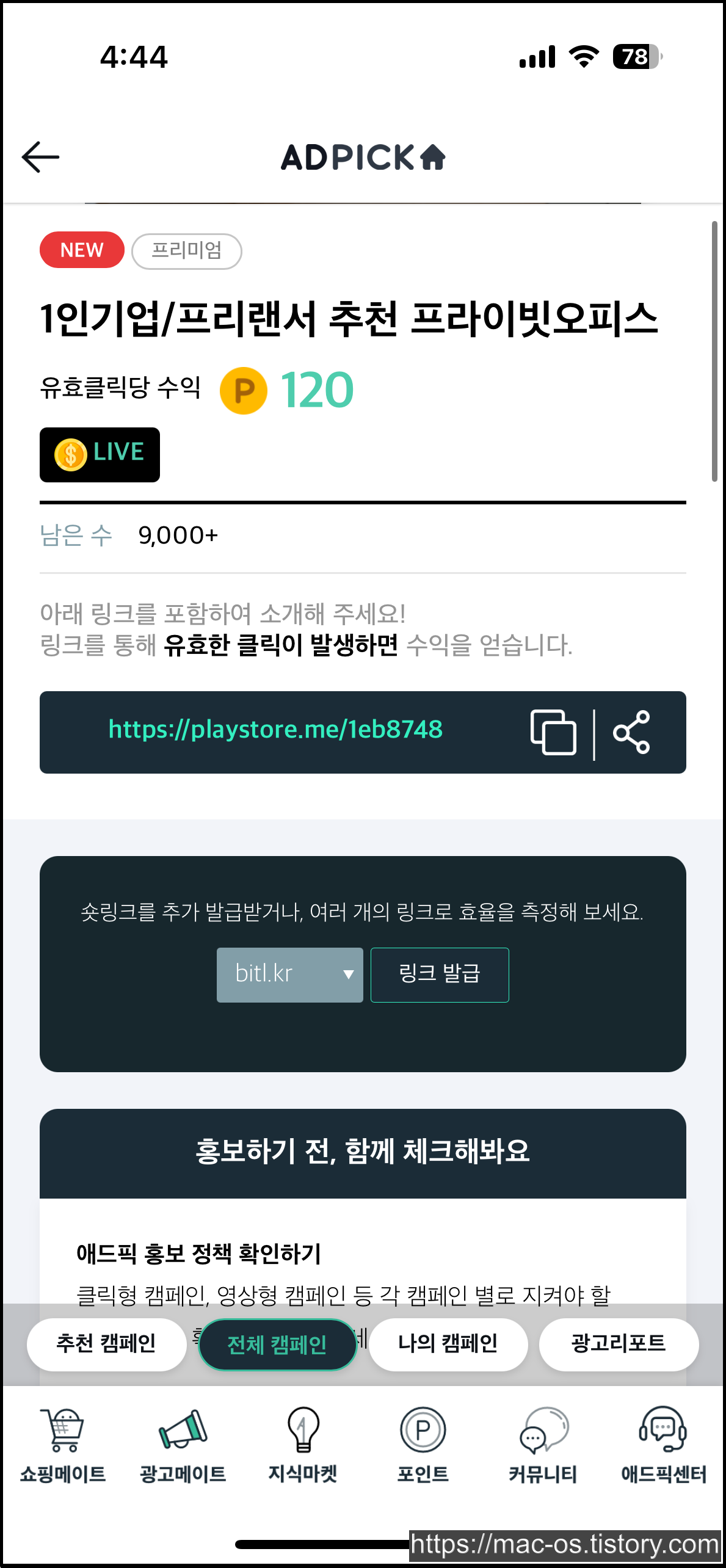쇼핑메이트와 다르게 광고메이트는 URL에서 상품을 구매하는 것보다 진입장벽이 낮습니다. 클릭형과 참여형이 주를 이루는데, 클릭형의 경우 URL을 클릭하는 것만으로도 내가 포인트를 적립할 수 있다는 것이 큰 장점입니다. 참여형은 앱 설치나 모바일 게임 사전예약 이런 것으로 유도해야 되서 좀 어렵긴 하죠.