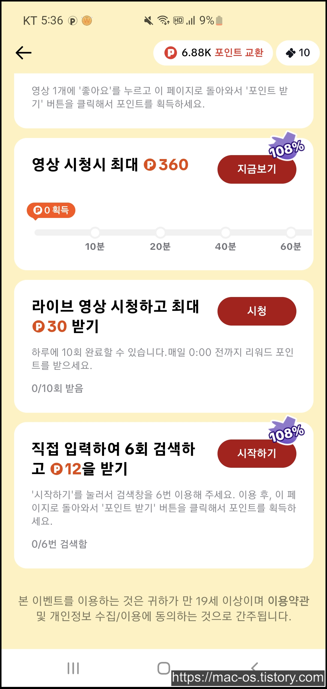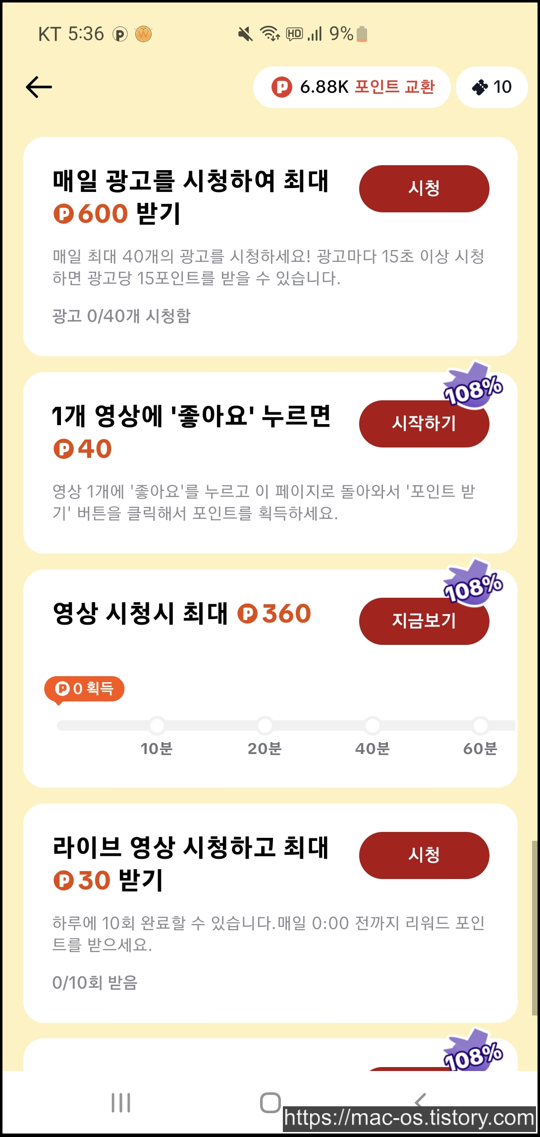 매일 광고 시청하여 최대 600원, 1개 영상에 좋아요 누르면 40원, 영상 시청 시 최대 360원, 라이브 영상 시청하고 최대 30원, 직접 입력하여 6회 검색하고 12원 등 다양한 미션이 있습니다. 이 일일미션 포인트는 사람마다 달라서 신규/복귀 유저의 보상이 기존 유저보다 더 좋은 경우가 많다고 하네요. 예를 들면 신규 유저는 일일 미션을 하면 2000원 정도를 주는데 기존 유저는 800원 이정도로 주고 말이죠.